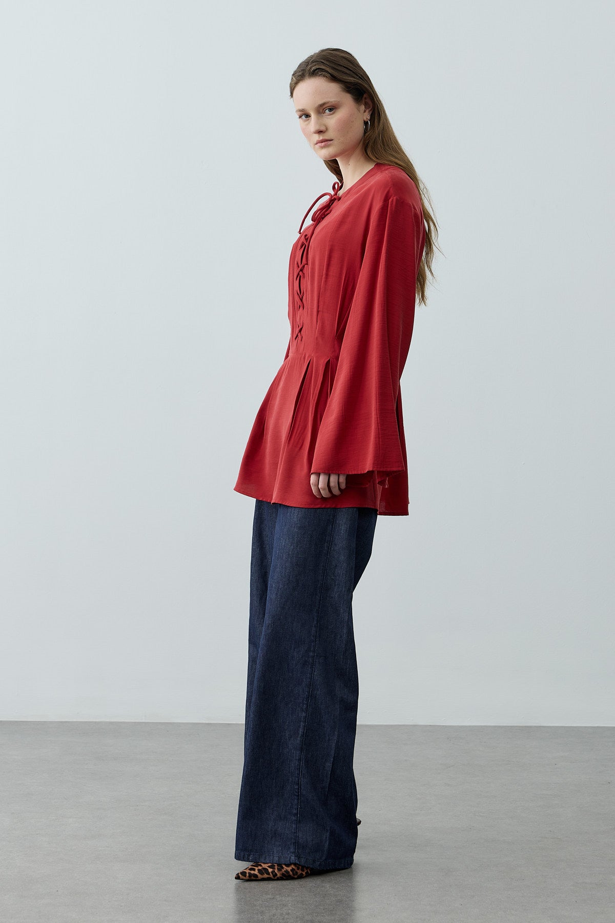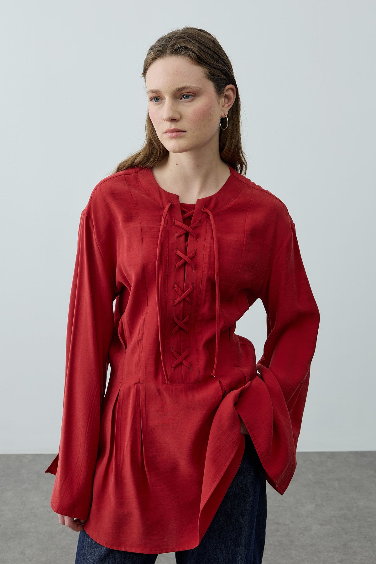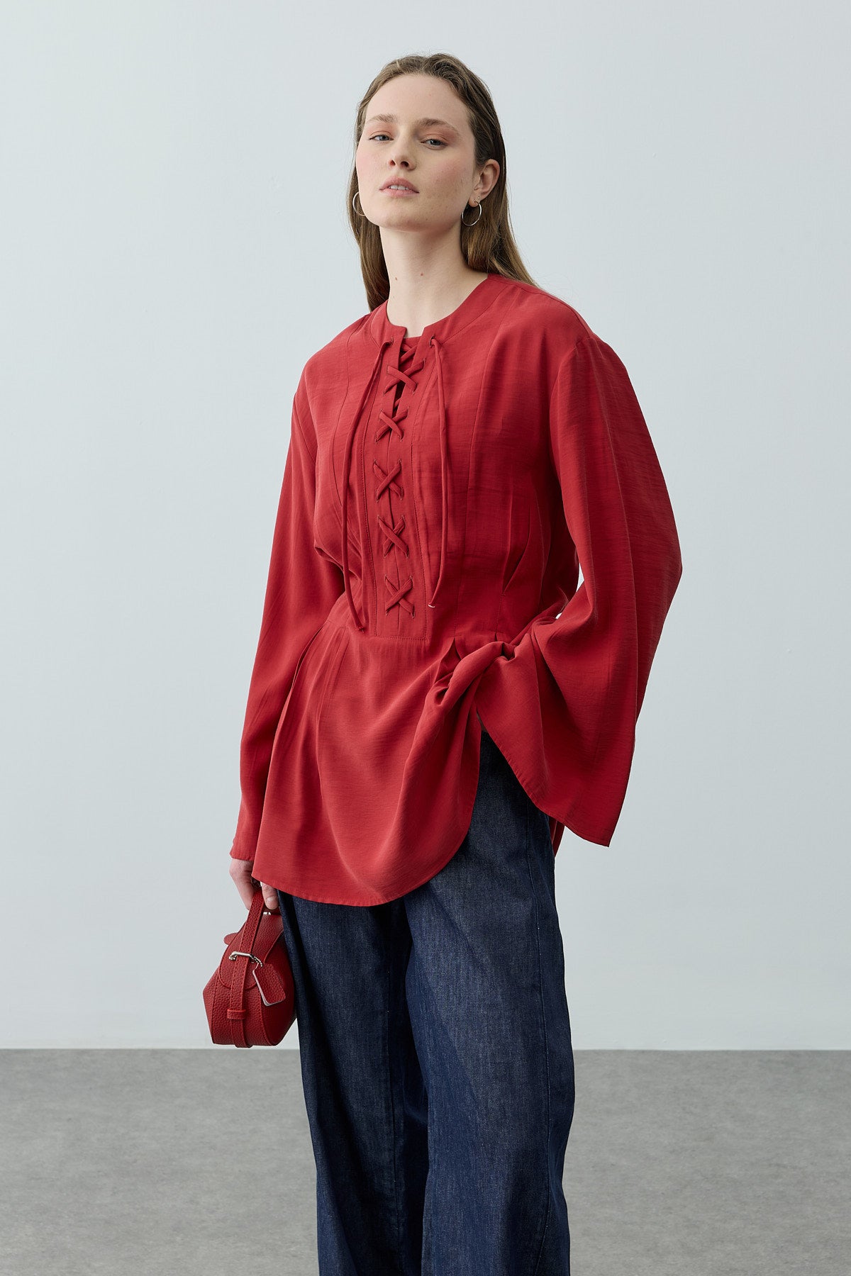 قميص مصنوع من قماش منسوج مرن، يتميز بتصميم رباطات أمامية وأكمام طويلة وعريضة.