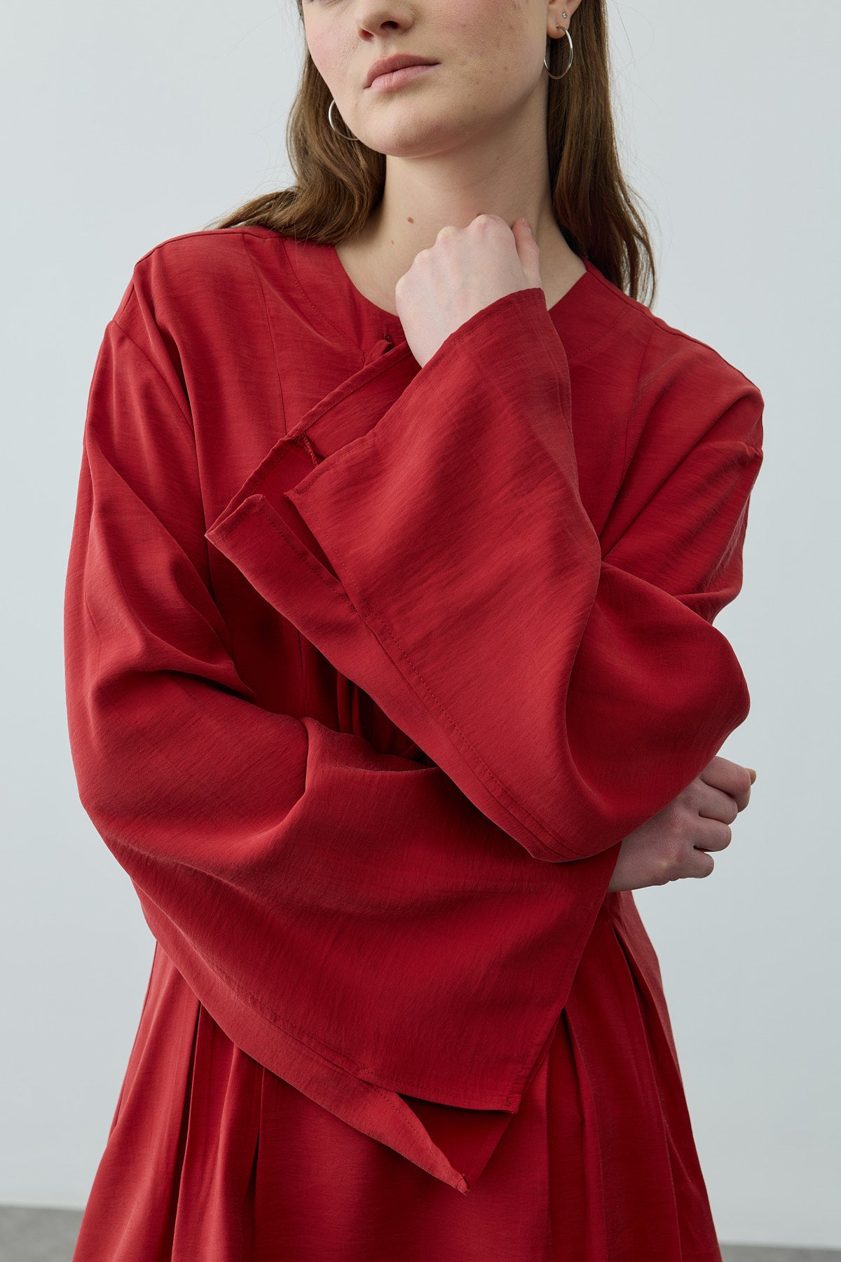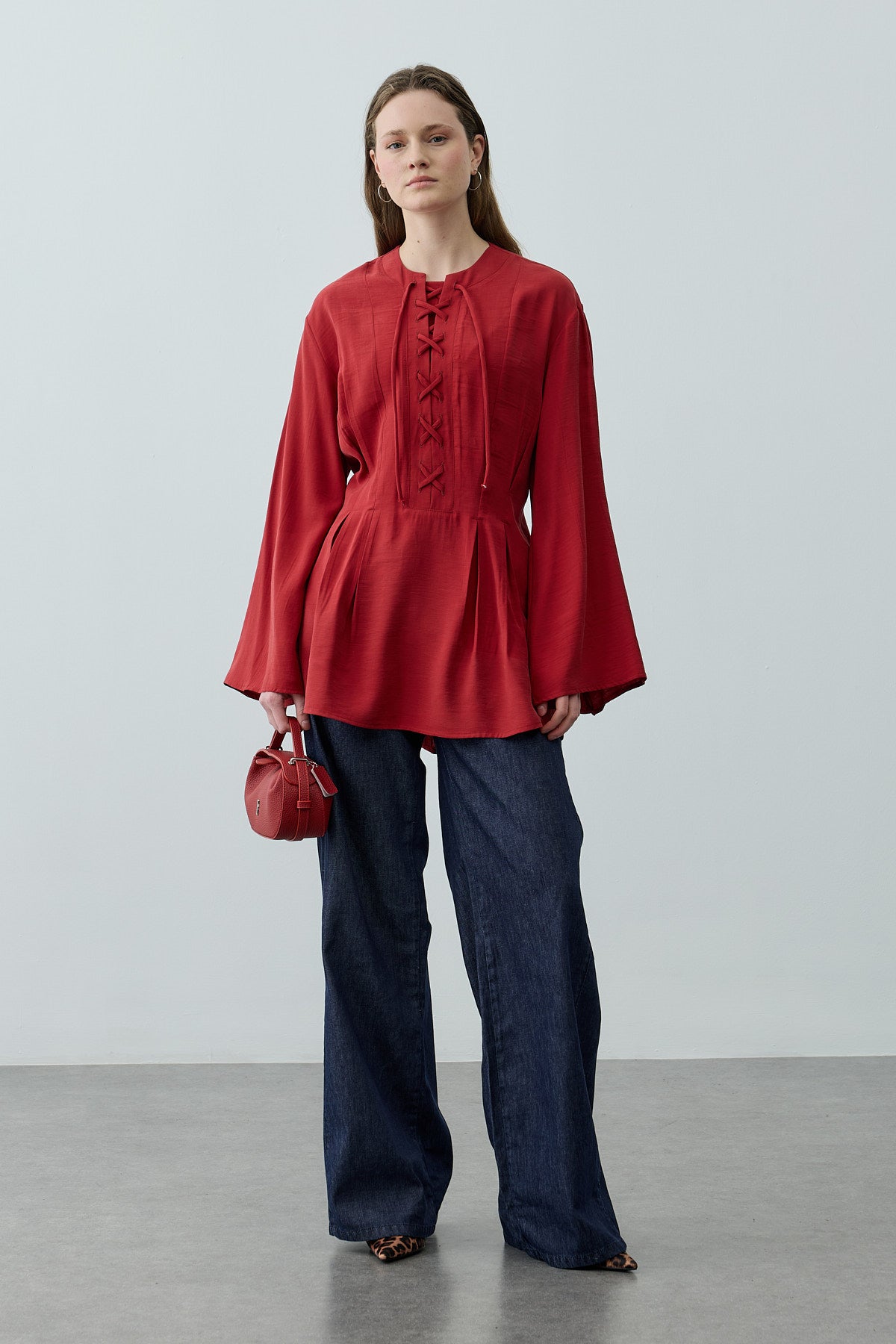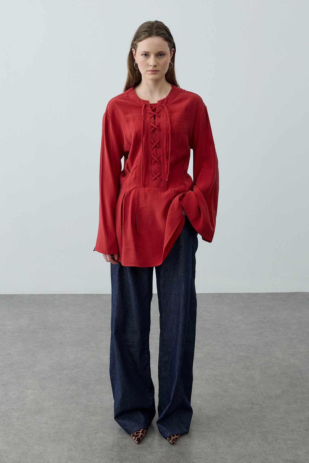 قميص مصنوع من قماش منسوج مرن، يتميز بتصميم رباطات أمامية وأكمام طويلة وعريضة.