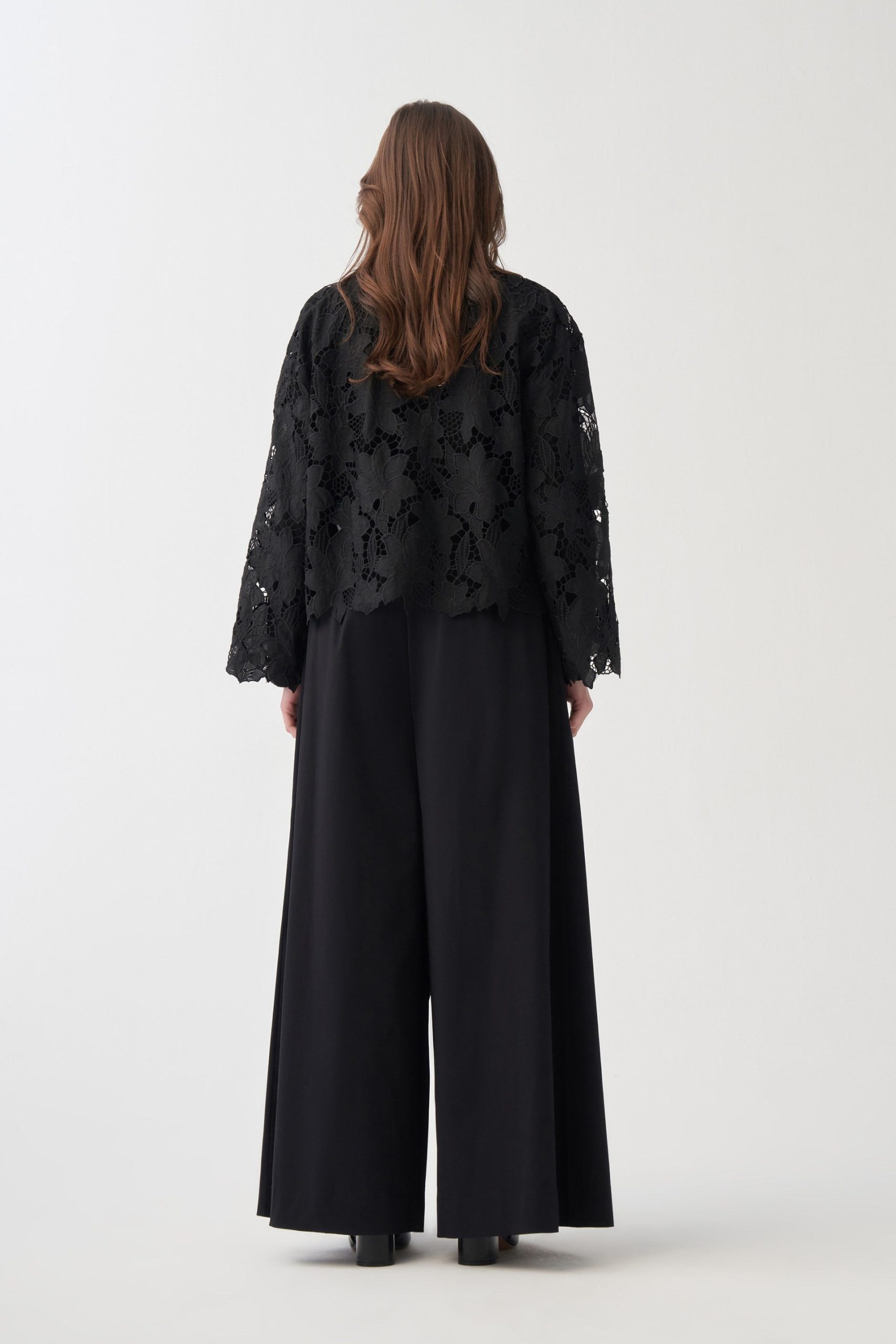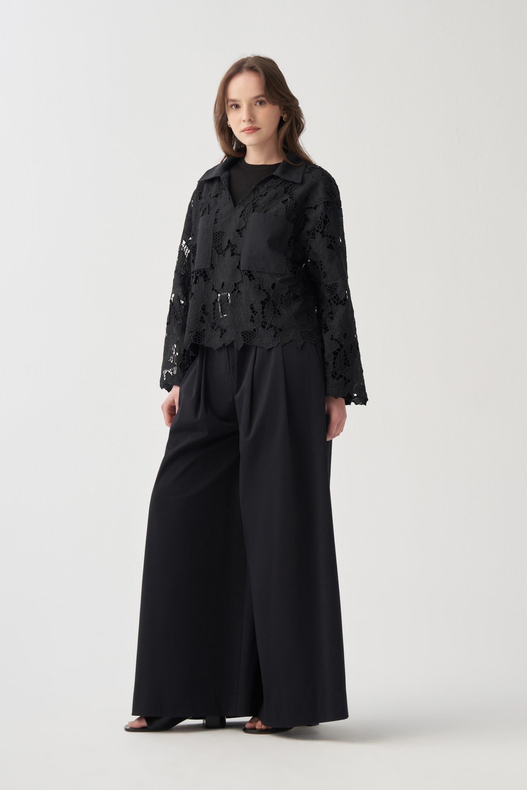بلوزة سوداء طويلة الأكمام بحرف V