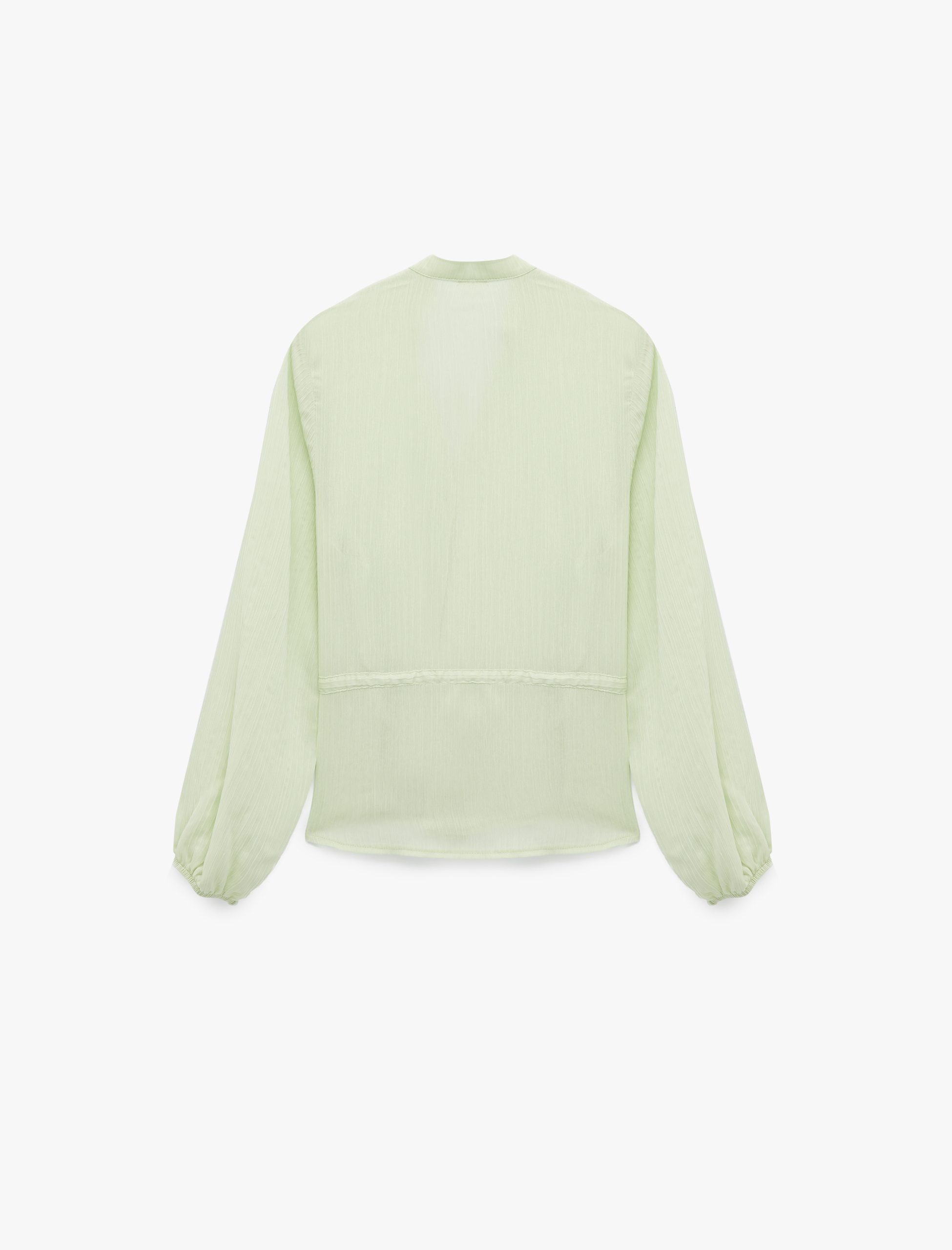 بلوزة شيفون بطوق حاكم وأكمام بالون طويلة ورباط عند الخصر