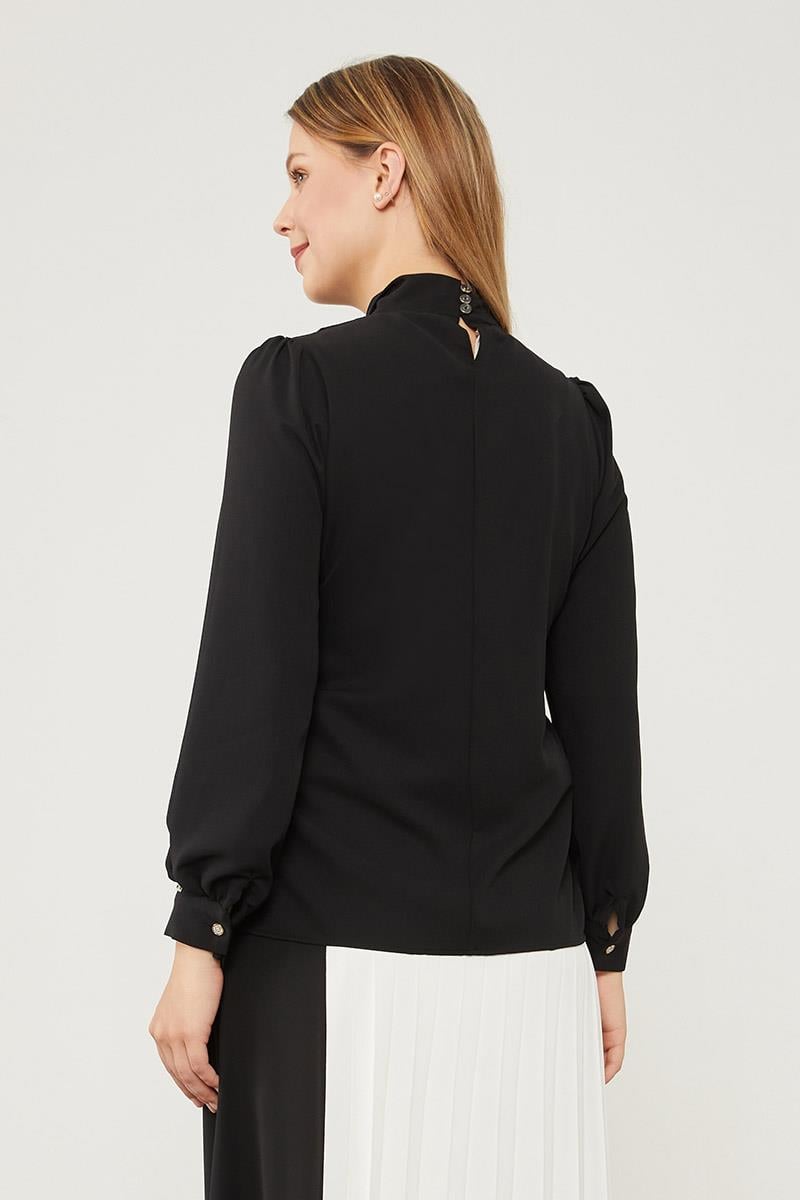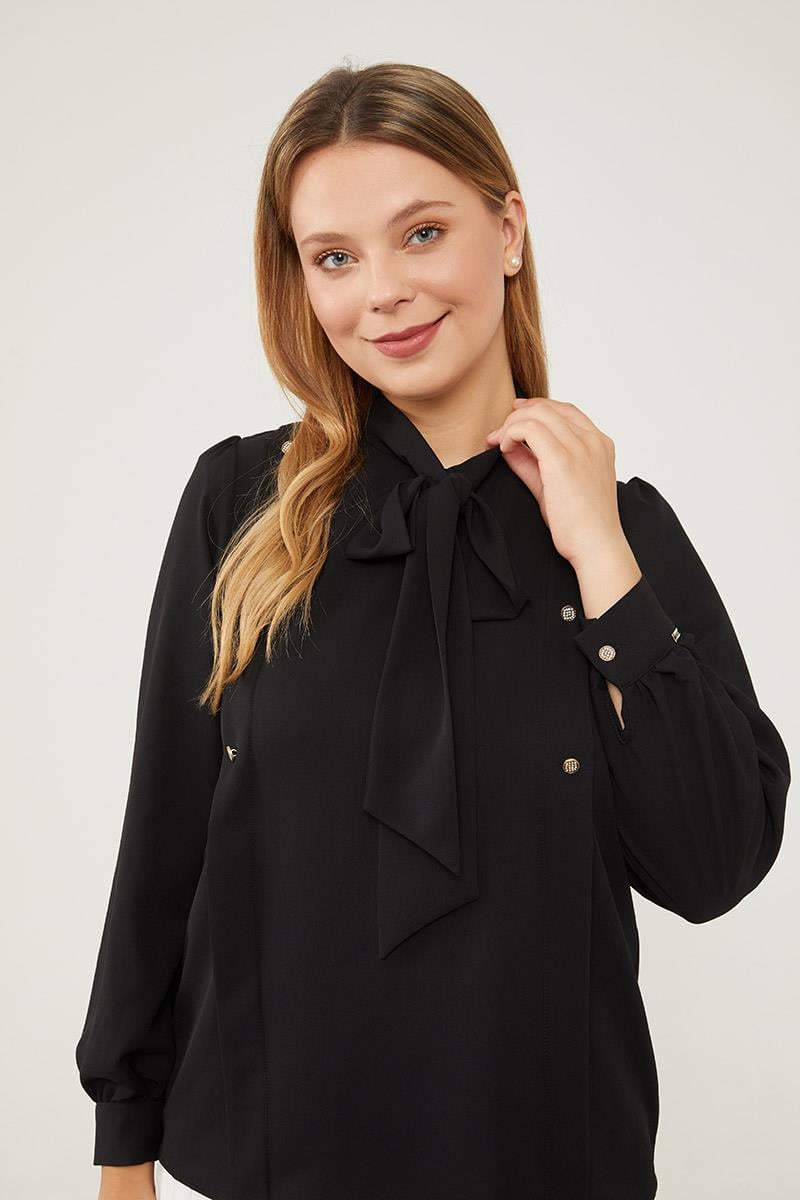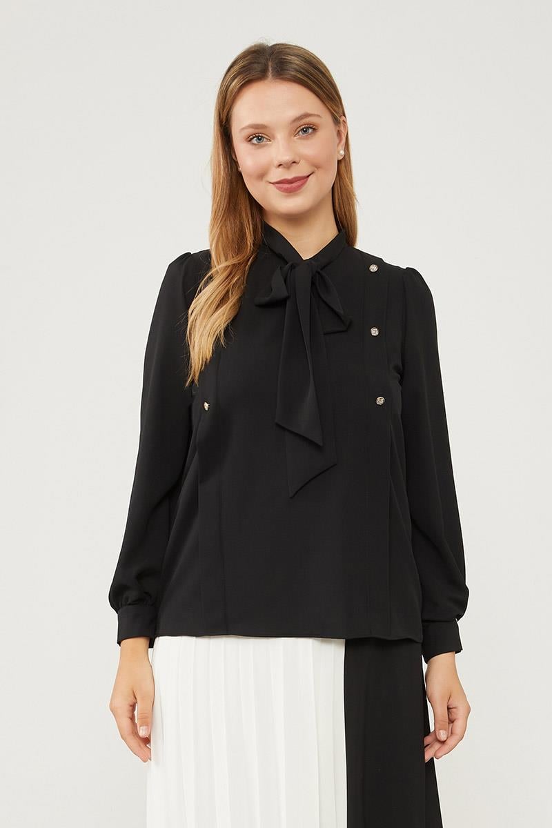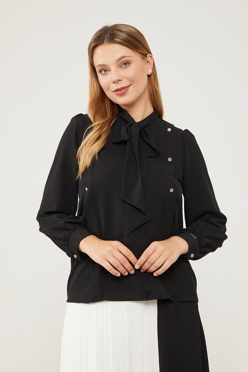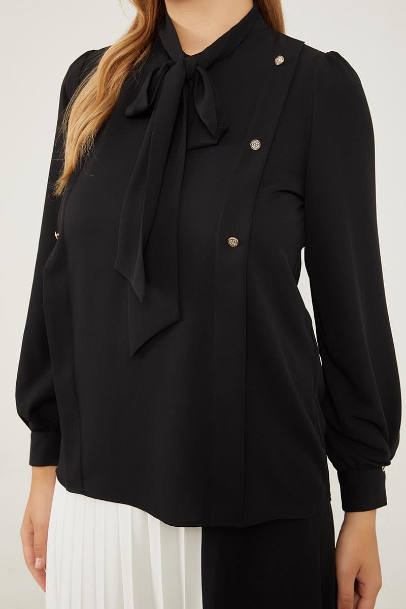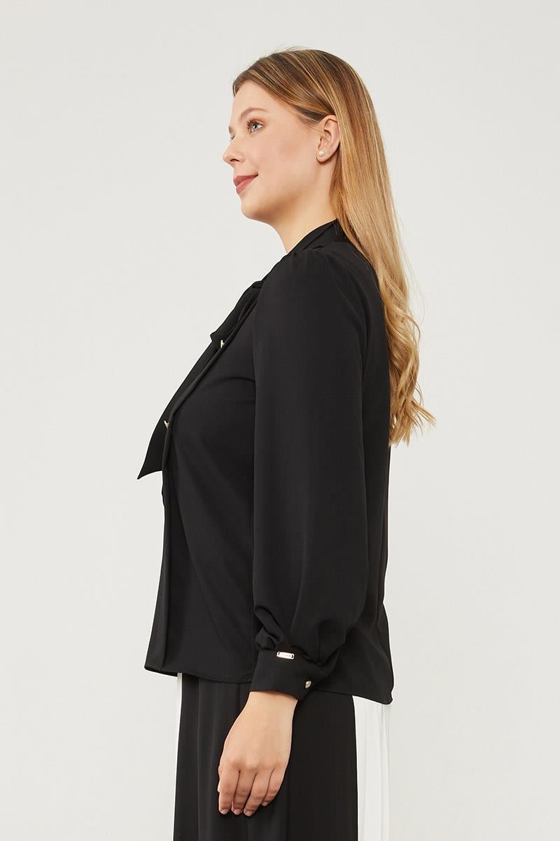 بلوزة شيفون سوداء ذات ربط عنق قابل للربط
