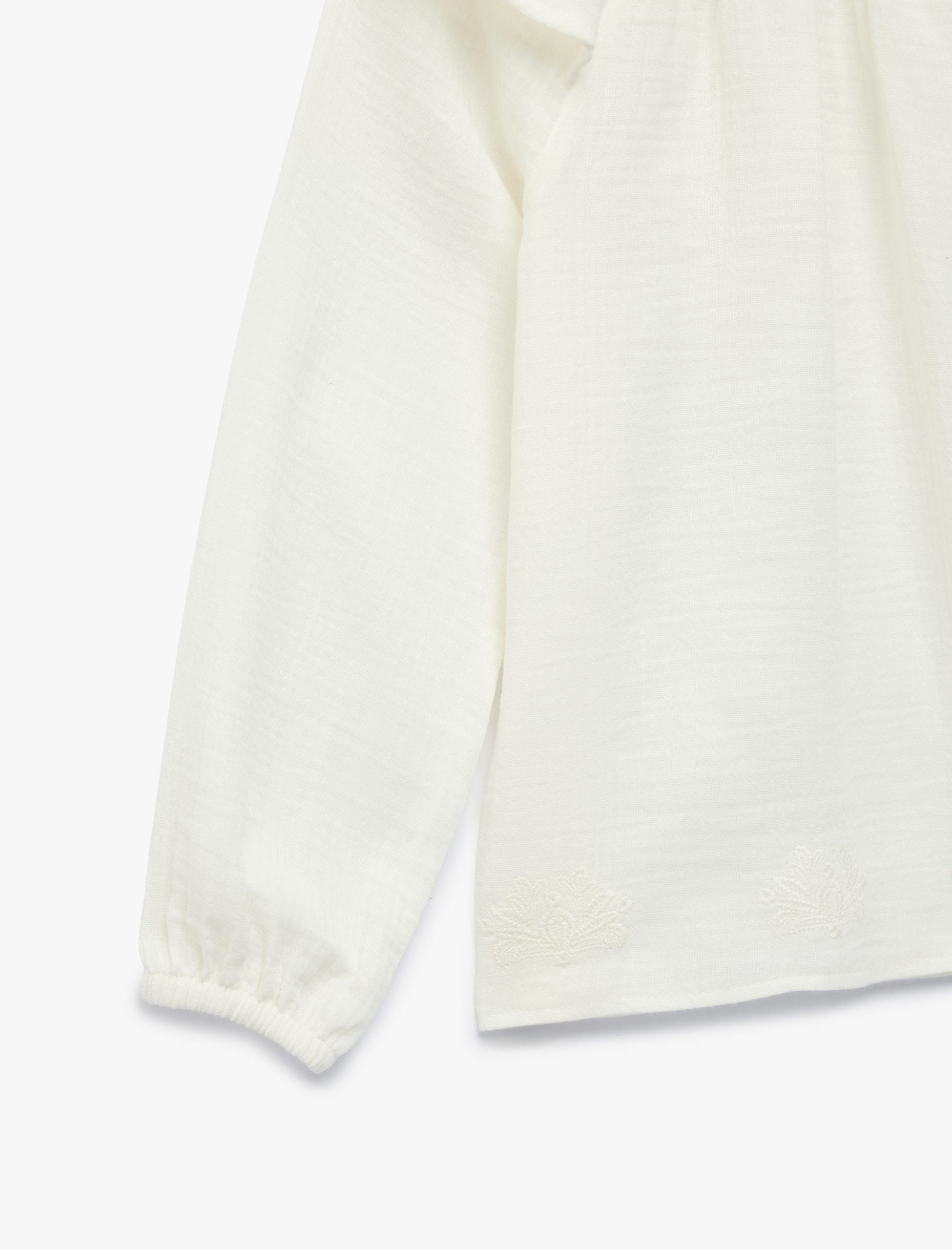 بلوزة قطنية للفتيات بأكمام طويلة وتفاصيل كشكشة ورقبة قارب