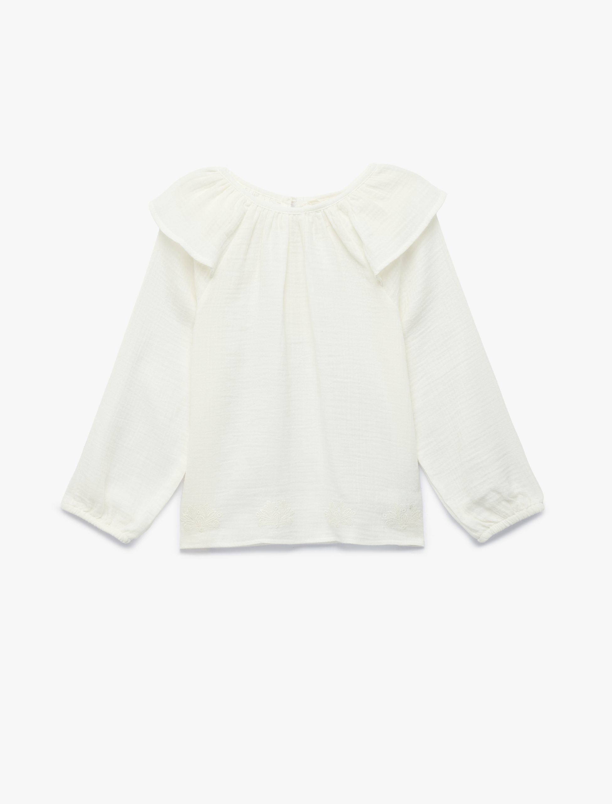 تضيف هذه البلوزة القطنية لمسة أنيقة إلى خزانة ملابس طفلتك. نسيجها القطني يضمن الراحة طوال اليوم. الأكمام الطويلة المنفوخة والرقبة العريضة على شكل قارب تمنح مظهرًا أنيقًا، بينما تضيف تفاصيل الكشكشة حركة للتصميم. هذه البلوزة القطنية قطعة متعددة الاستخدامات مناسبة للصغيرات في كل المواسم.