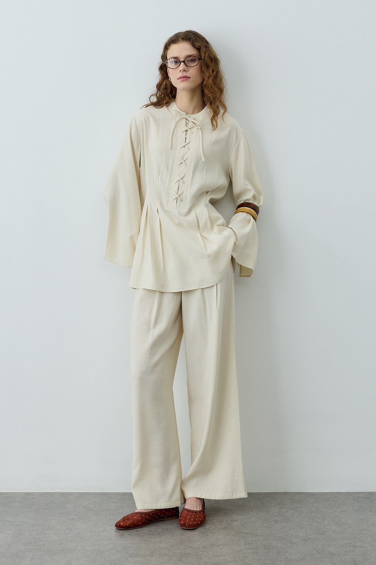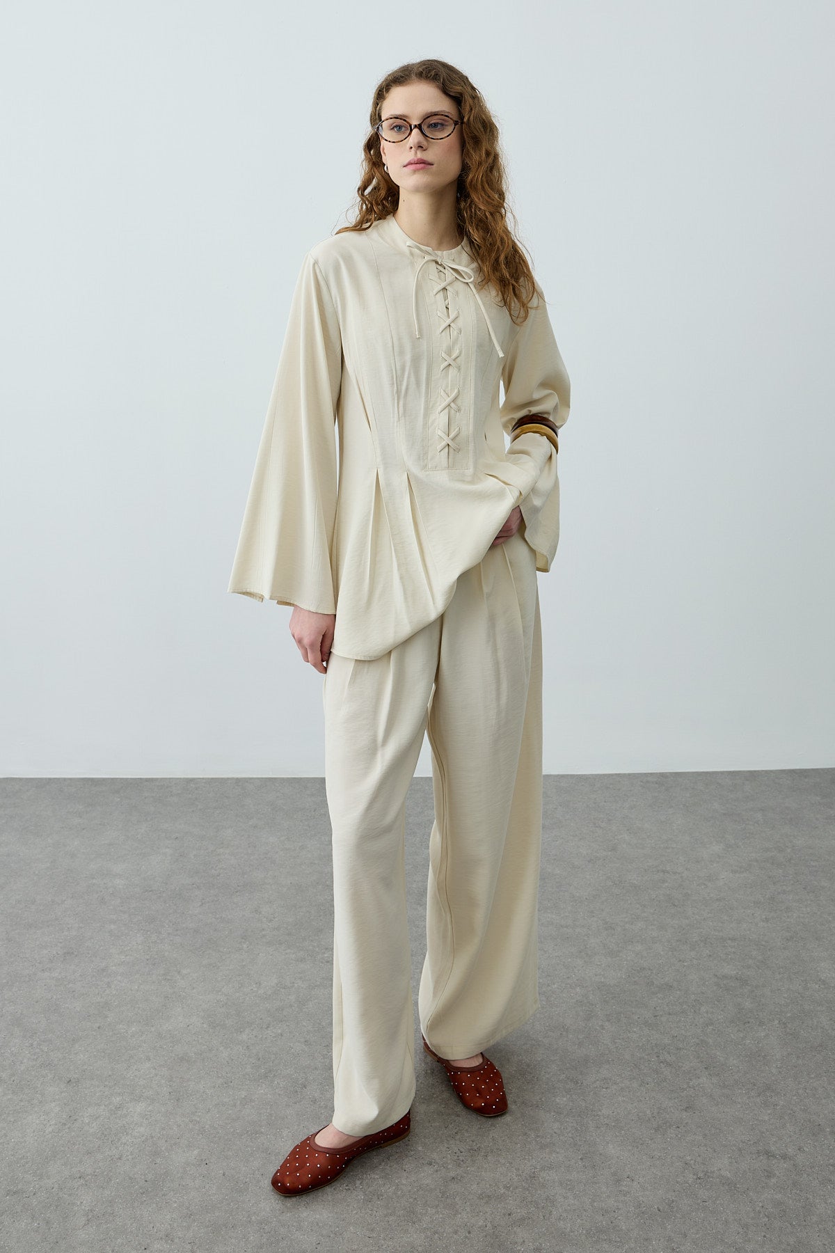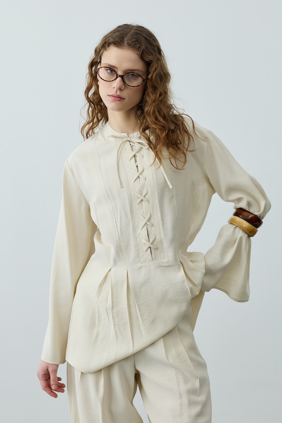 بلوزة كريمية بتفاصيل ربط بالرباط