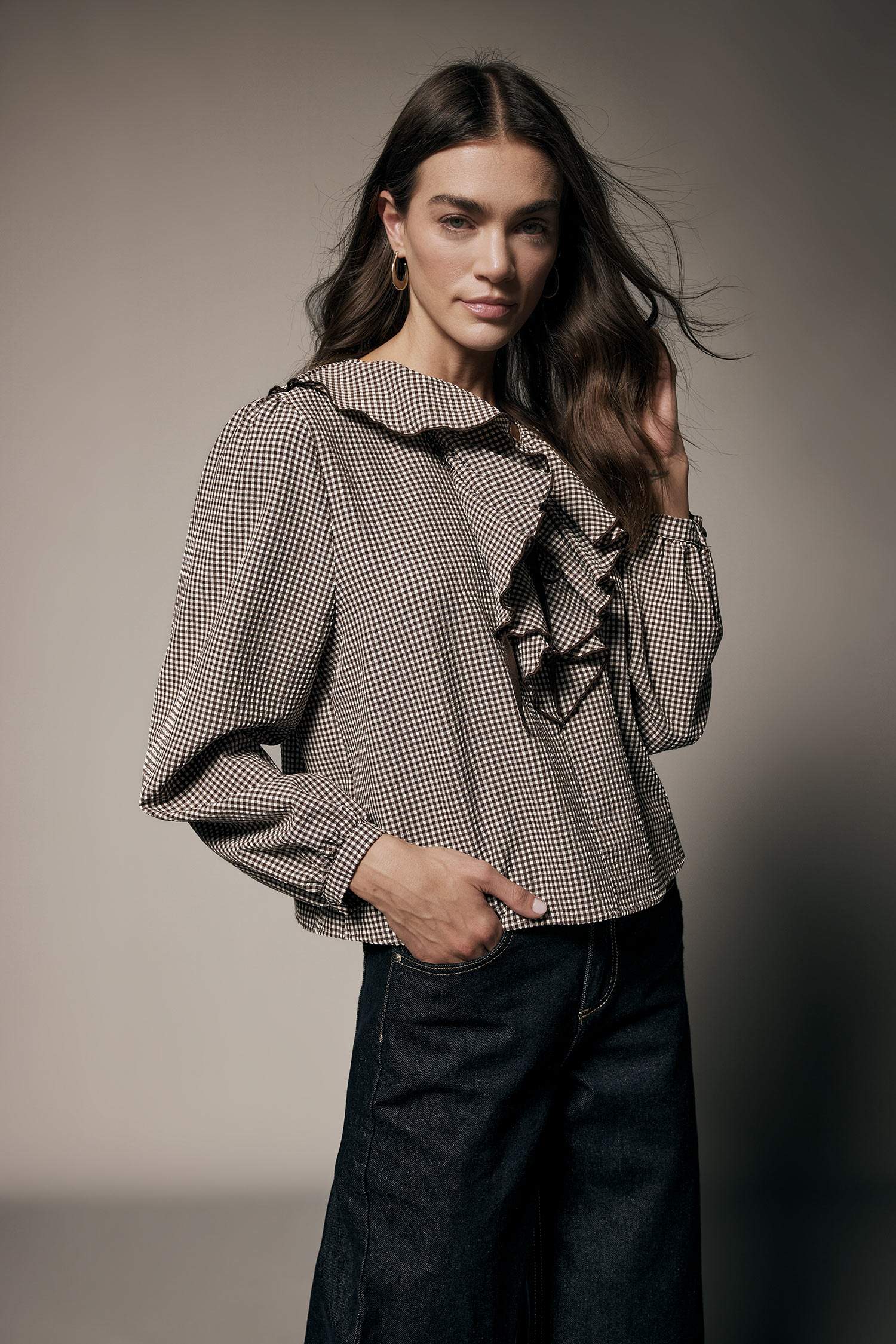 العلامات: brown check pleated blouse, brown women check pleated blouse, check pleated blouse, women check pleated blouse
