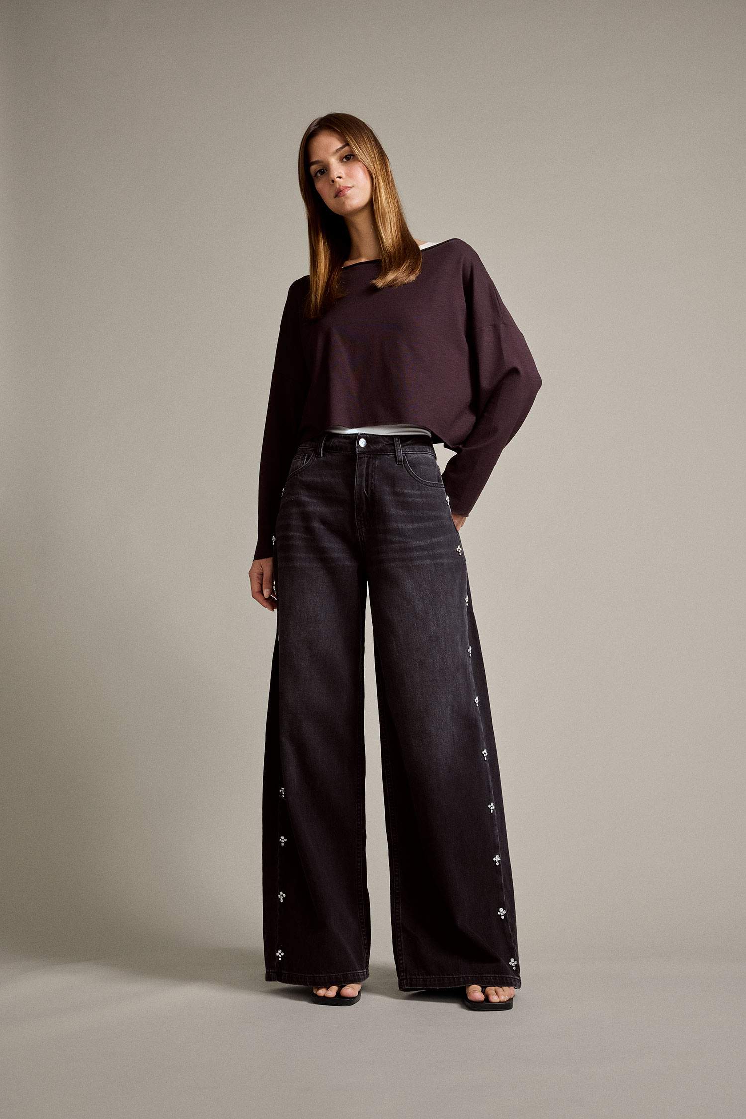 بنطلون أسود واسع الأرجل بتفاصيل إكسسوارات P-0260