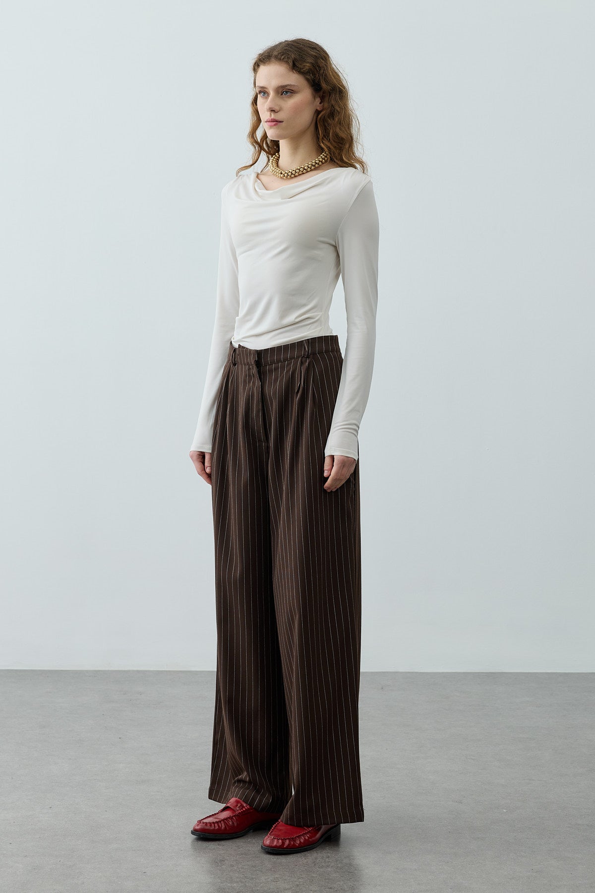 بنطلون بالازو أنيق مصنوع من قماش منسوج مخطط بتدبيس ناعم، مزود بطيات في الأمام، وجيوب، وإغلاق بسحاب وزر.