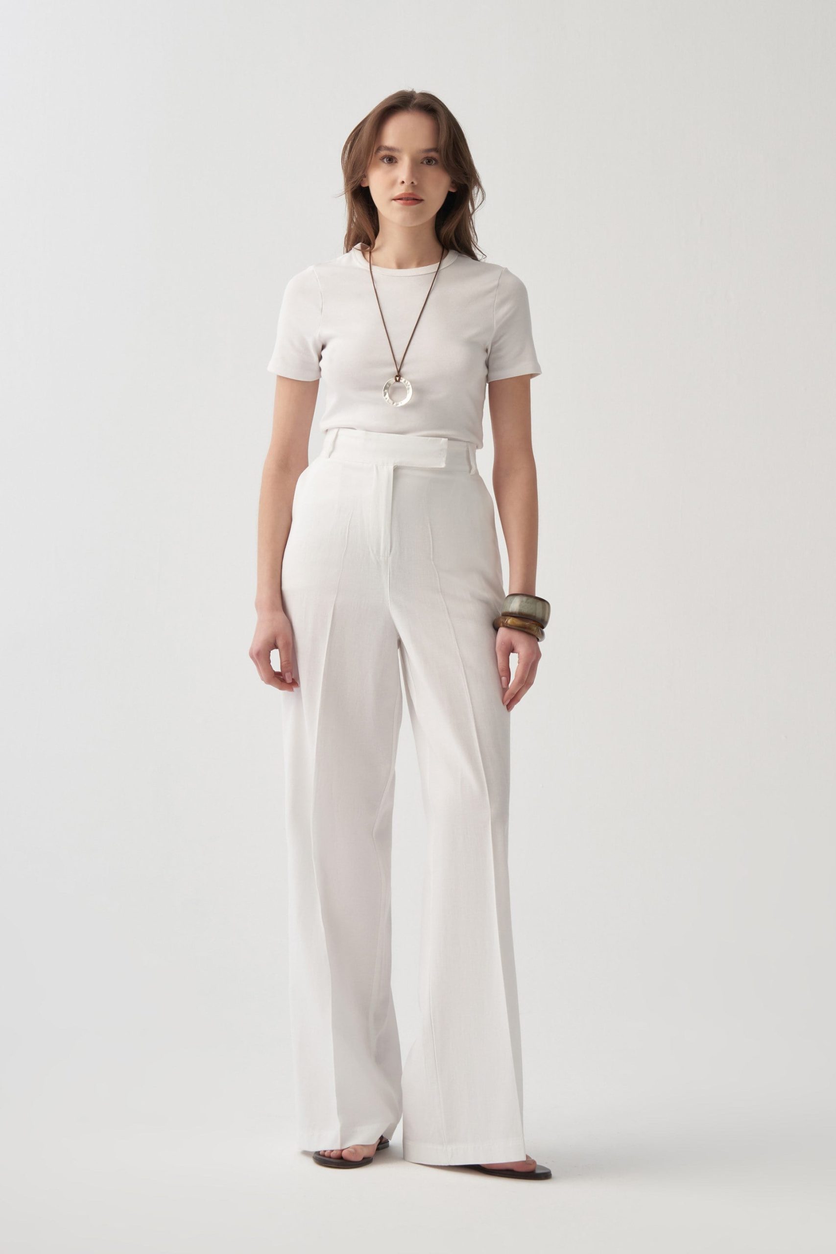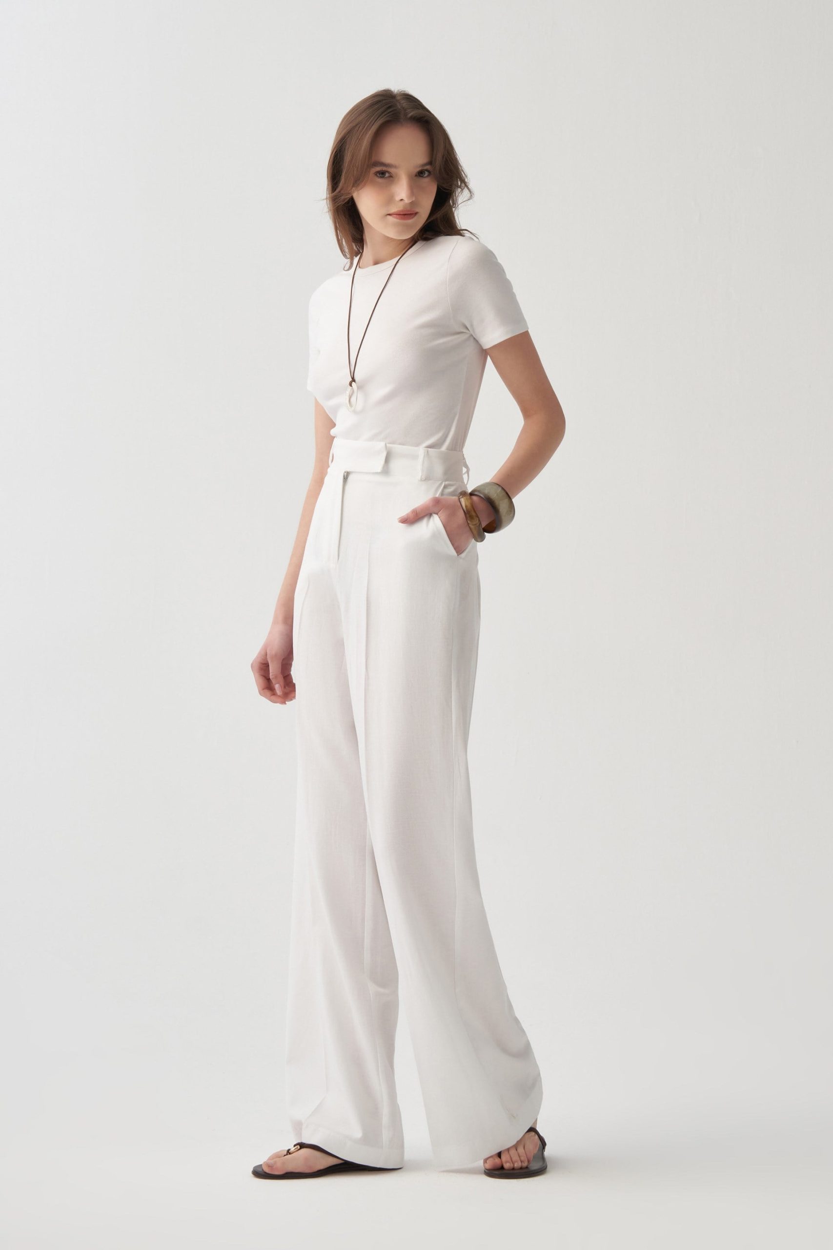 احصل على مظهر أنيق مع بنطلون بالازو الكتان الأبيض المصمم خصيصًا لمن يبحثون عن الأناقة في التفاصيل. تصميم مثالي للتركيبات اليومية والمناسبات الخاصة.