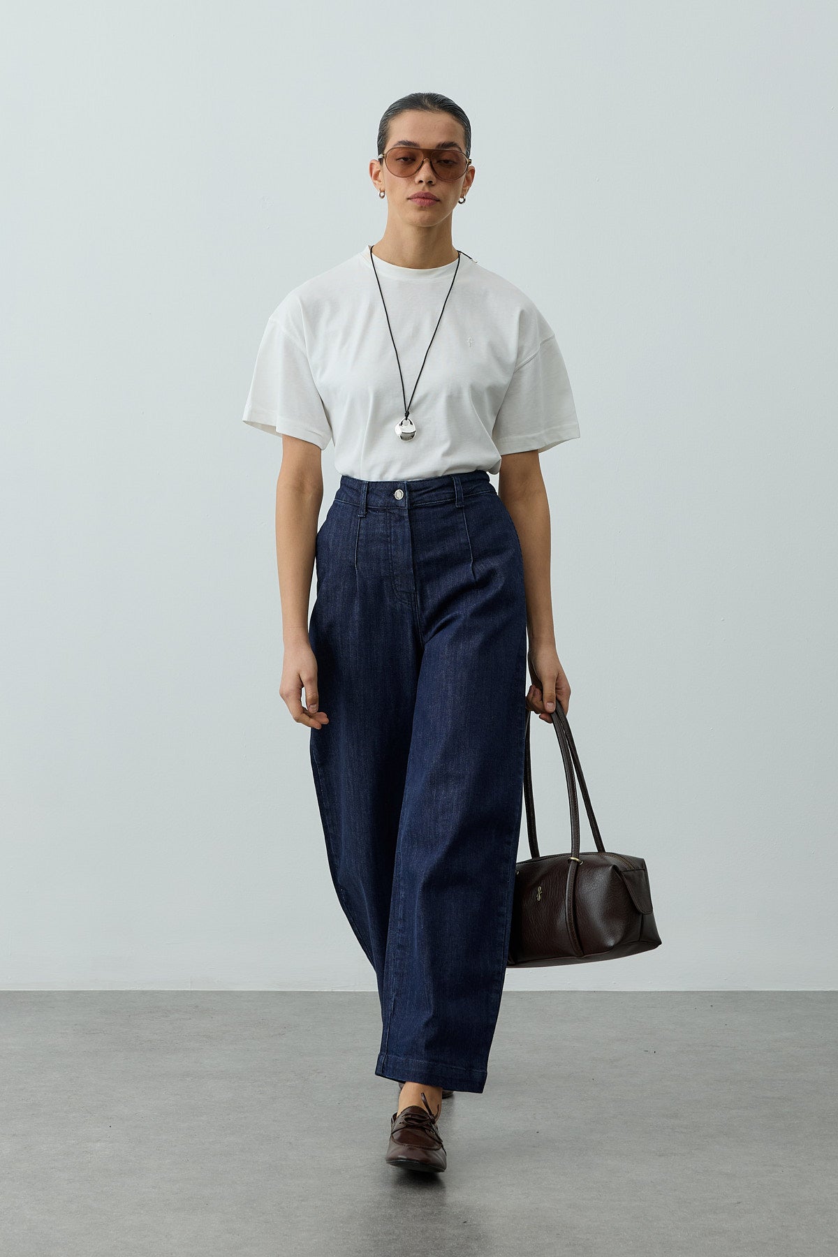 بنطلون جينز بالوني مصنوع من قماش الدنيم المنسوج، مزود بجيوب، تفاصيل مطوية، وتصميم عالي الخصر.