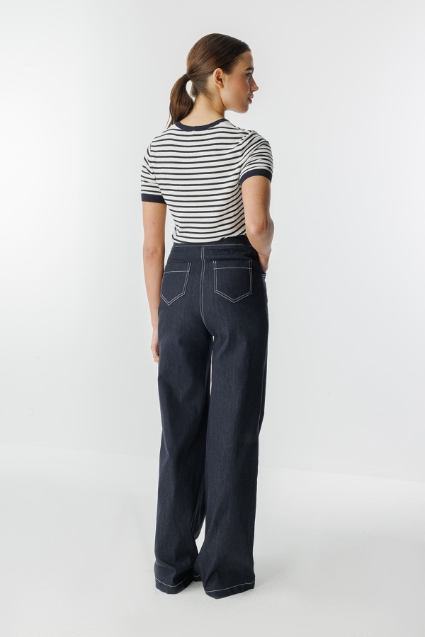 بنطلون جينز كحلي عريض الأرجل بتفاصيل خياطة مزدوجة
