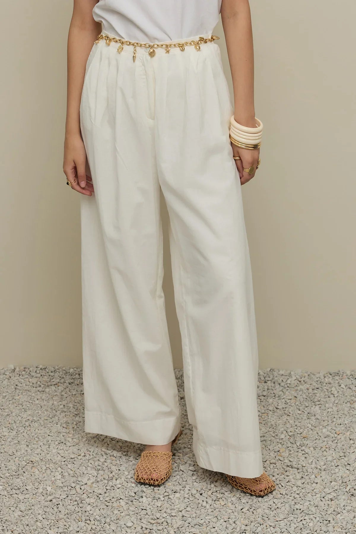 بنطلون واسع الأرجل بحزام – بيج