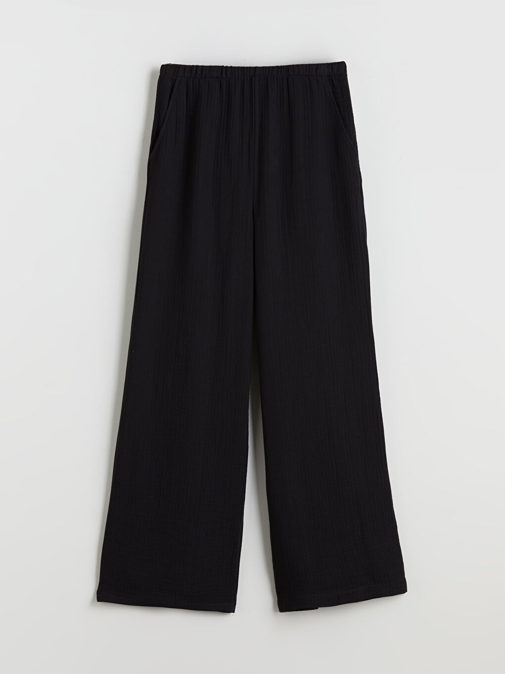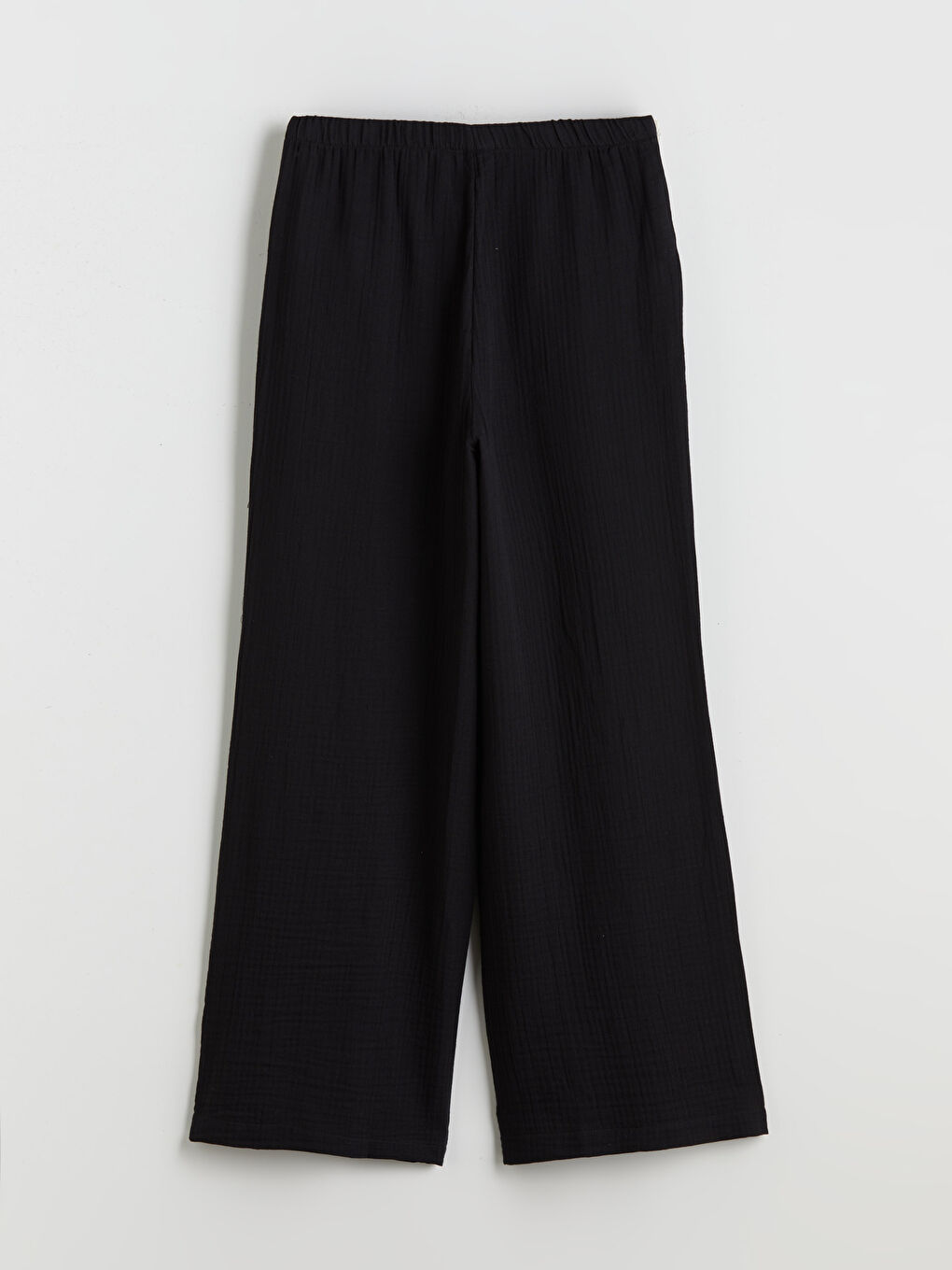 العلامات: wide leg, بنطلون أسود, بنطلون نسائي, خصر مطاطي, قصة واسعة, قطن, قماش موسلين, ملمس مميز
