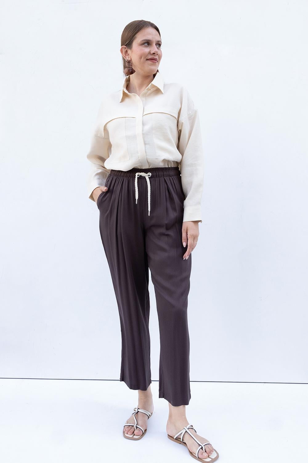 بنطلون واسع الساق بخصر مطاطي بلون القهوة