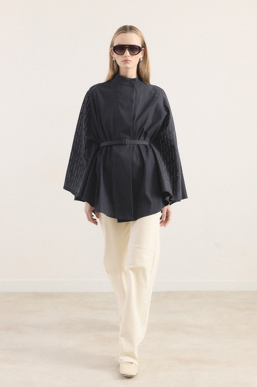 يتميز هذا البونشو بقوام الجينز العصري وتفاصيله الجذابة، مما يضيف لمسة جريئة إلى أسلوبك. تمنح تفاصيل التزيين بالحجارة المنتج مظهراً لامعاً، بينما يؤكد الحزام المطلي خط الخصر لخلق صورة ظلية أنيقة. تبرز تفاصيل الزر المطلي عند الياقة كعنصر مكمل للتصميم. يمكن تفضيله بسهولة لكل من التركيبات اليومية وتجارب الأناقة الخاصة.