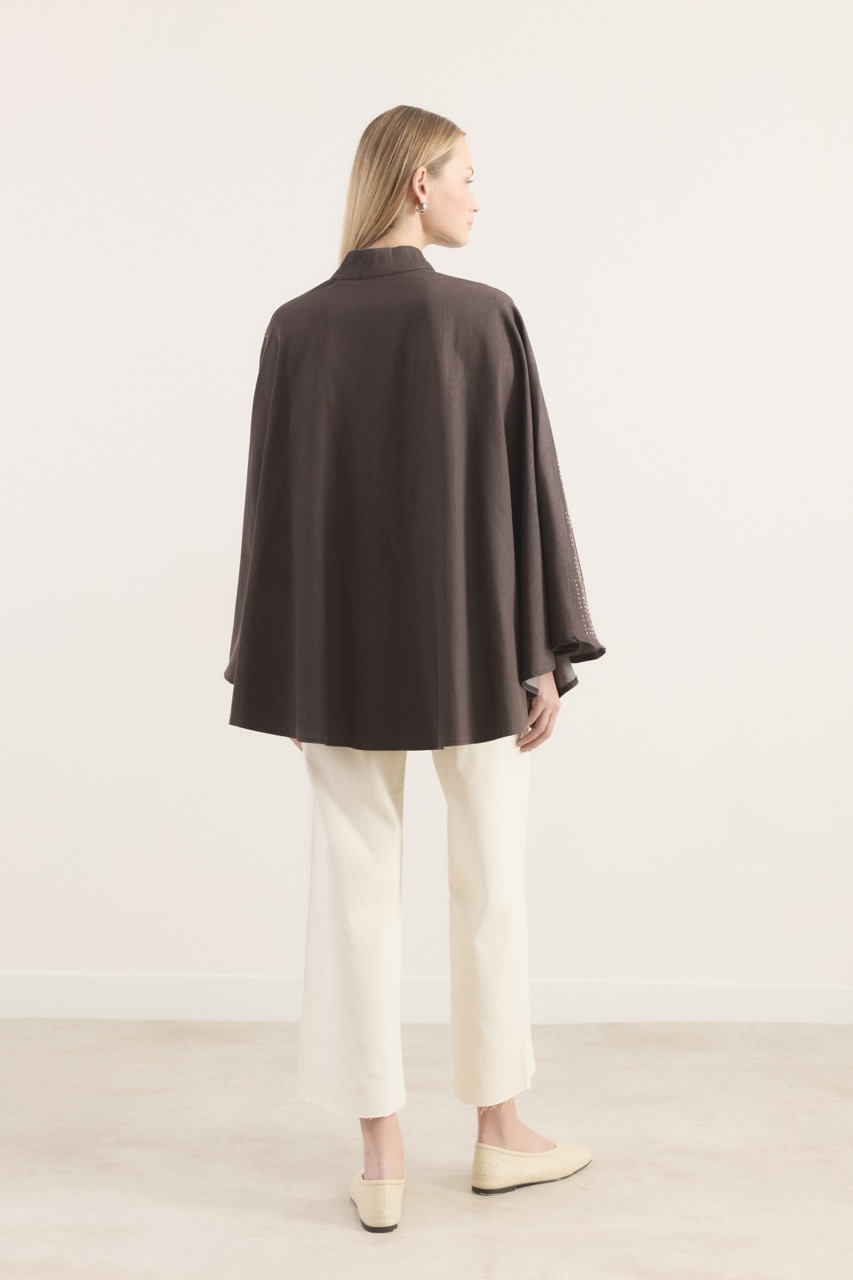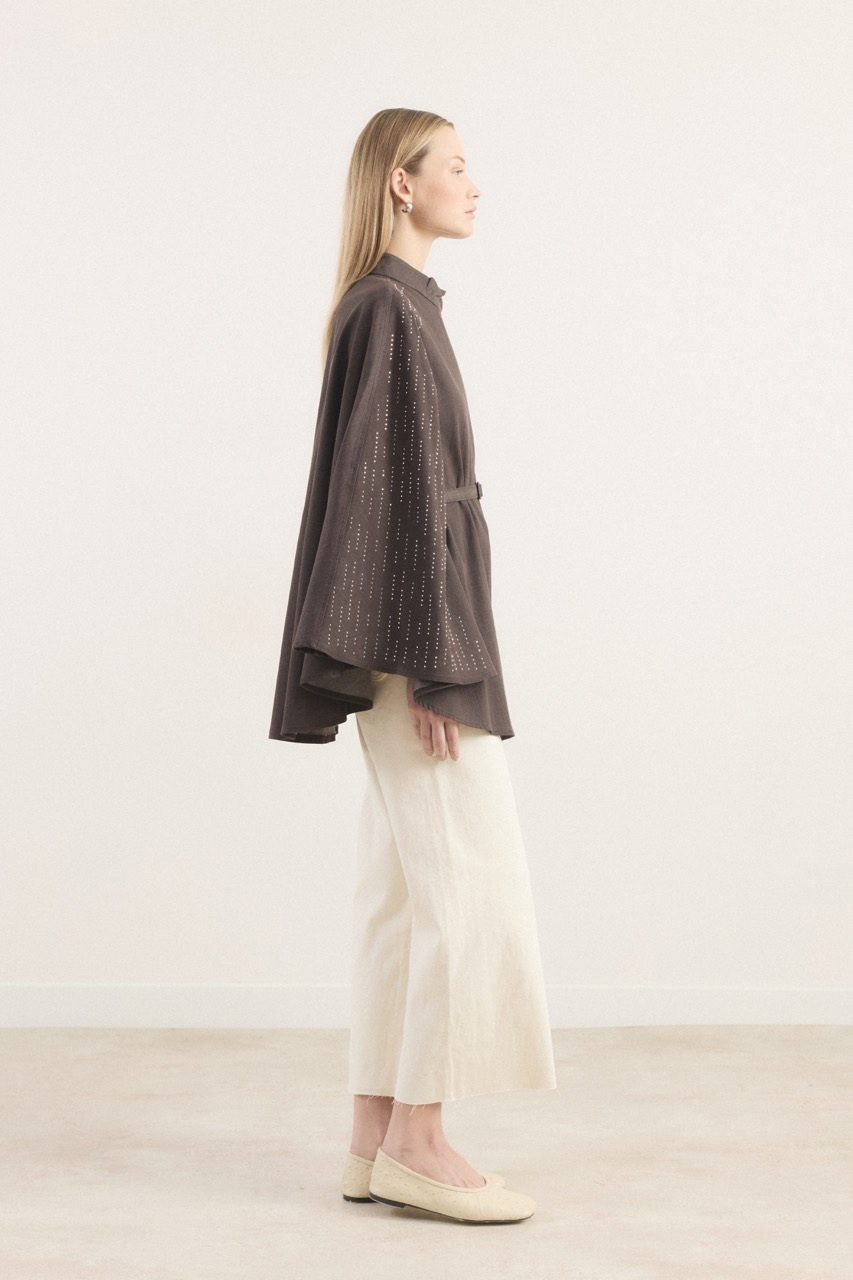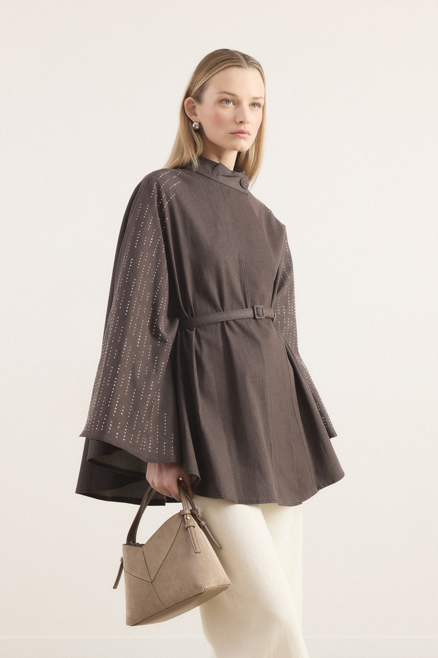 يضيف هذا البونشو، الذي يتميز بنسيج الجينز العصري والتفاصيل الجذابة، لمسة جريئة إلى إطلالتك. تمنح الزخارف الحجرية المنتج مظهرًا لامعًا، بينما يبرز الحزام المطلي خط الخصر لخلق صورة ظلية أنيقة. تبرز تفاصيل الزر المطلي عند الياقة كعنصر تصميمي مكمل. يمكن اختياره بكل راحة لكل من الملابس اليومية وتجارب الأناقة الخاصة.