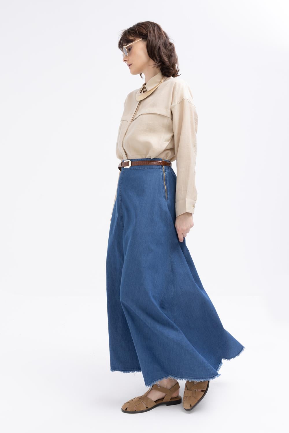 تنورة طويلة من الجلد المدبوغ بسحاب مخفي من الجانب، بدون بطانة، لا تظهر التفاصيل الداخلية.
