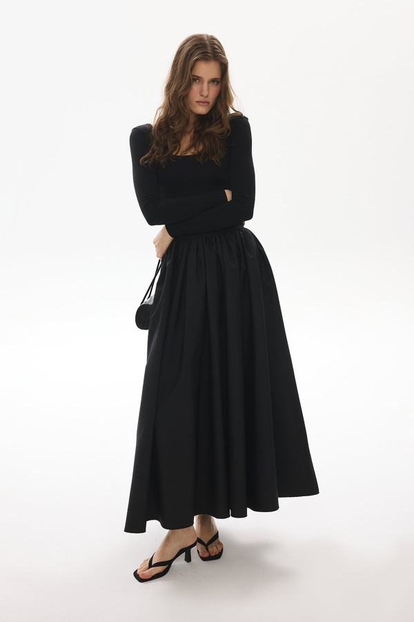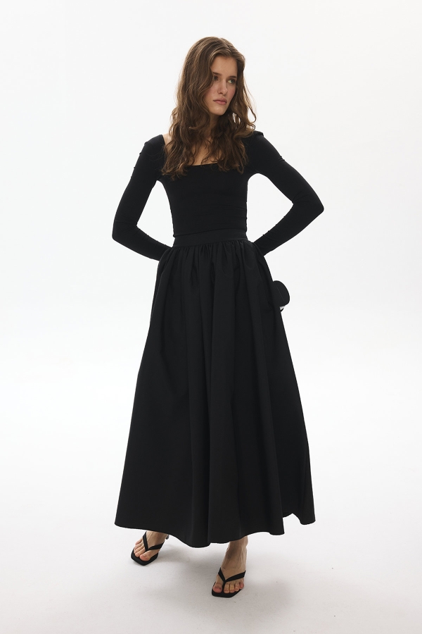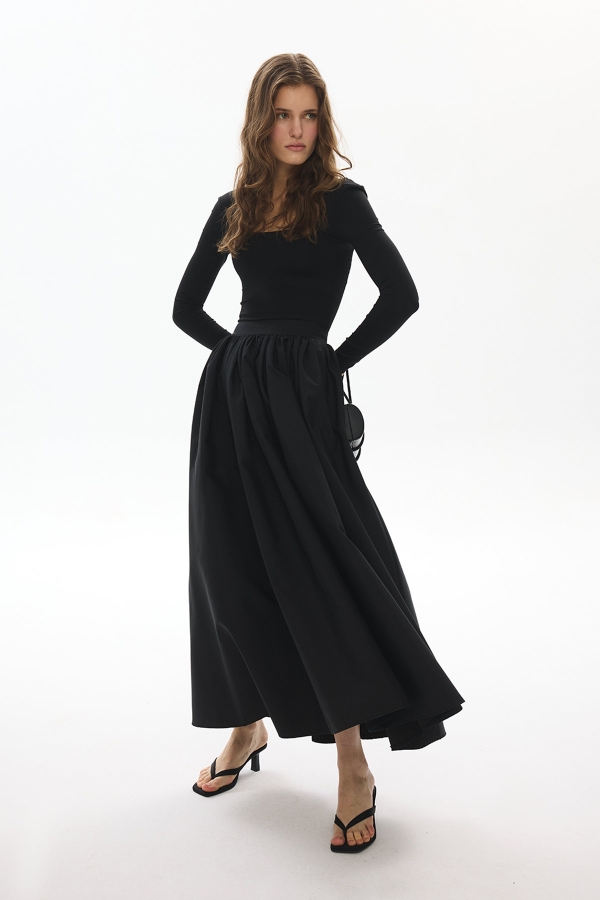 تنورة بالون منتصف الخصر، مكشكشة، بسحاب خلفي مخفي، ذات جيوب جانبية، مصنوعة من قماش متميز مجعد وحجمي لا يظهر ما تحته، بدون بطانة.