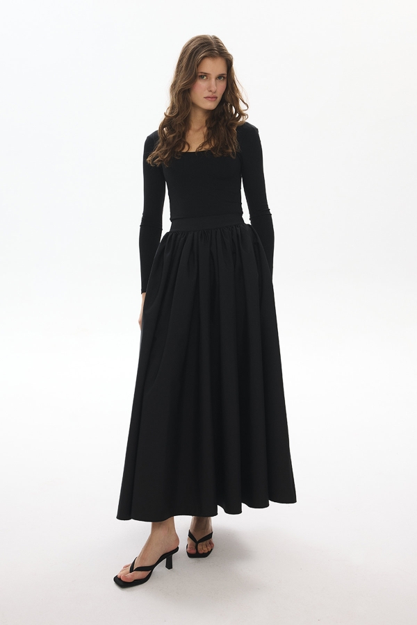 تنورة بالون ذات وسط متوسط، ومطوية، وسحاب خفي من الخلف، وجيوب جانبية، مصنوعة من قماش ممتاز متماسك الحجم لا يظهر ما بداخله وبدون بطانة.