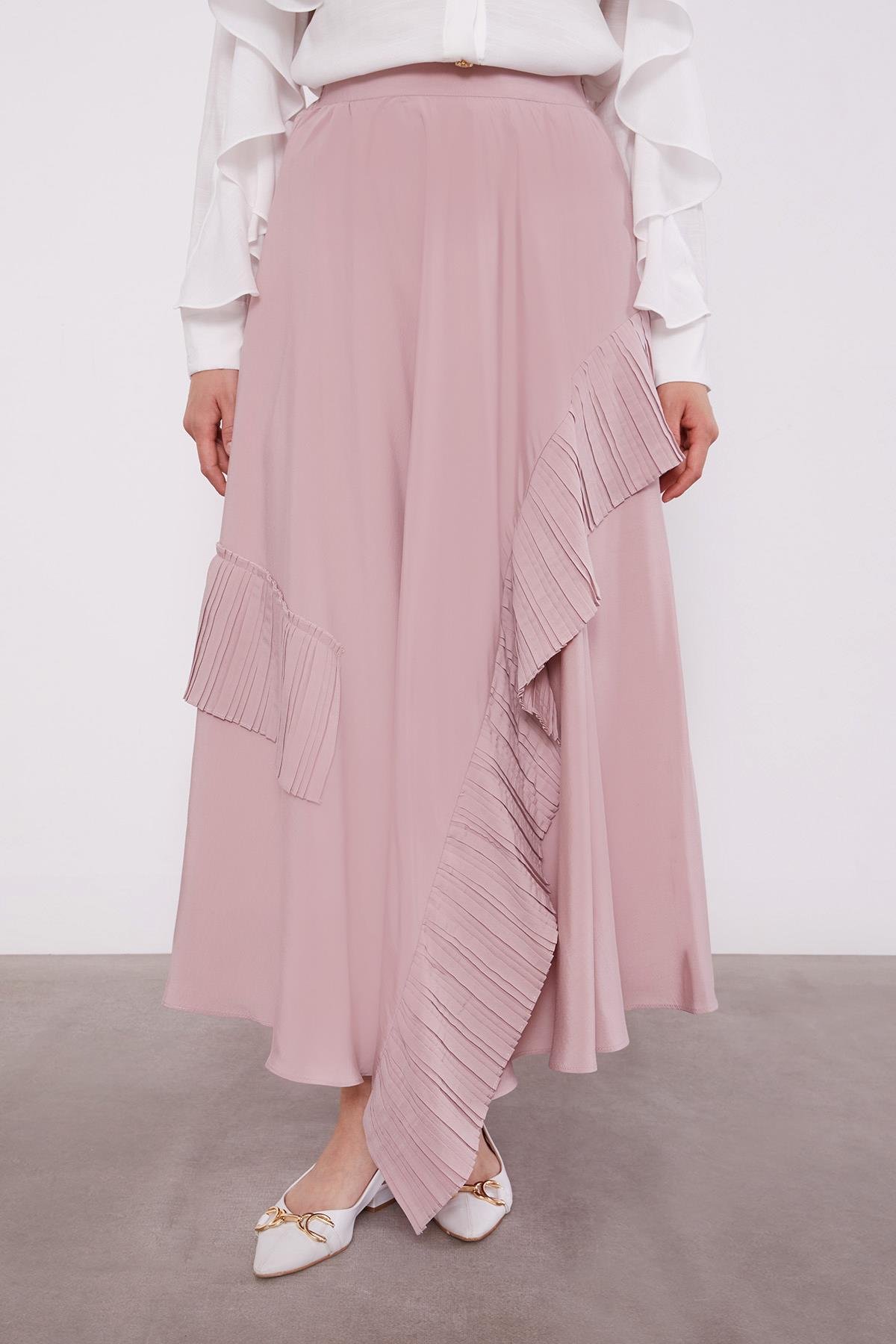 تنورة بالون ذات وسط متوسط، ومطوية، وسحاب خفي من الخلف، وجيوب جانبية، مصنوعة من قماش ممتاز متماسك الحجم لا يظهر ما بداخله وبدون بطانة.