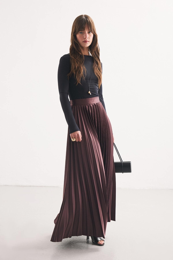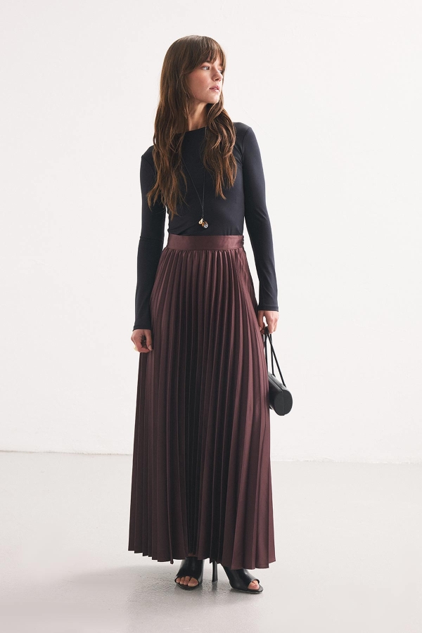 تنورة من الساتان المطوي بدون بطانة، تصميم عادي لا يظهر التفاصيل الداخلية، مزودة بسحاب جانبي، مع حزام في الأمام ومطاط في الخلف.