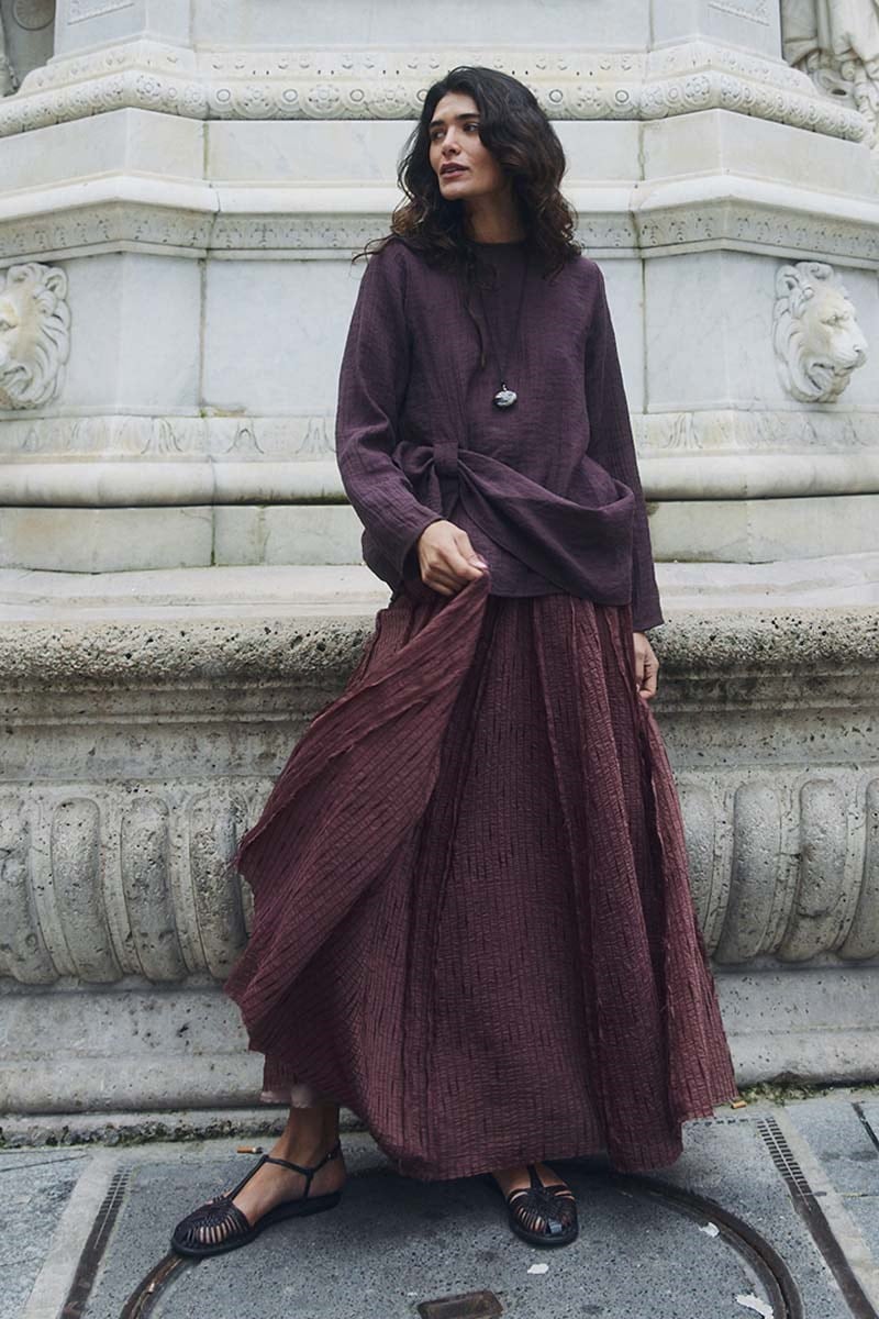 تصميم بخصر متوسط، وطيات مجمعة، وسحاب خفي من الخلف، وجيوب جانبية، وقماش متميز ذو ملمس وحجم كبير غير شفاف، تنورة بالون بدون بطانة.