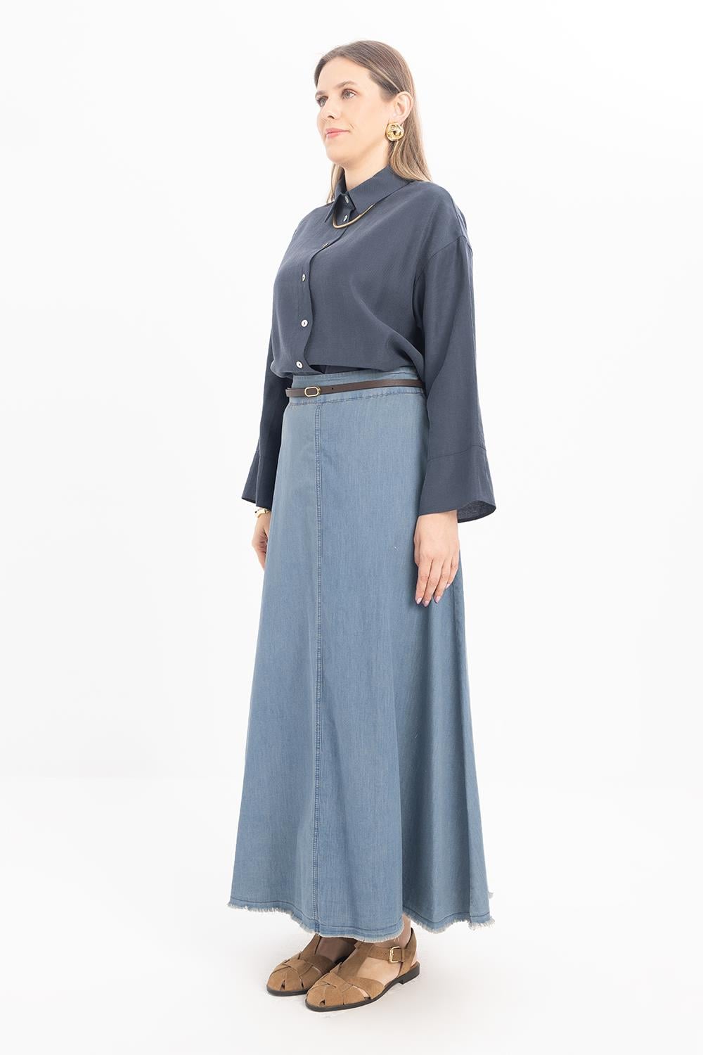 تنورة طويلة من الجلد المدبوغ بسحاب مخفي من الجانب، بدون بطانة، لا تظهر التفاصيل الداخلية.