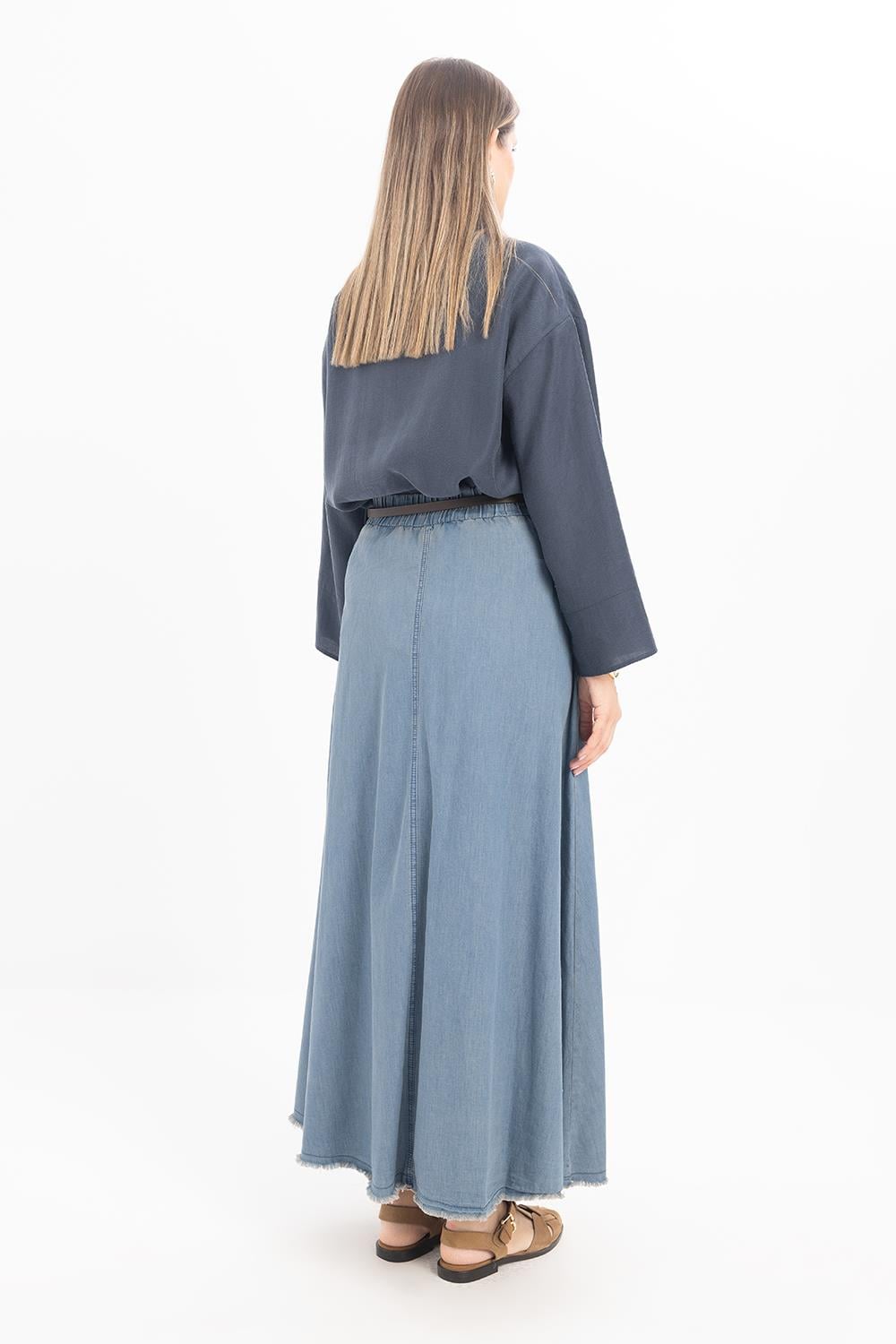 تنورة زرقاء فاتحة بحاشية مهدلة وخصر مطاطي