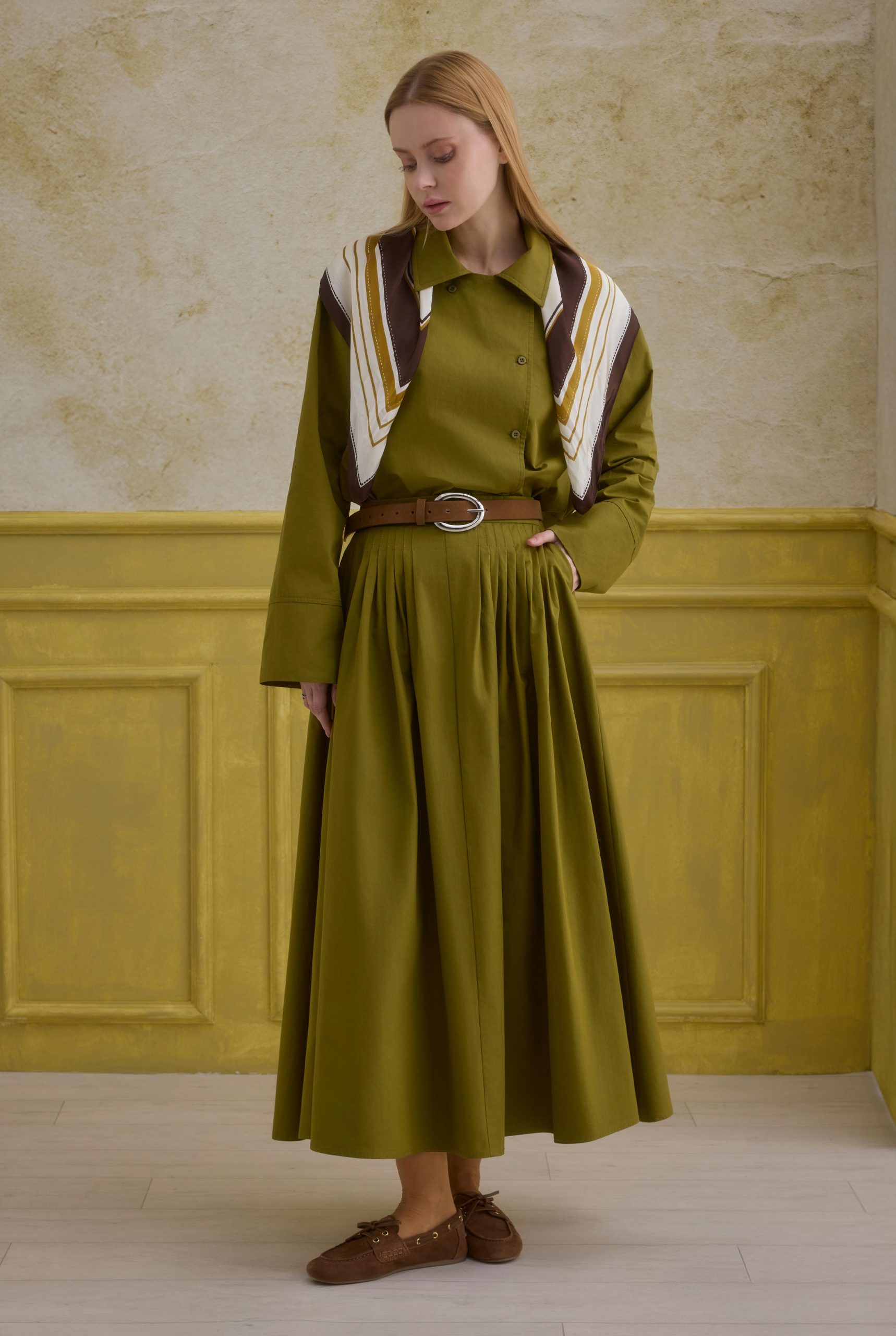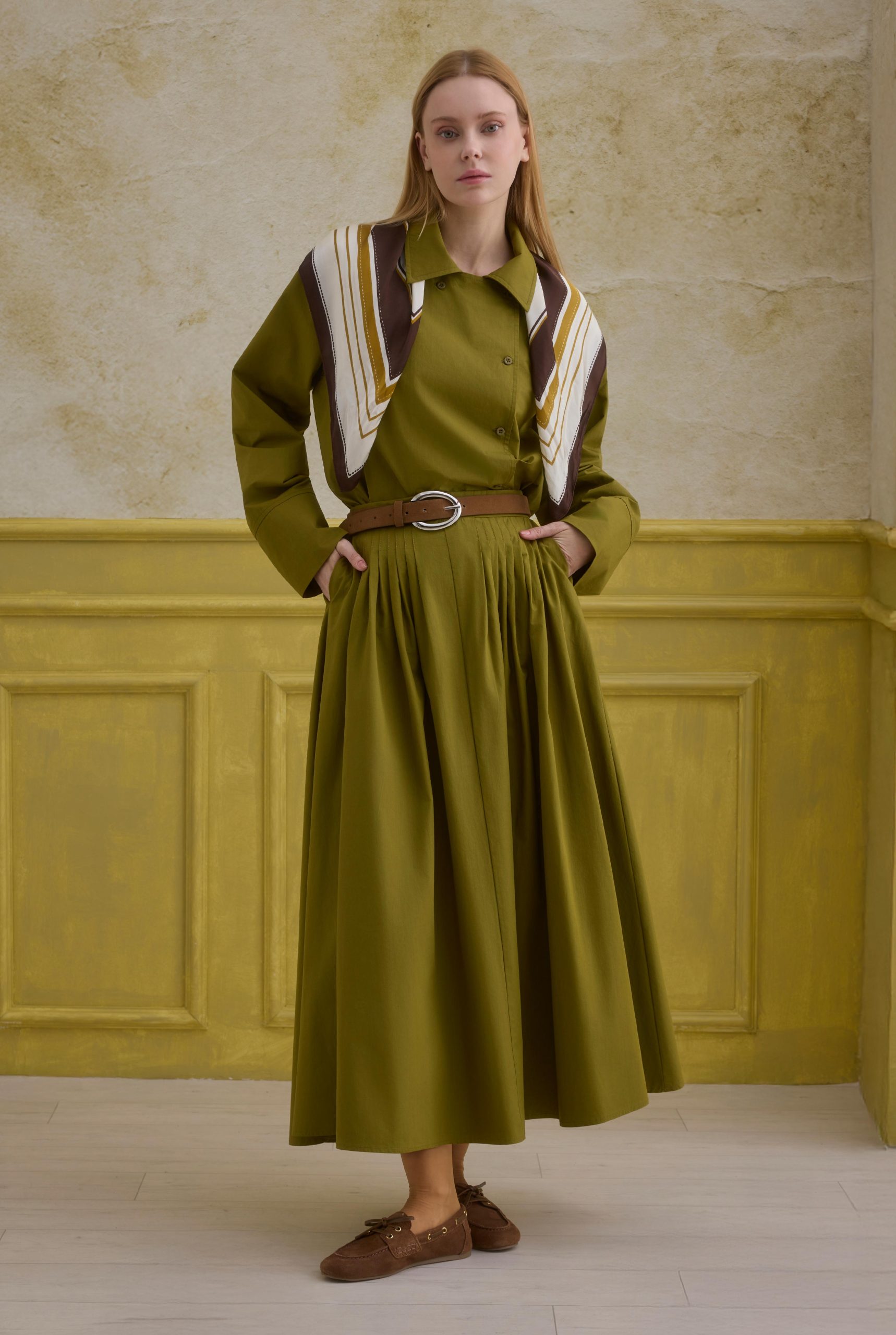 هذه التنورة المصنوعة من قماش قطني 100% تقدم راحة تنفسية وصديقة للبشرة بفضل أليافها الطبيعية بالكامل. نسيجها ذو الملمس الورقي يتميز ببنية سميكة قليلاً مع تجاعيد طبيعية، مما يمنح التصميم شخصية فريدة وأناقة؛ هذه التجاعيد ليست مزعجة. تضيف التفاصيل المخططة حركة وبنية راقية للتنورة، مما يجعل إكمال مجموعاتك اليومية الأنيقة أمراً سهلاً.