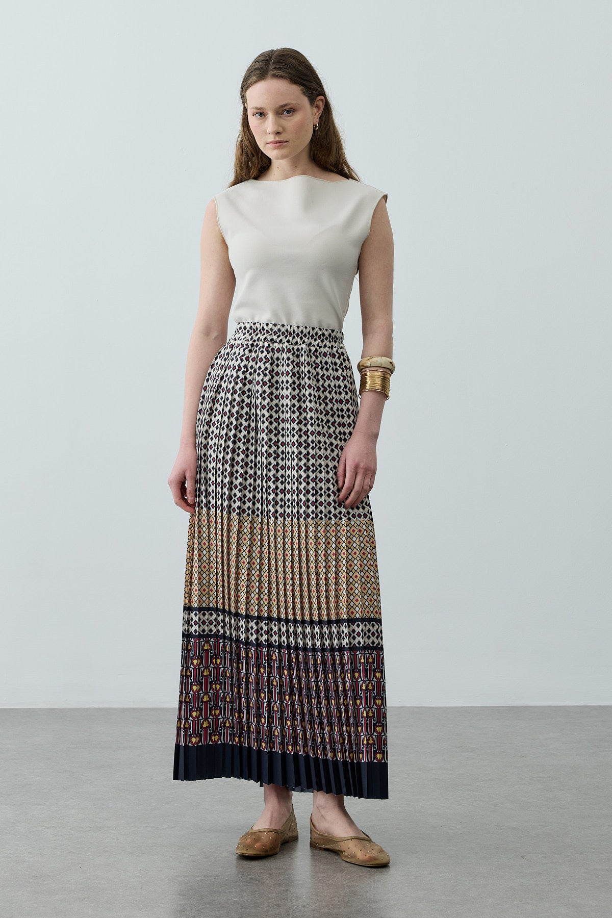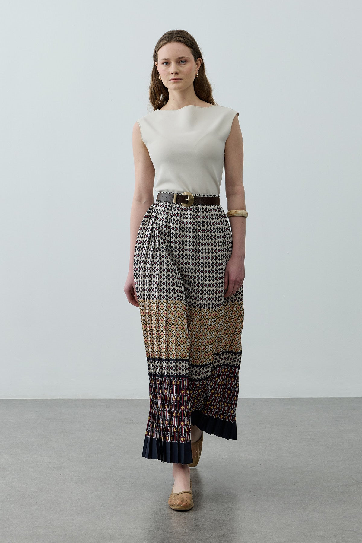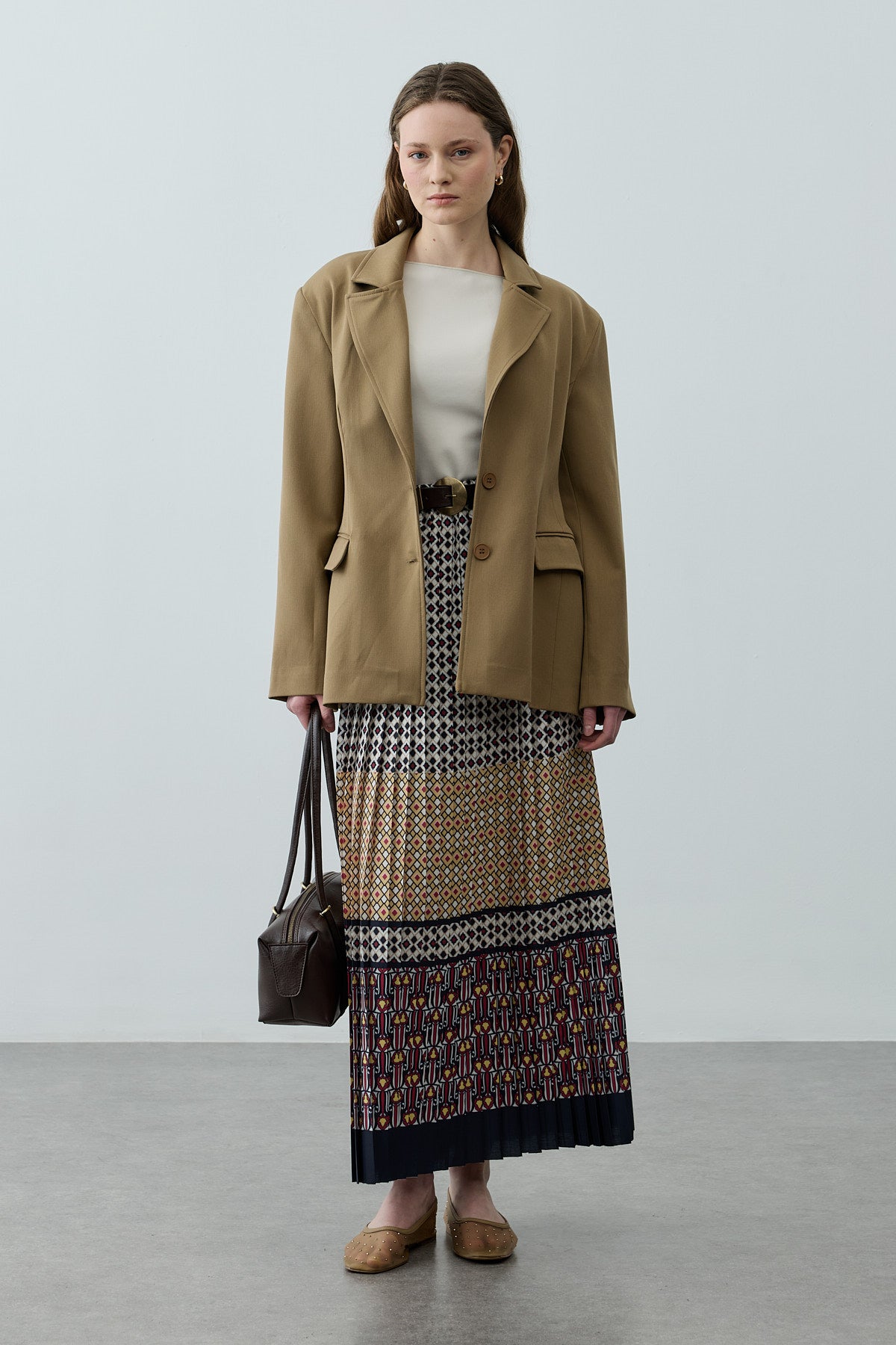 تنورة ماكسي مصنوعة من قماش منسوج متدفق، تتميز بحزام مطاطي عند الخصر، وتصميم منقوش، وتفاصيل مطوية.