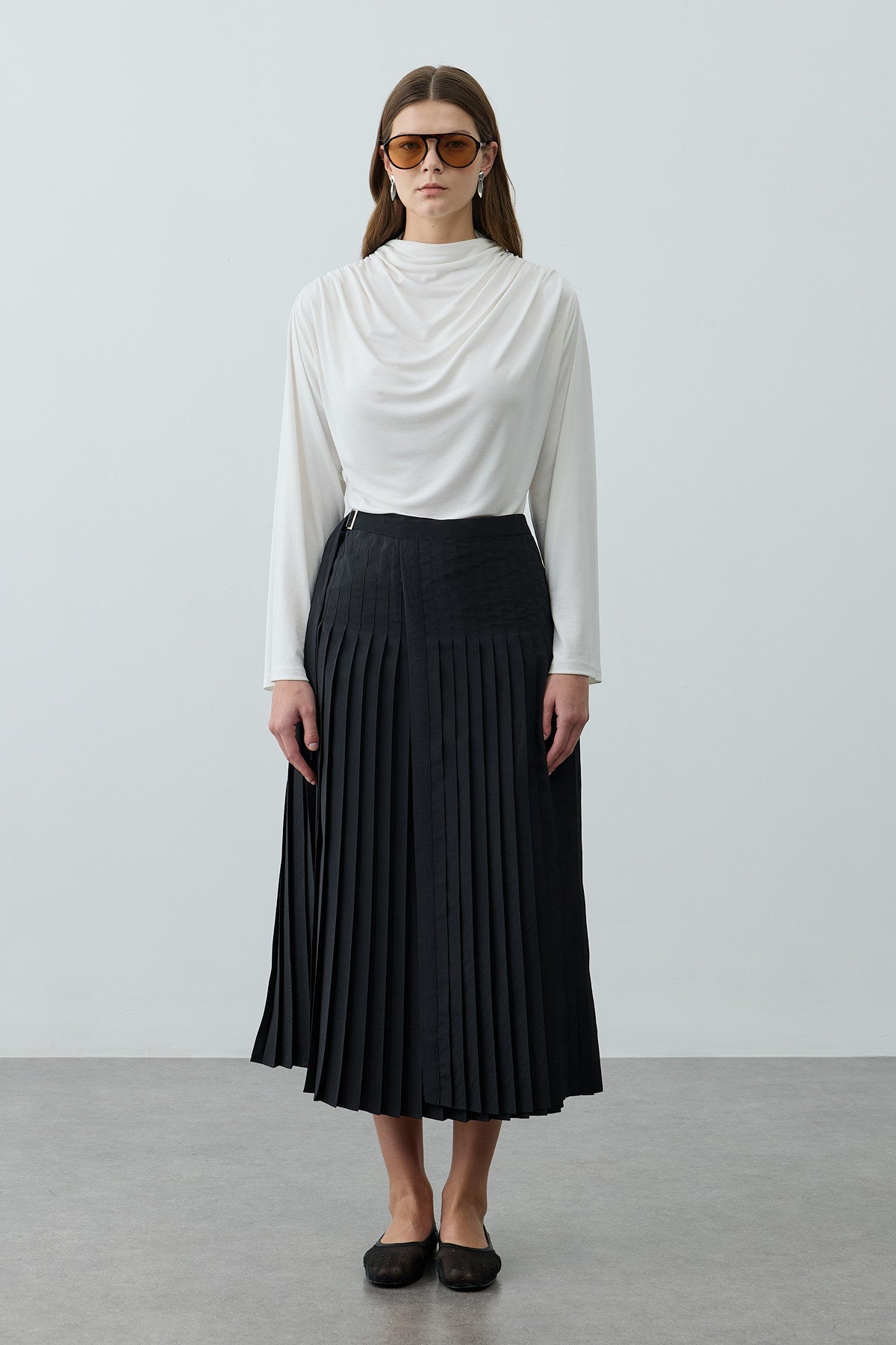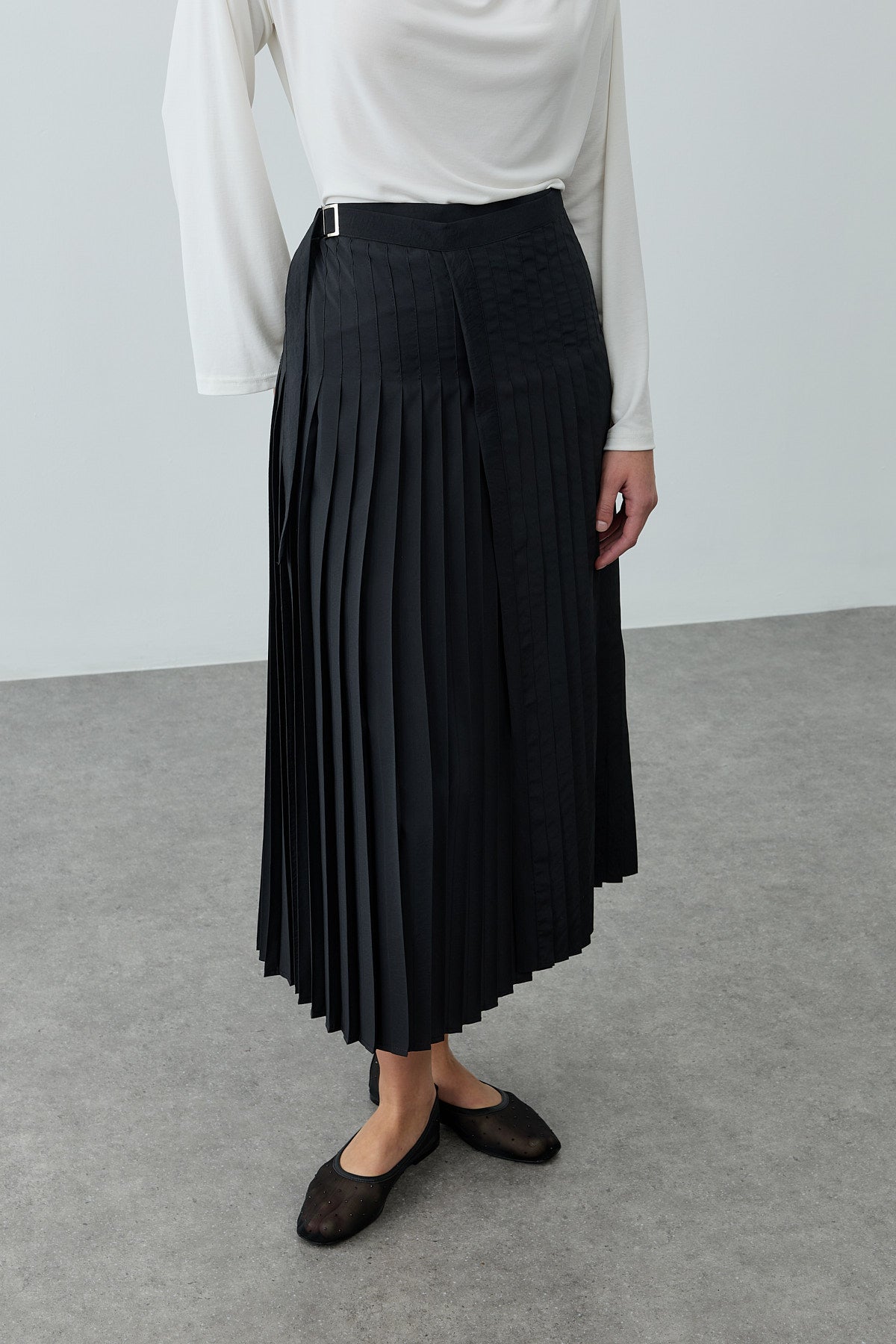 تنورة مريحة ذات قصة كروشيه، مزودة بتفاصيل مطوية، سحاب خلفي مخفي، وقماش طارد للماء.