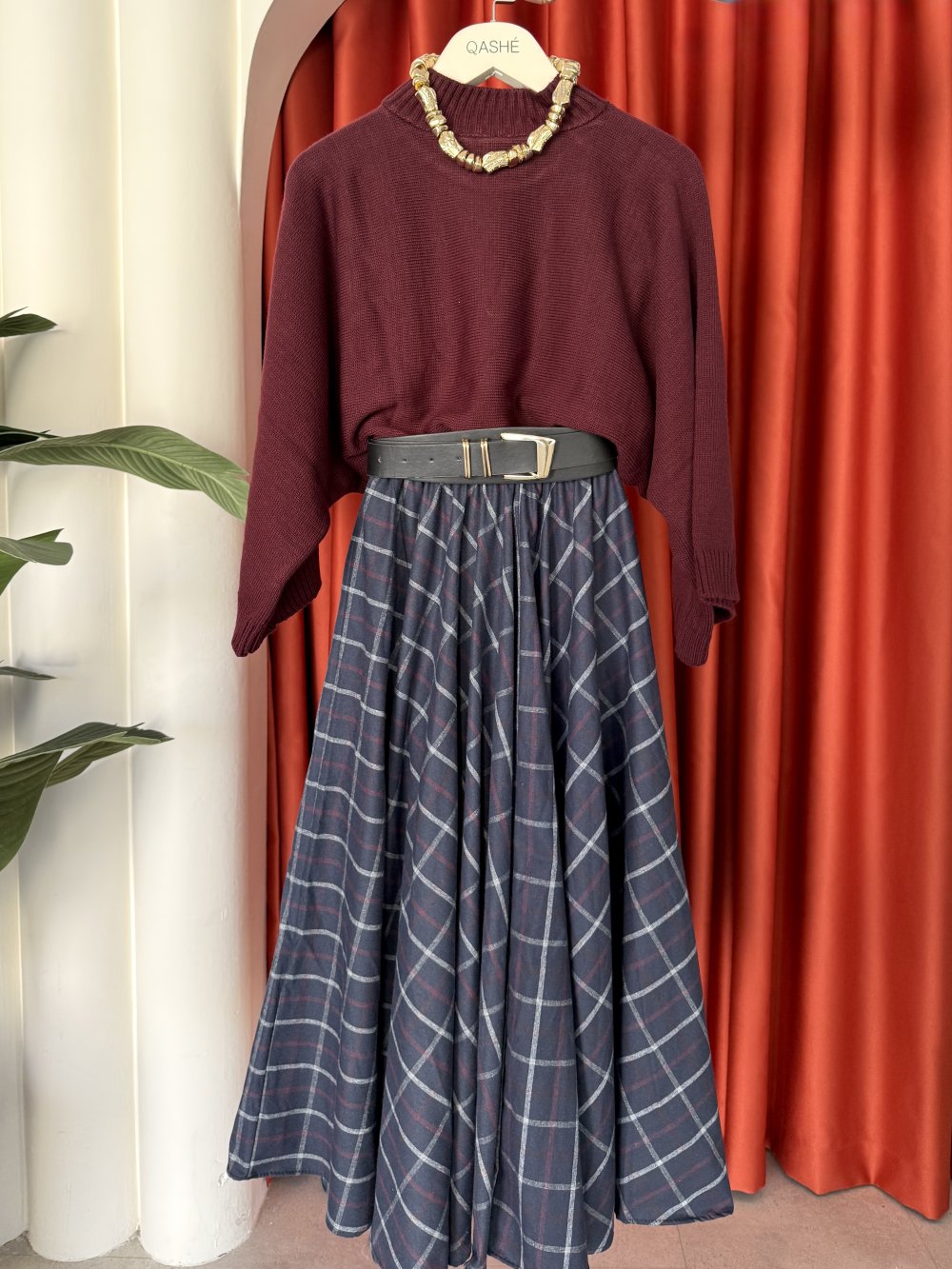التنورة مزينة بتفاصيل مربعات متقاطعة.