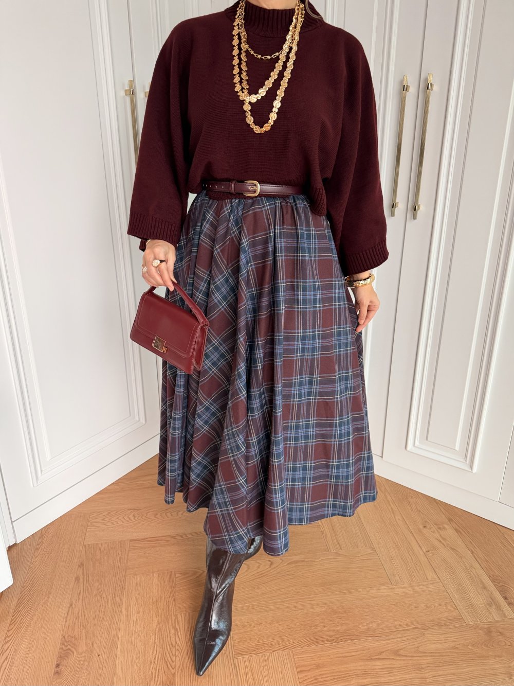 تتميز هذه التنورة بتفاصيل مربعات الشطرنج. تحتوي على خصر مرن يوفر راحة فائقة. تصميمها الواسع يمنحك مظهرًا أنيقًا ومريحًا. طول التنورة: 86 سم، محيط الخصر: 38 سم.