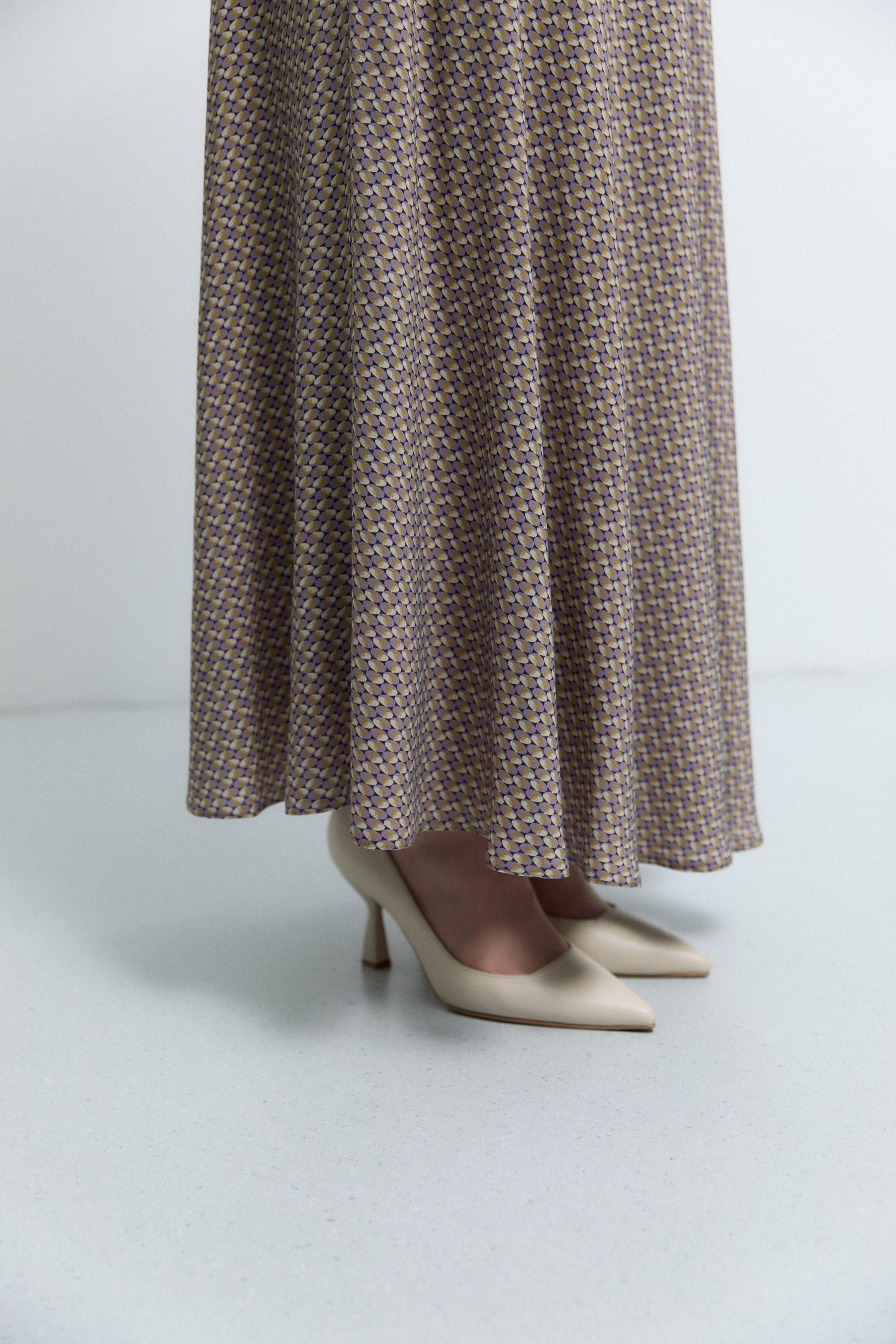 تنورة بالون ذات وسط متوسط، ومطوية، وسحاب خفي من الخلف، وجيوب جانبية، مصنوعة من قماش ممتاز متماسك الحجم لا يظهر ما بداخله وبدون بطانة.