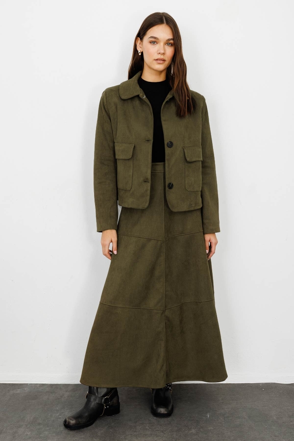 تنورة طويلة من الجلد المدبوغ باللون الكاكي