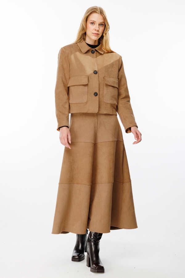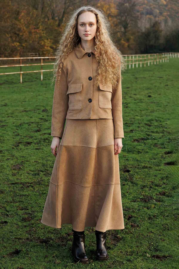 تنورة طويلة من الجلد المدبوغ بلون الكاميل