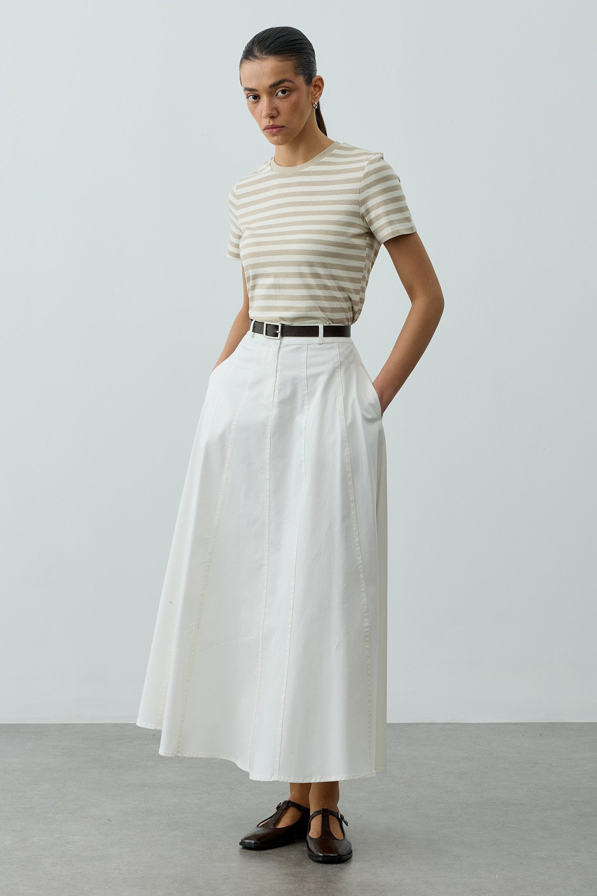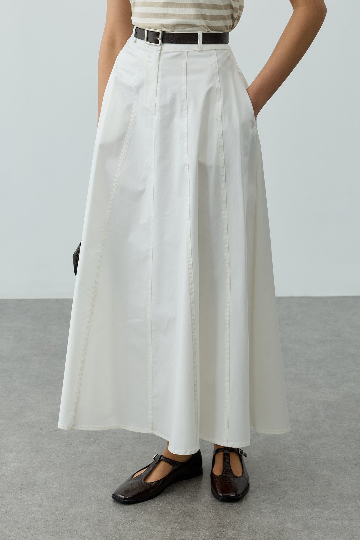 تنورة ماكسي مصنوعة من قماش الغاباردين المنسوج، تتميز بإغلاق بالأزرار والسحاب من الأمام، مع تطريز بإبرة مزدوجة وتفاصيل متعددة القطع.