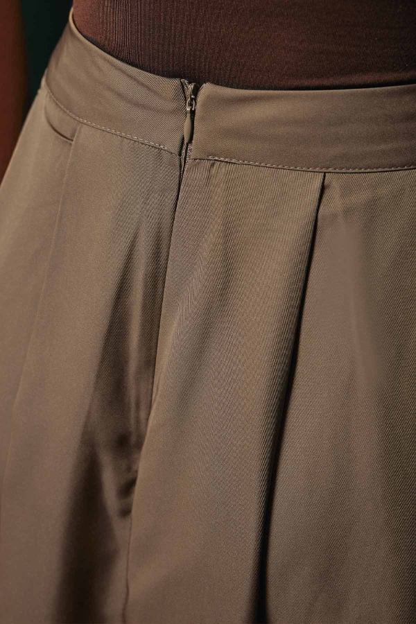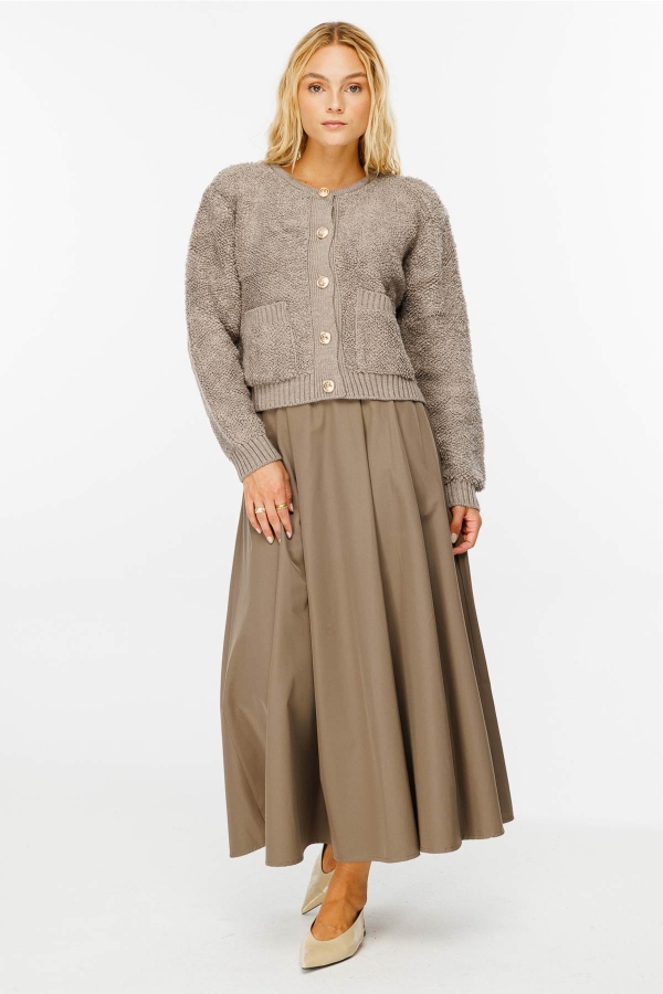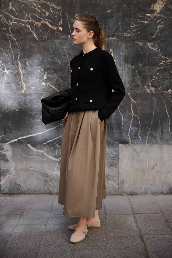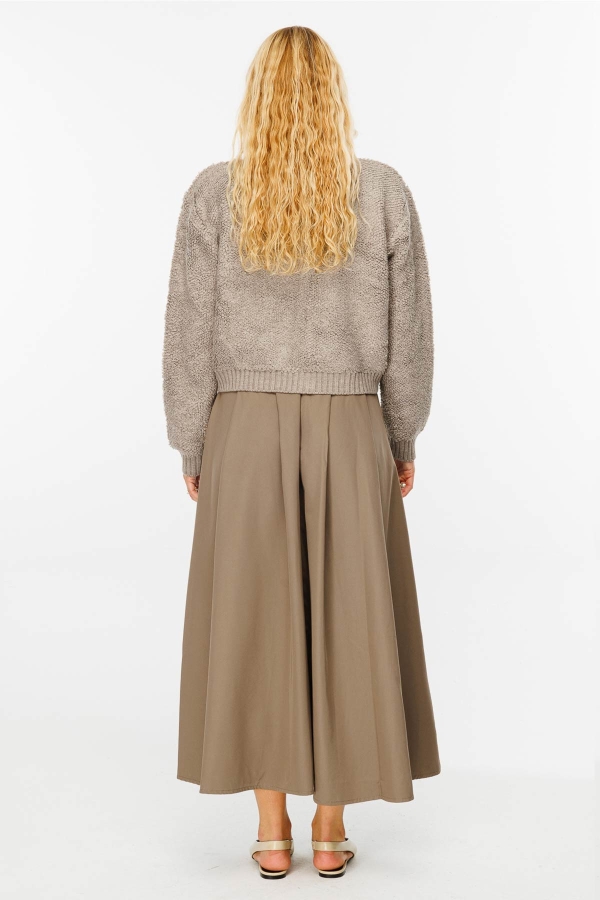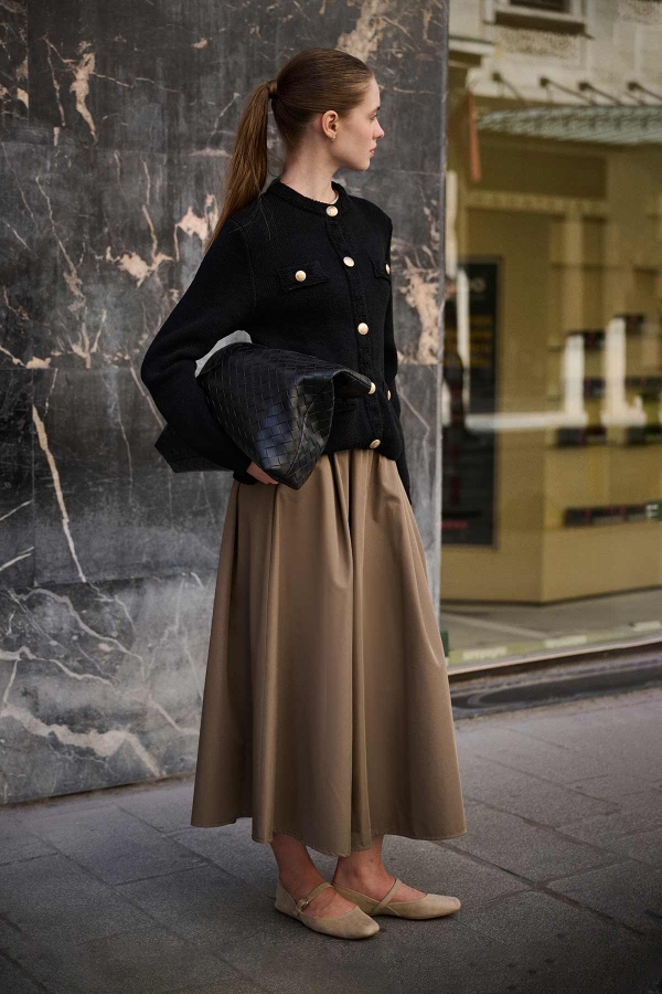 تصميم بخصر متوسط، وطيات مجمعة، وسحاب خفي من الخلف، وجيوب جانبية، وقماش متميز ذو ملمس وحجم كبير غير شفاف، تنورة بالون بدون بطانة.