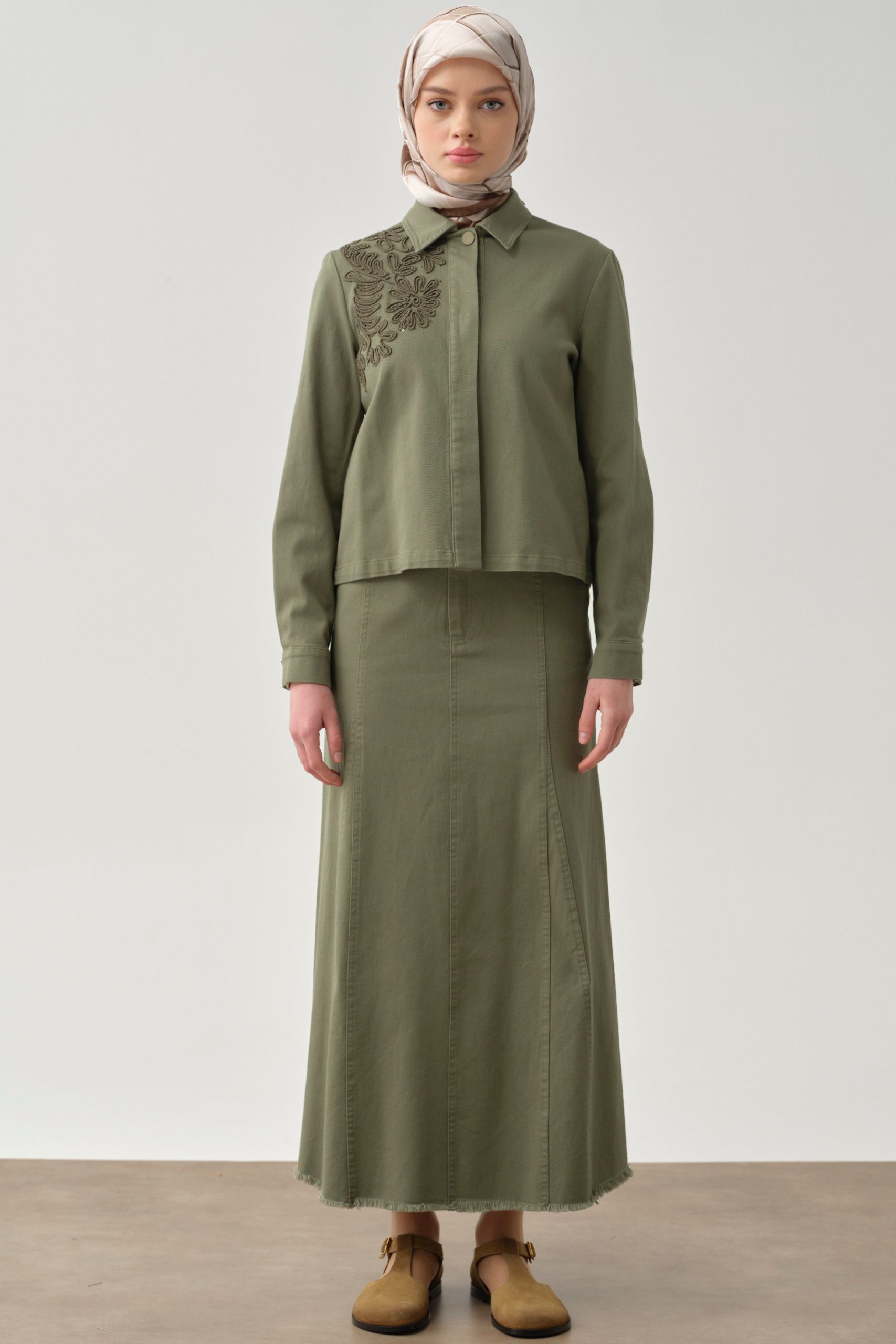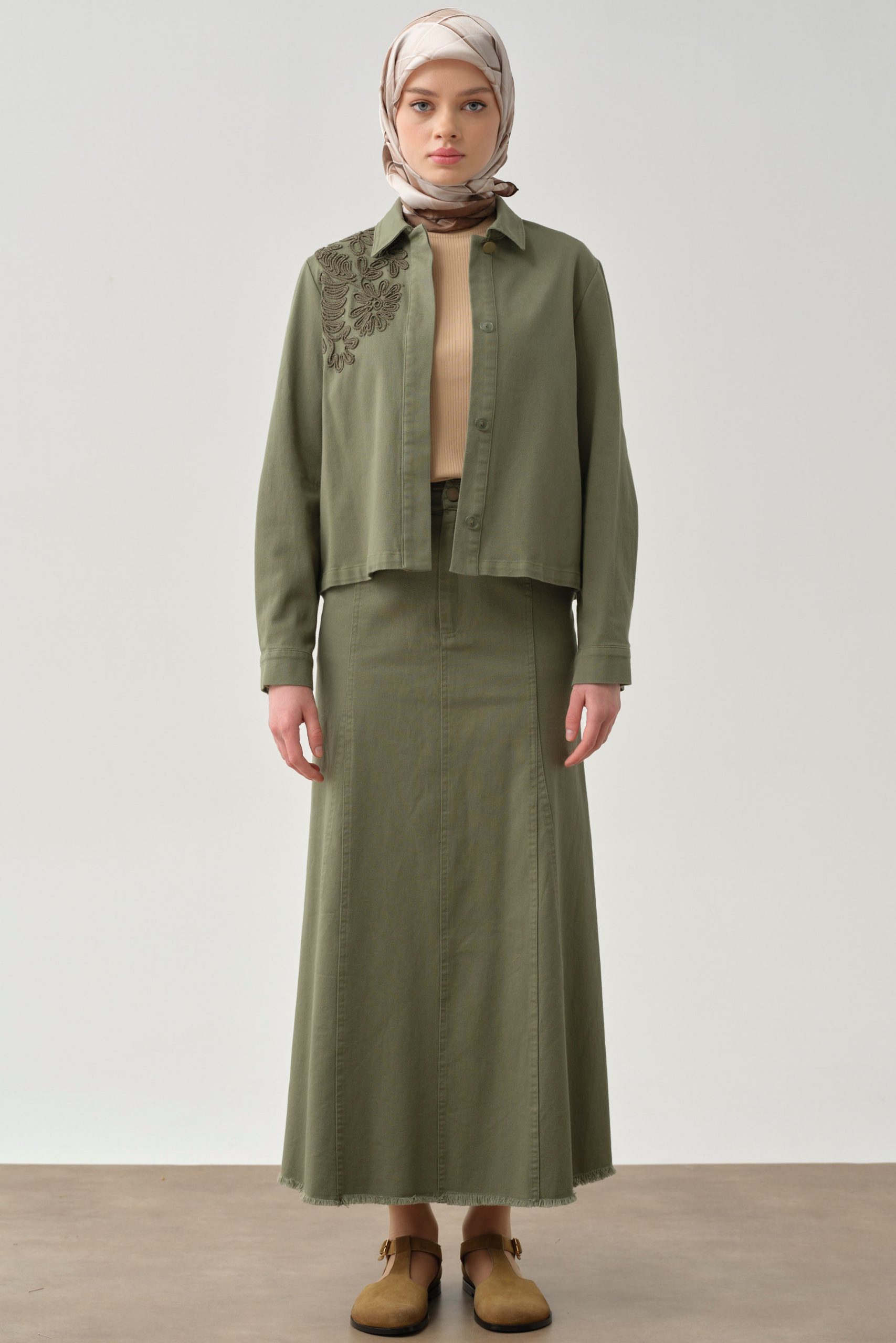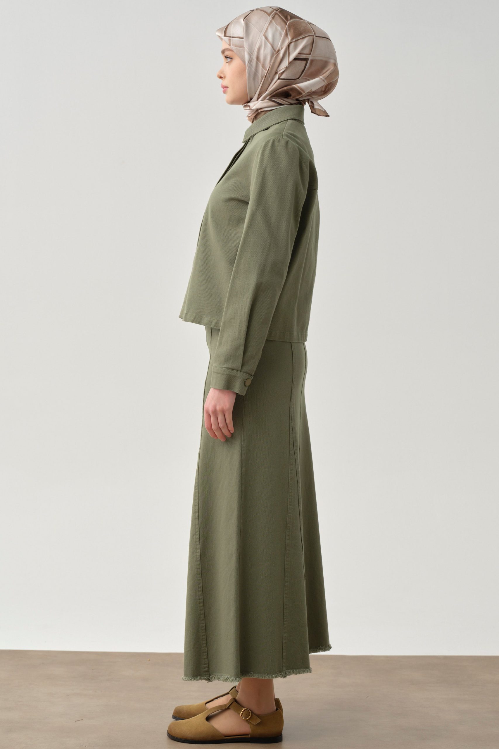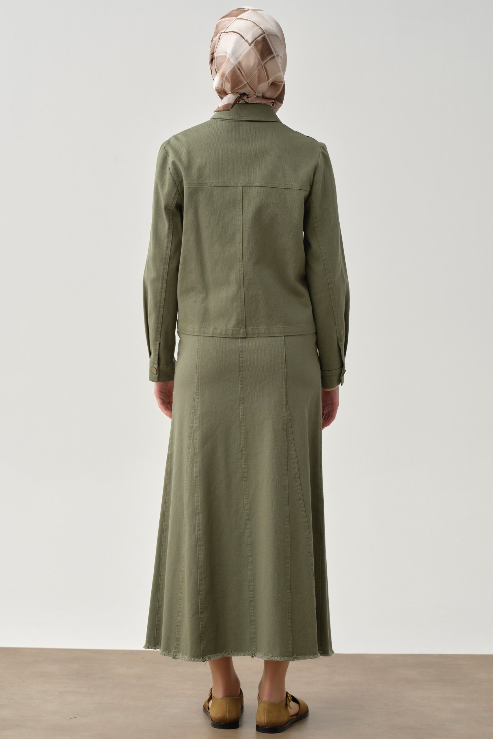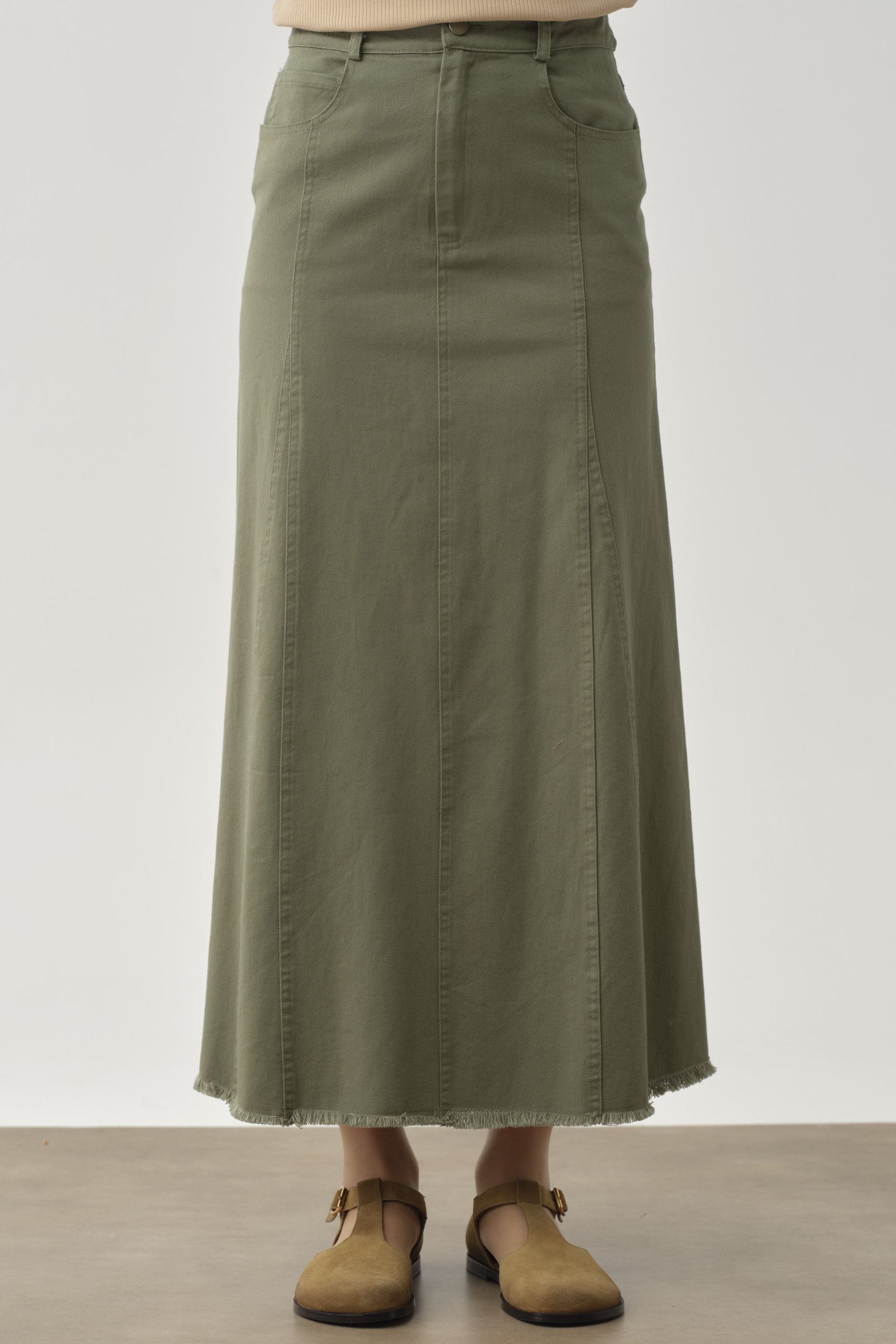 تنورة قماشية بتفاصيل شراشيب وجيوب – خاكي