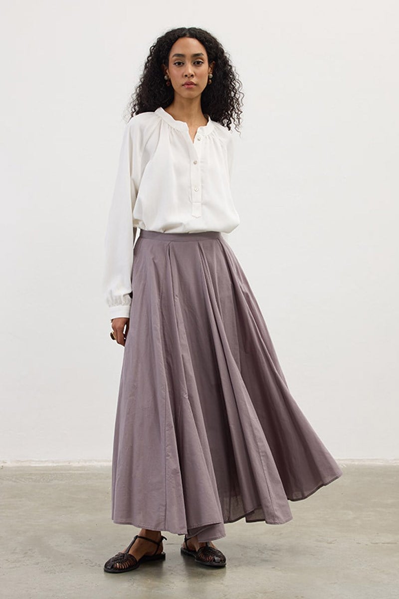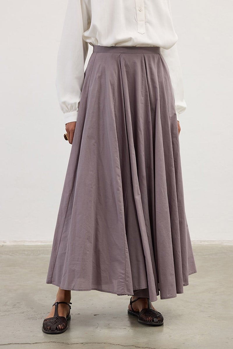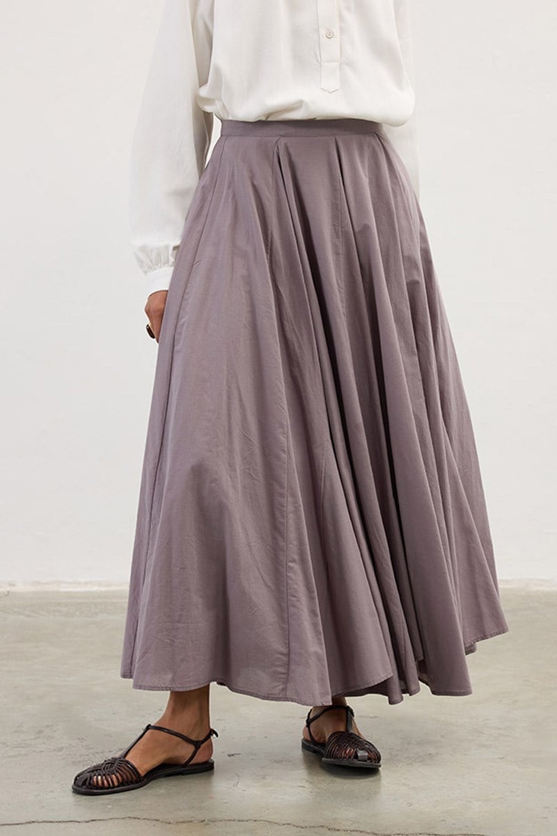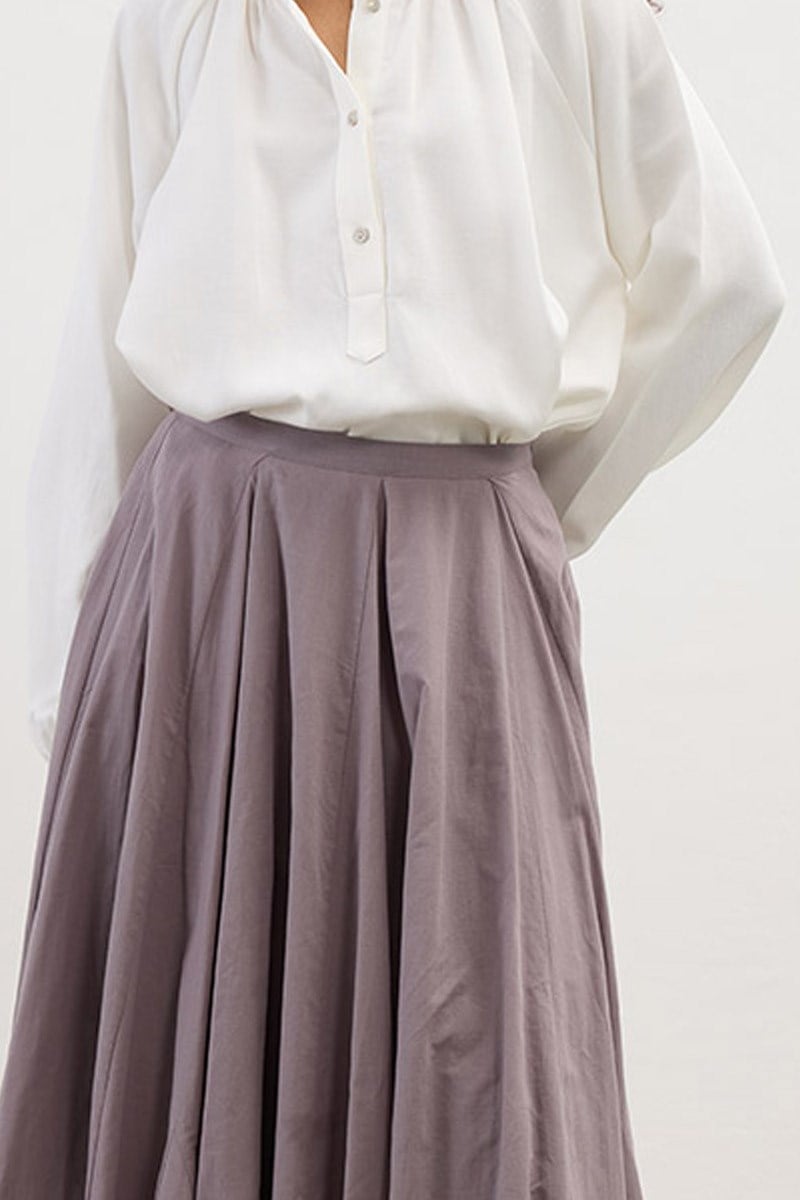 تنورة بالون ذات وسط متوسط، ومطوية، وسحاب خفي من الخلف، وجيوب جانبية، مصنوعة من قماش ممتاز متماسك الحجم لا يظهر ما بداخله وبدون بطانة.