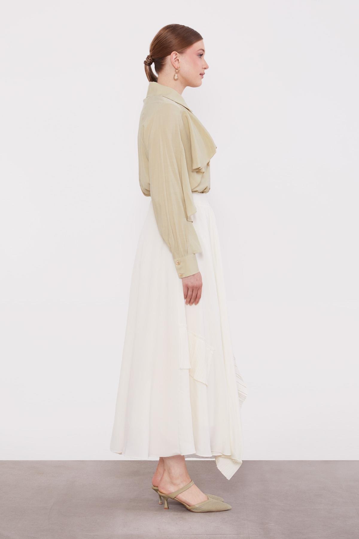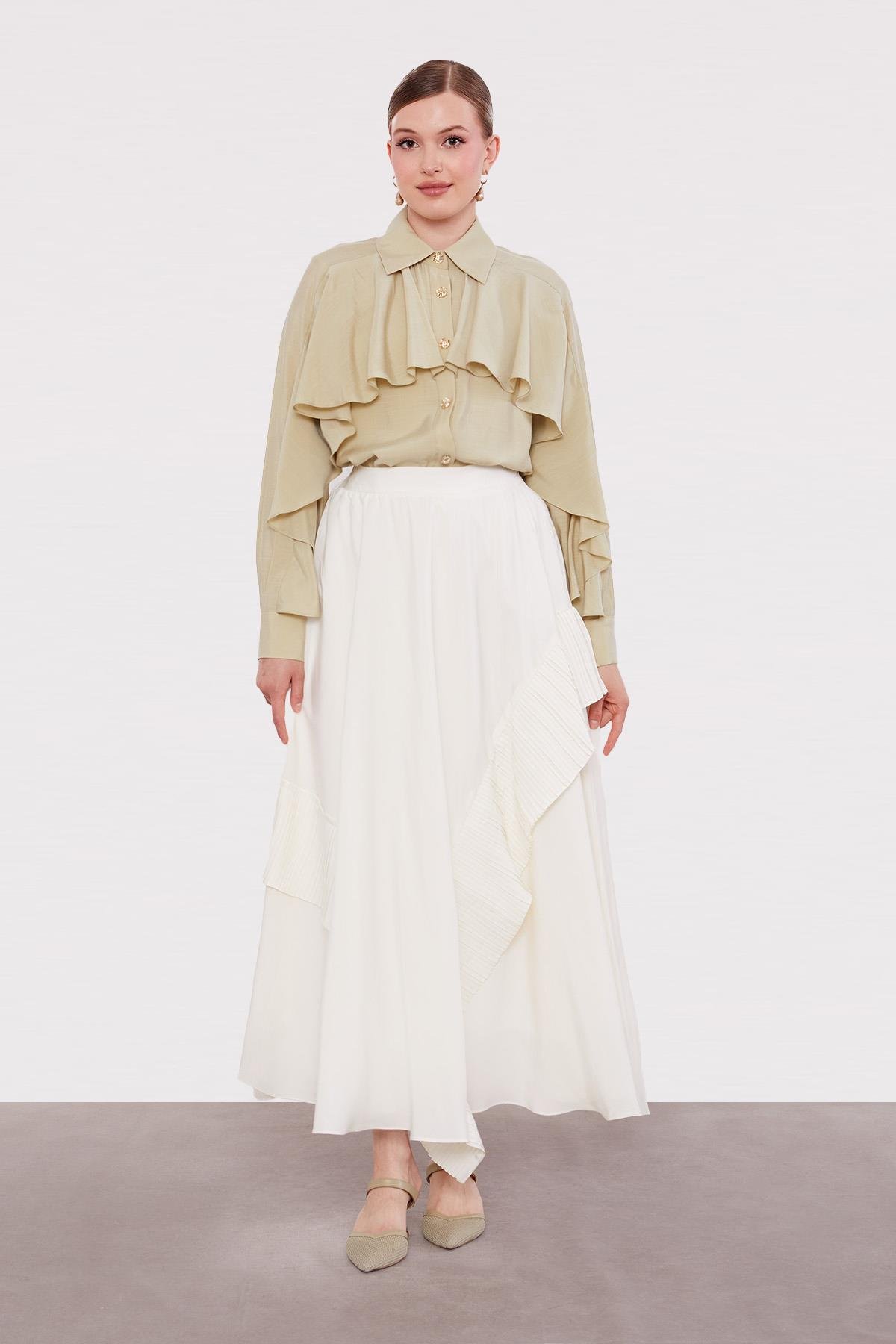 تنورة مريحة ذات قصة كروشيه، مزودة بتفاصيل مطوية، سحاب خلفي مخفي، وقماش طارد للماء.