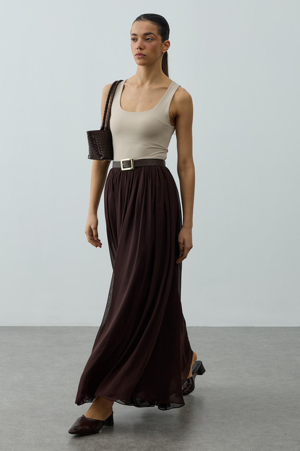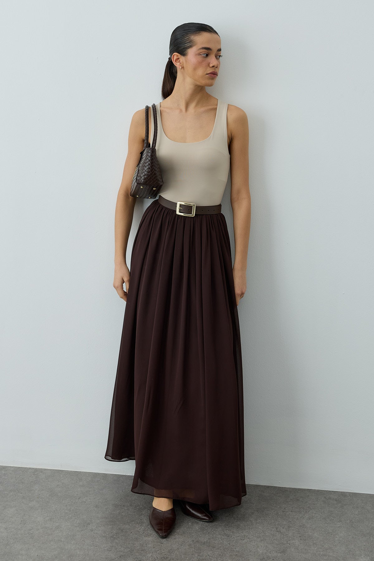 تنورة ماكسي بنية اللون بتفاصيل مطويّة ونسيابة