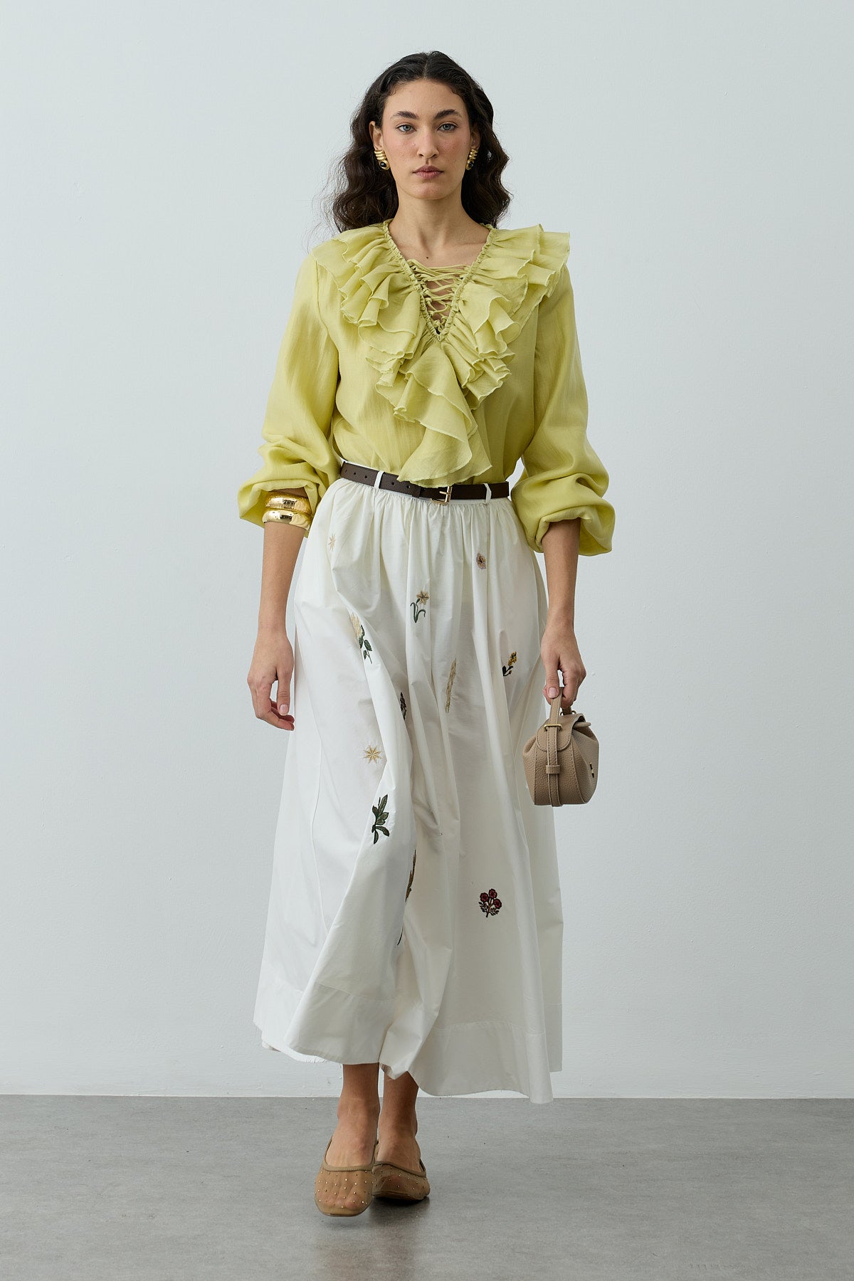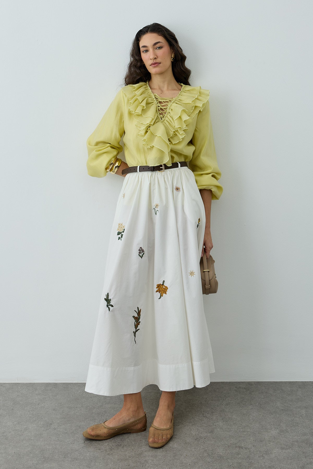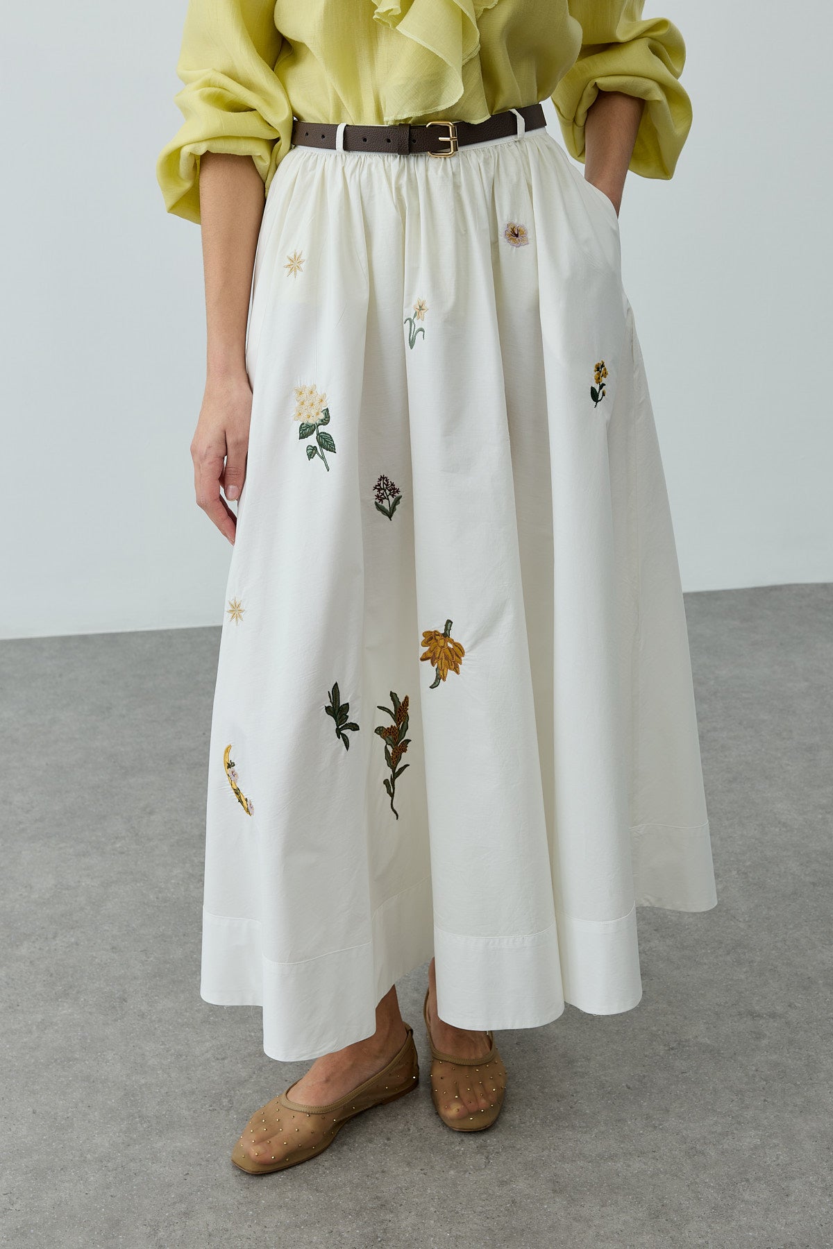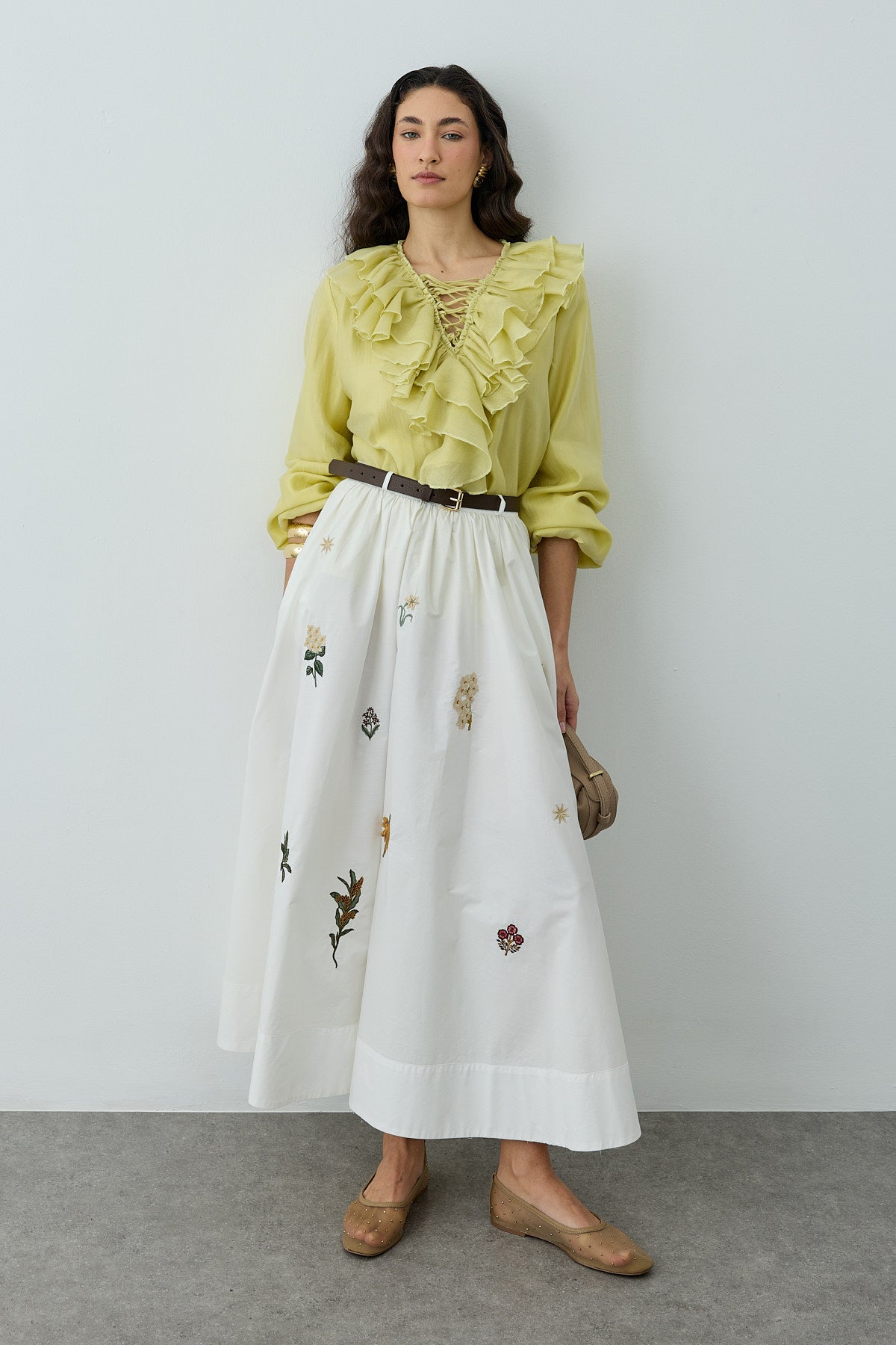 تنورة ماكسي مصنوعة من قماش منسوج 100% قطن، تتميز بحزام نحيل، تصميم مكشكش، تفاصيل مطرزة، وطيات سميكة عند الحاشية.