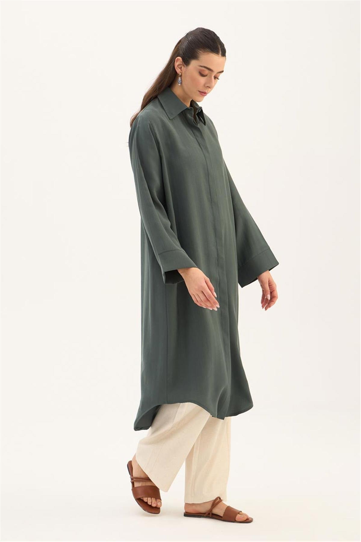 يقدم هذا التونيك الطويل باللون الأخضر الداكن مظهرًا طبيعيًا ومنعشًا، مما يجعله أحد القطع الخفيفة والأنيقة لموسم الصيف. مصنوع من خليط 88% تينسل و12% بيس، يوفر قماشه راحة طوال اليوم مع ملمس ناعم وبنية تسمح بالتهوية. يتميز بتصميم بسيط، وتفاصيل أزرار مخفية، وحاشية منحنية أنيقة، مما يقدم صورة ظلية عصرية.