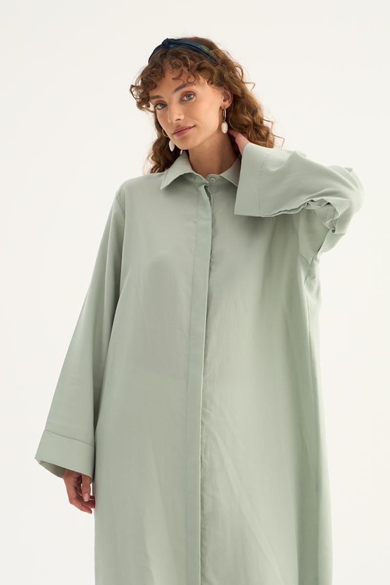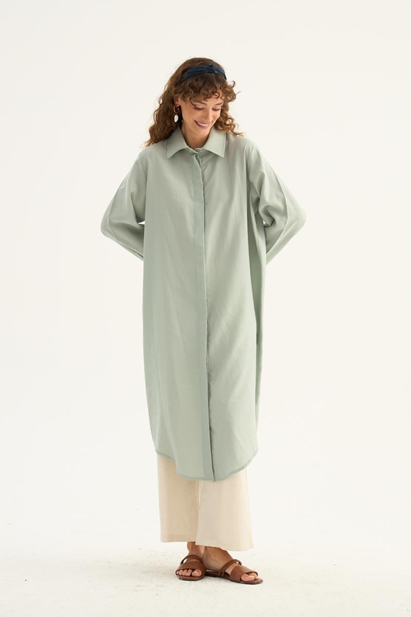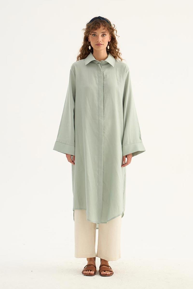 يقدم هذا التونيك الطويل باللون الأخضر المائي مظهرًا طبيعيًا ومنعشًا، مما يجعله أحد القطع الخفيفة والأنيقة لموسم الصيف. مصنوع من مزيج 88% تنسل و12% بوليستر، حيث يوفر قماشه راحة طوال اليوم بفضل نسيجه الناعم وهيكله المنفّس. يتميز بتصميم بسيط، وتفاصيل أزرار مخفية، وحاشية منحنية أنيقة، مما يبرز وقفته العصرية. بأكمام طويلة ذات أصفاد عريضة وقصة مريحة، يوفر هذا التونيك حرية الحركة ويمكن اختياره بسهولة لكل من التركيبات اليومية وأناقة المكتب. يتناغم بشكل مثالي مع البناطيل ذات الألوان المحايدة والباستيل، ويمكن تكييفه مع أنماط مختلفة سواء مع الصنادل ذات الكعب العالي أو الأحذية المسطحة. تضيف الدرجة الدقيقة من الأخضر المائي لمسة منعشة وهادئة إلى خزانة ملابسك.