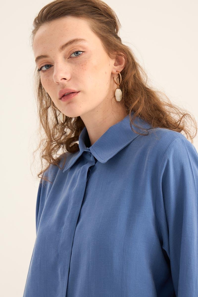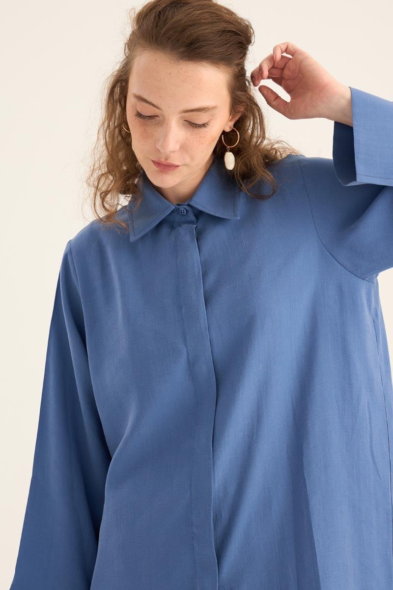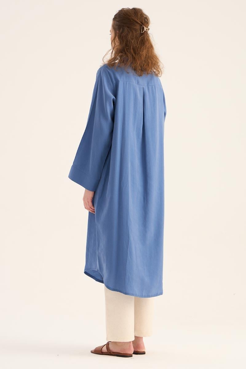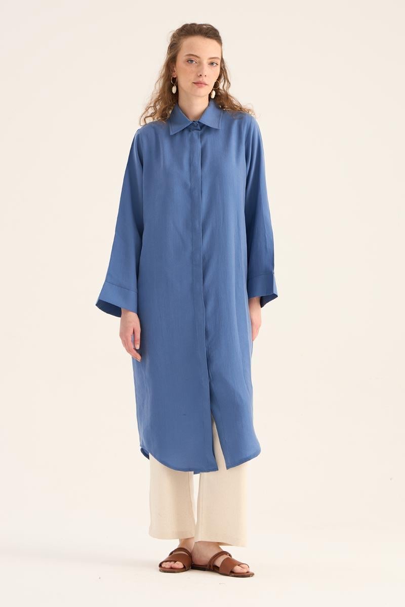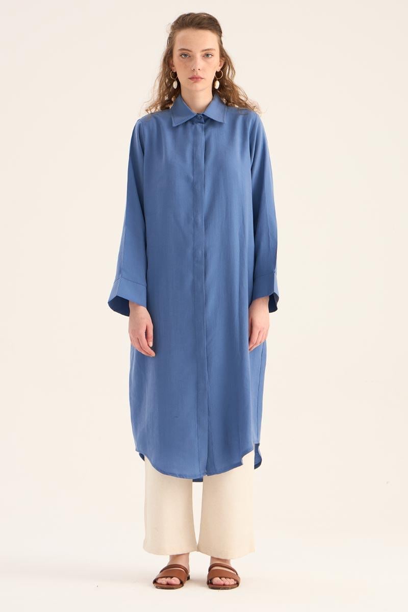 يقدم هذا التونيك الطويل الأزرق النيلي مظهراً طبيعياً ومنعشاً، مما يجعله أحد القطع الخفيفة والأنيقة لموسم الصيف. مصنوع من مزيج 88% تنسل و12% بولي إستر، يوفر نسيجه راحة طوال اليوم بفضل ملمسه الناعم وتركيبته القابلة للتنفس. التصميم البسيط، تفصيل الأزرار المخفية، والحاشية المنحنية الأنيقة عند التنورة تخلق هيئة عصرية.