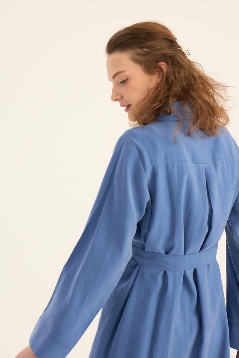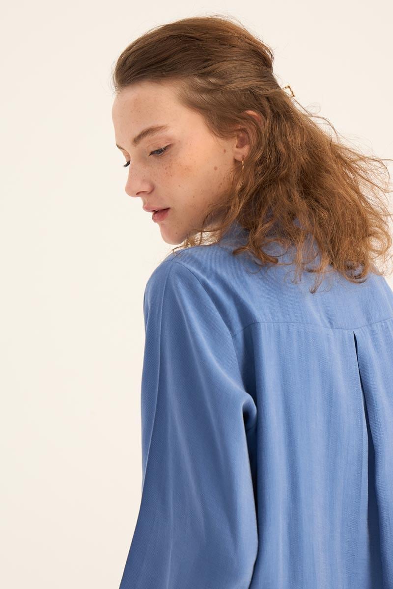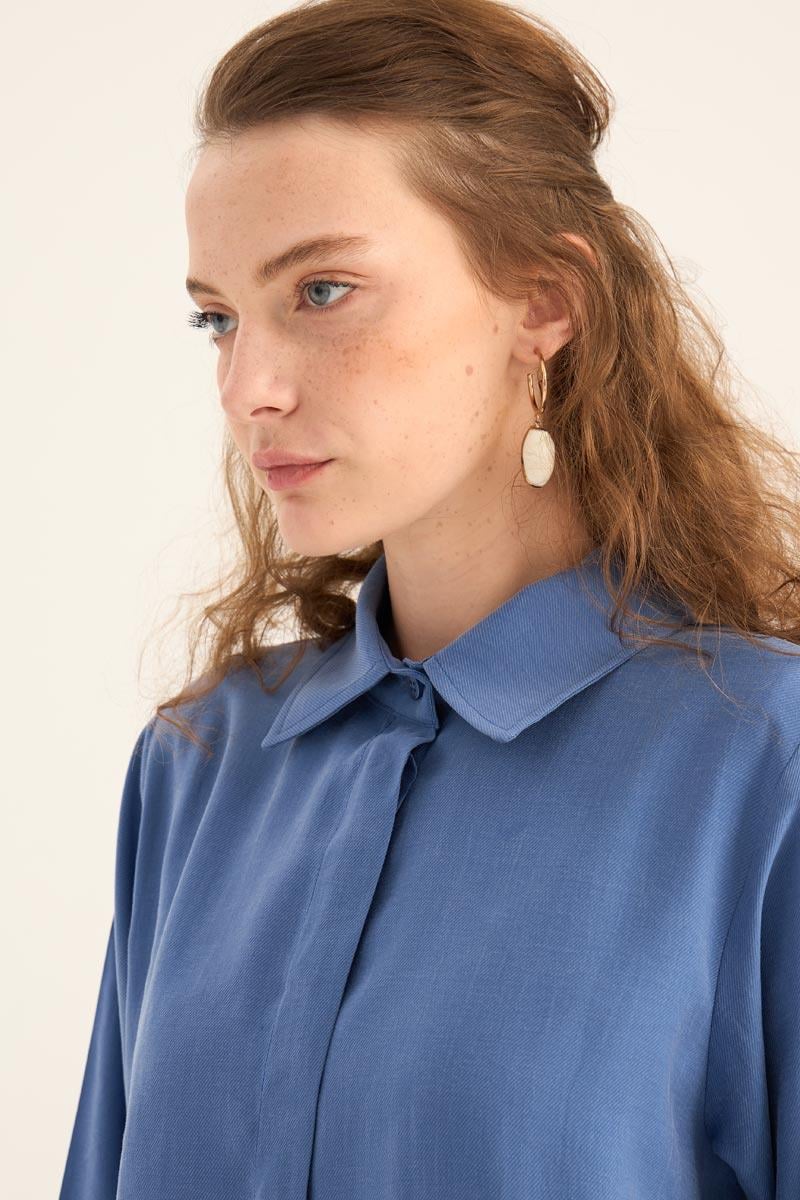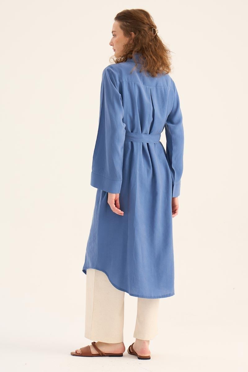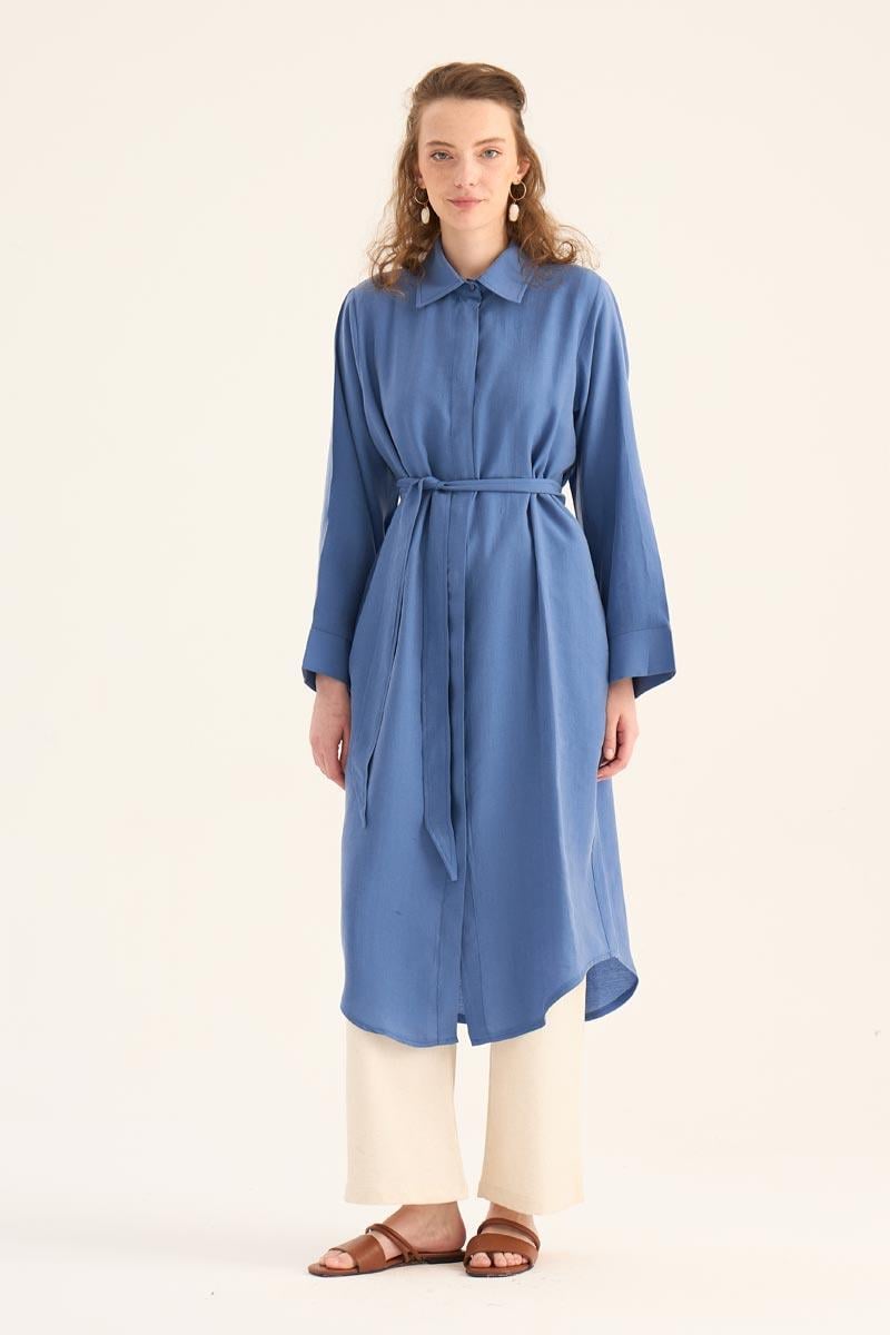 يقدم هذا التونيك الطويل الأزرق النيلي مظهراً طبيعياً ومنعشاً، مما يجعله أحد القطع الخفيفة والأنيقة لموسم الصيف. مصنوع من مزيج 88% تنسل و12% بولي إستر، يوفر نسيجه راحة طوال اليوم بفضل ملمسه الناعم وتركيبته القابلة للتنفس. التصميم البسيط، تفصيل الأزرار المخفية، والحاشية المنحنية الأنيقة عند التنورة تخلق هيئة عصرية.