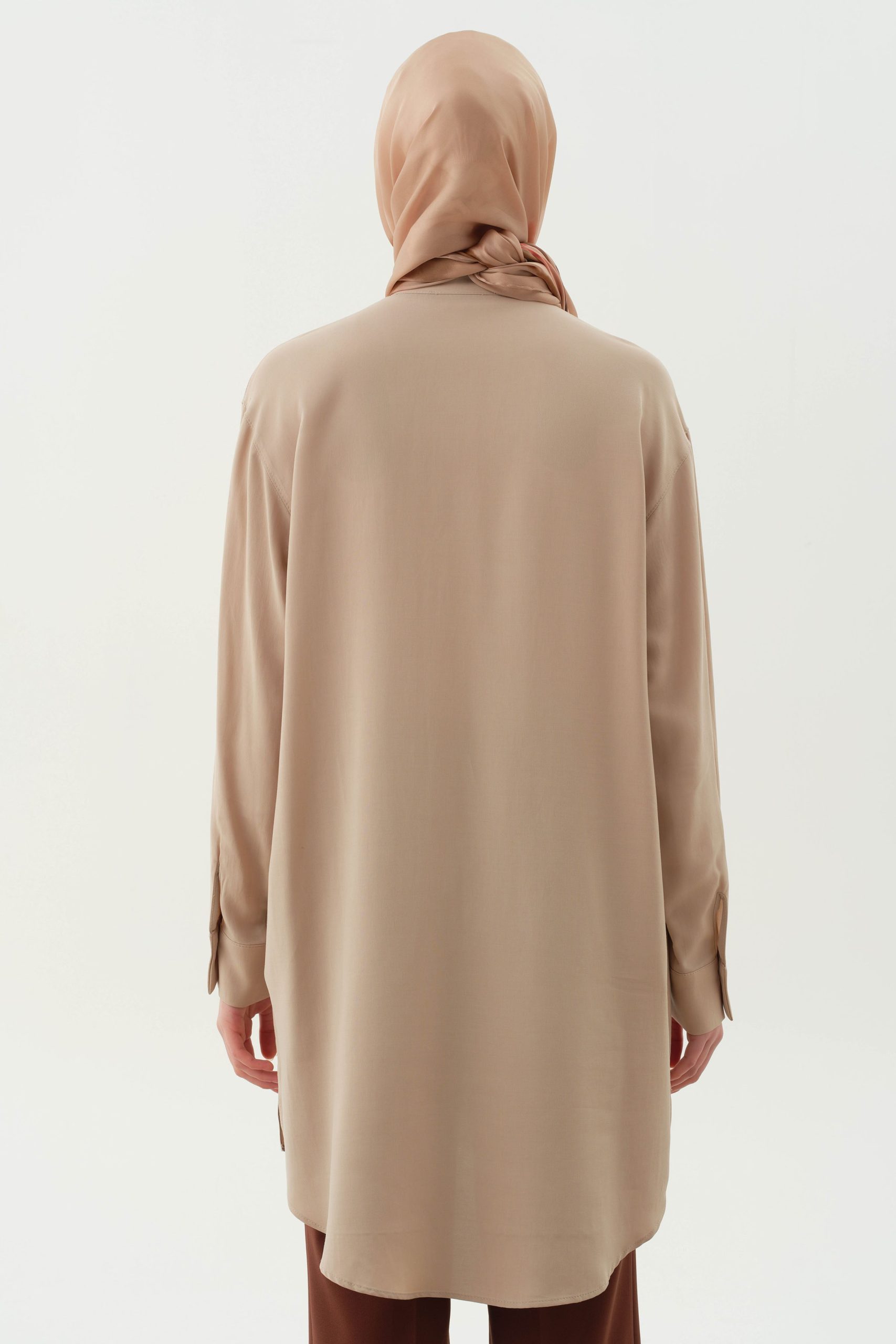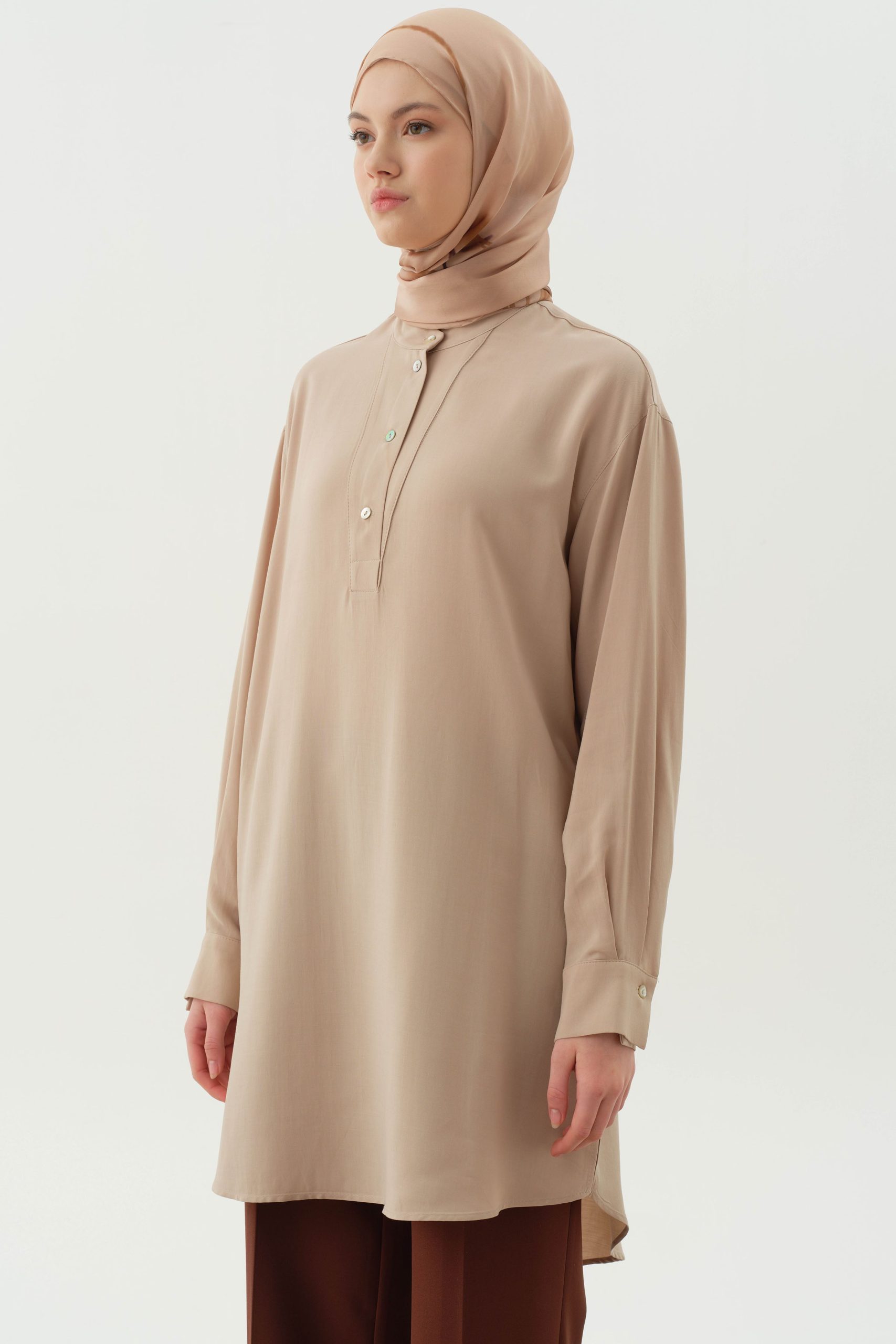 يعرض هذا التونيك بتفاصيل نصف طية وقصة أسيمترية مظهرًا عصريًا يتميز بالأناقة البسيطة. توفر هيكلته الخفيفة والسلسة الراحة طوال اليوم. إنه مكمل مثالي للأساليب الحضرية والديناميكية.