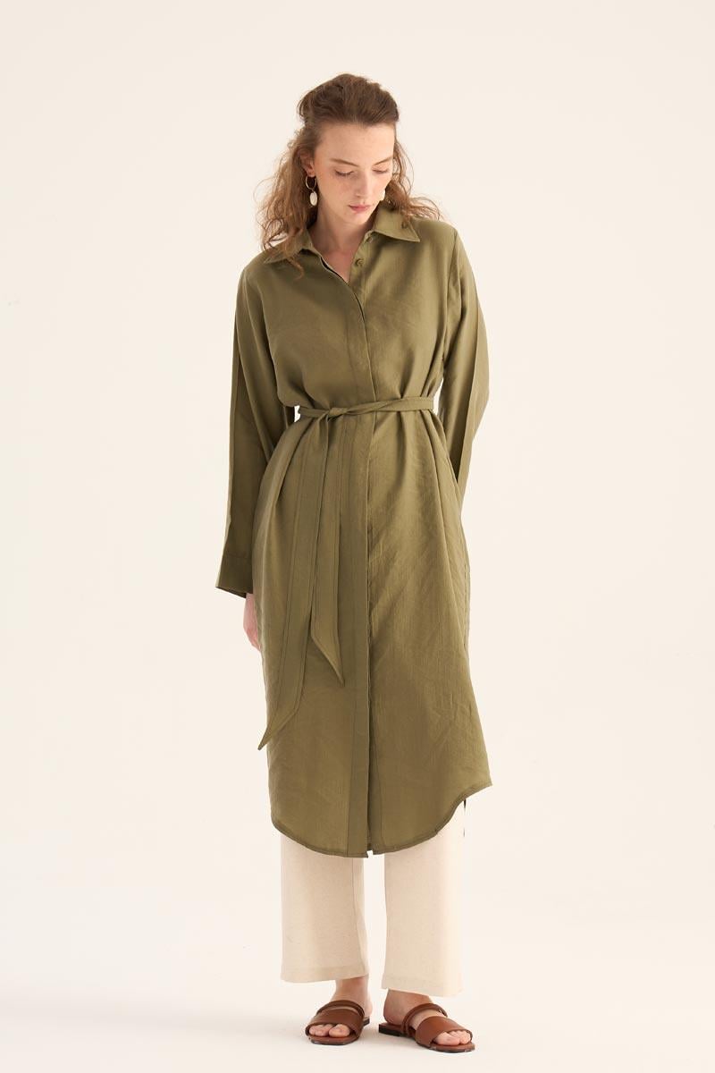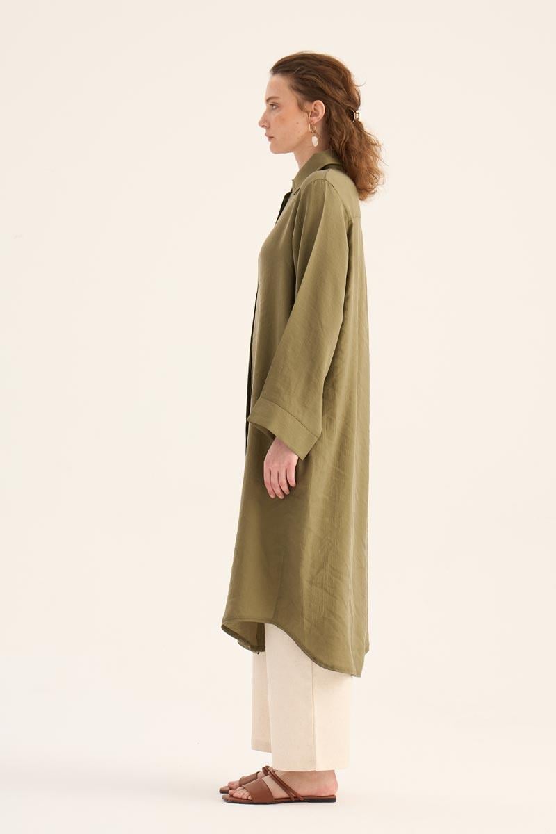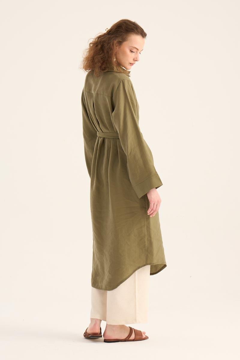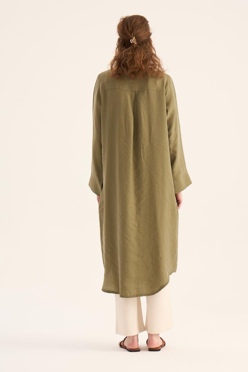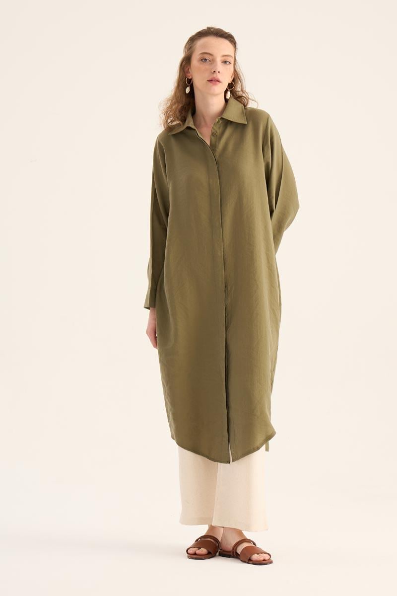 يقدم هذا التونيك الطويل باللون الخاكي مظهرًا طبيعيًا ومنعشًا، مما يجعله من القطع الخفيفة والأنيقة لموسم الصيف. مصنوع من خليط 88% تينسل و12% بيس، حيث يوفر قماشه راحة طوال اليوم بفضل نسيجه الناعم وبنائه القابل للتنفس. التصميم البسيط، وتفاصيل الأزرار المخفية، والحاشية المنحنية الأنيقة عند التنورة تخلق مظهرًا عصريًا.