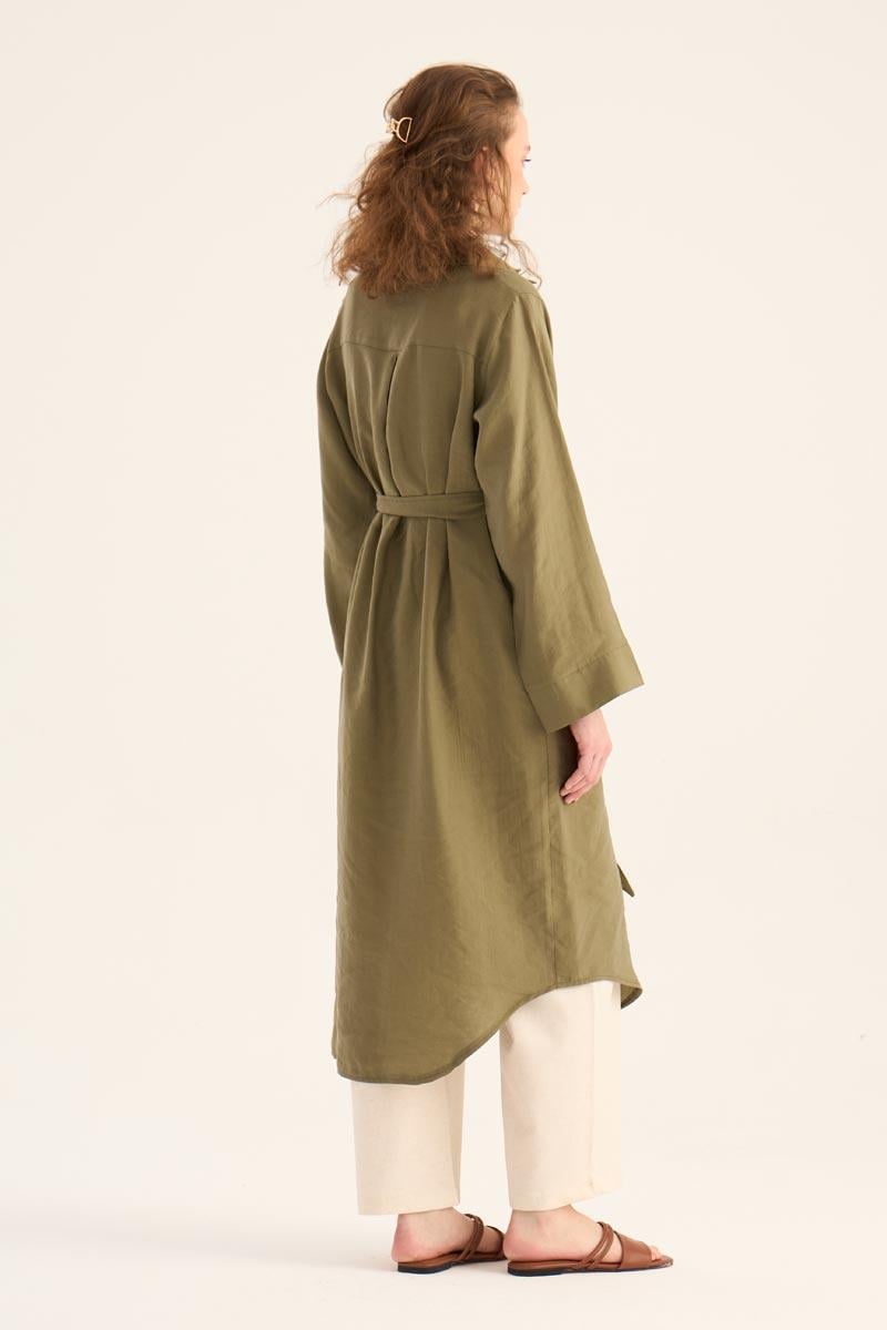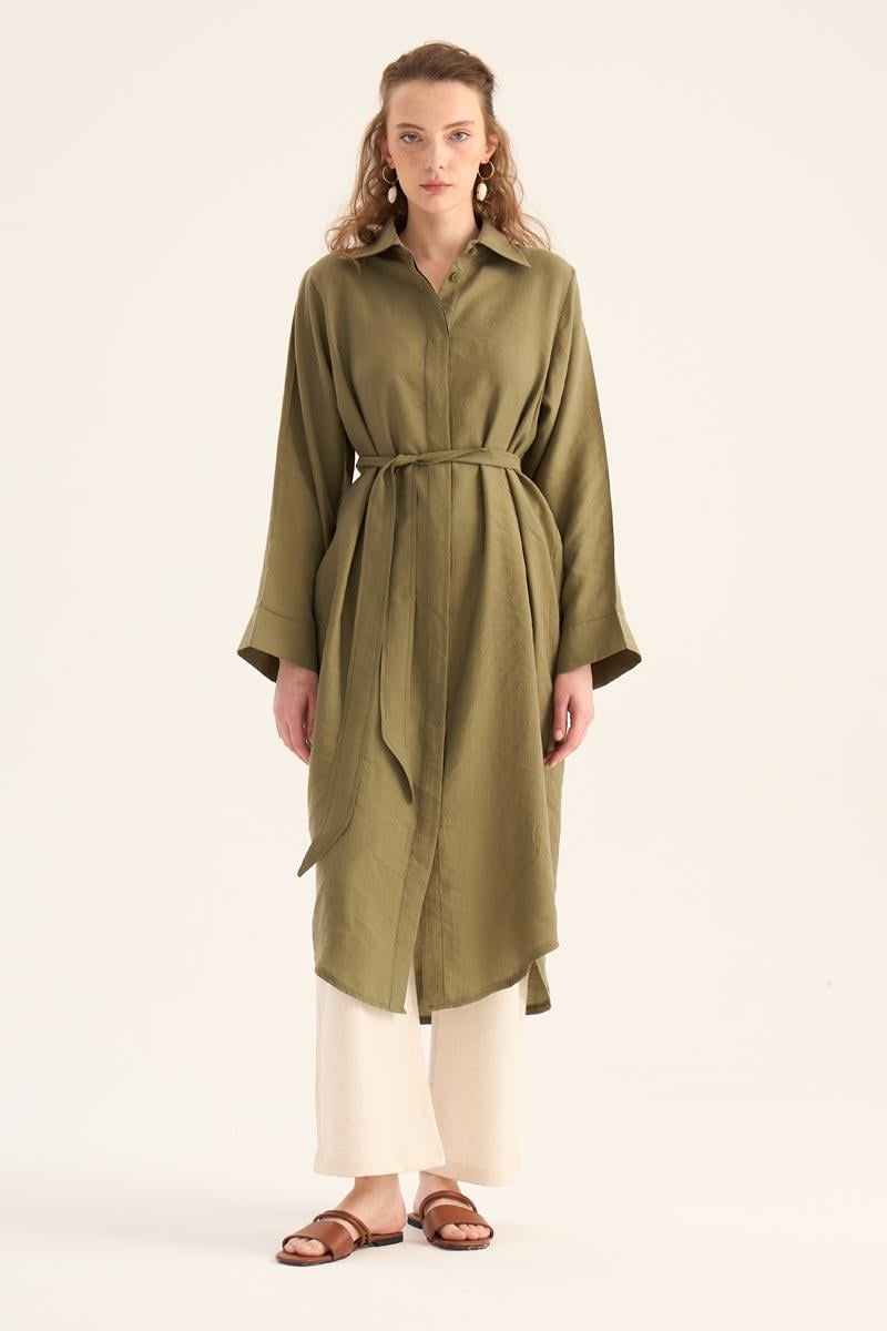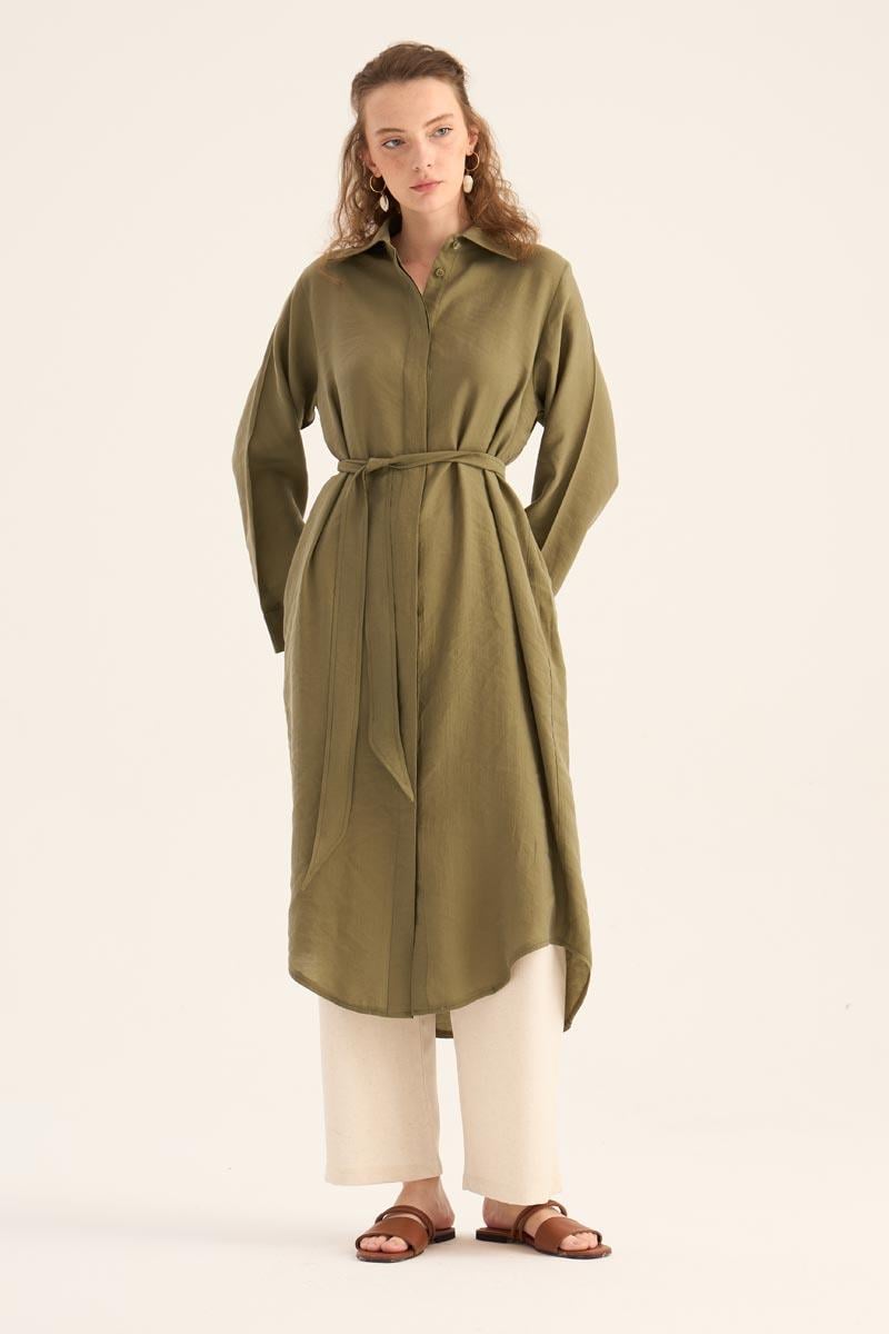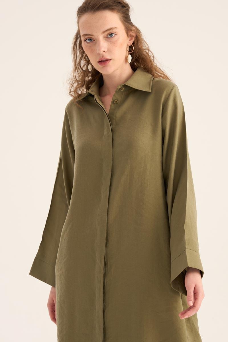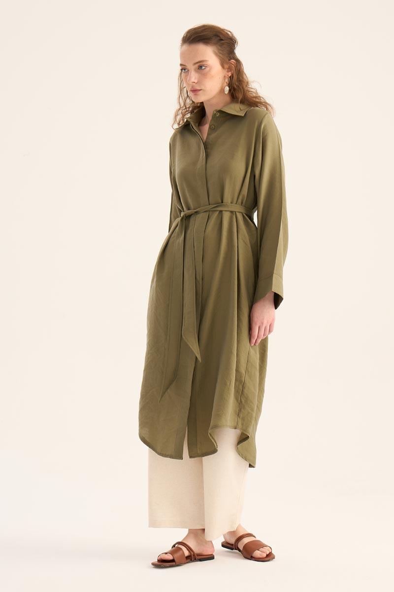 يقدم هذا التونيك الطويل باللون الخاكي مظهرًا طبيعيًا ومنعشًا، مما يجعله من القطع الخفيفة والأنيقة لموسم الصيف. مصنوع من خليط 88% تينسل و12% بيس، حيث يوفر قماشه راحة طوال اليوم بفضل نسيجه الناعم وبنائه القابل للتنفس. التصميم البسيط، وتفاصيل الأزرار المخفية، والحاشية المنحنية الأنيقة عند التنورة تخلق مظهرًا عصريًا.