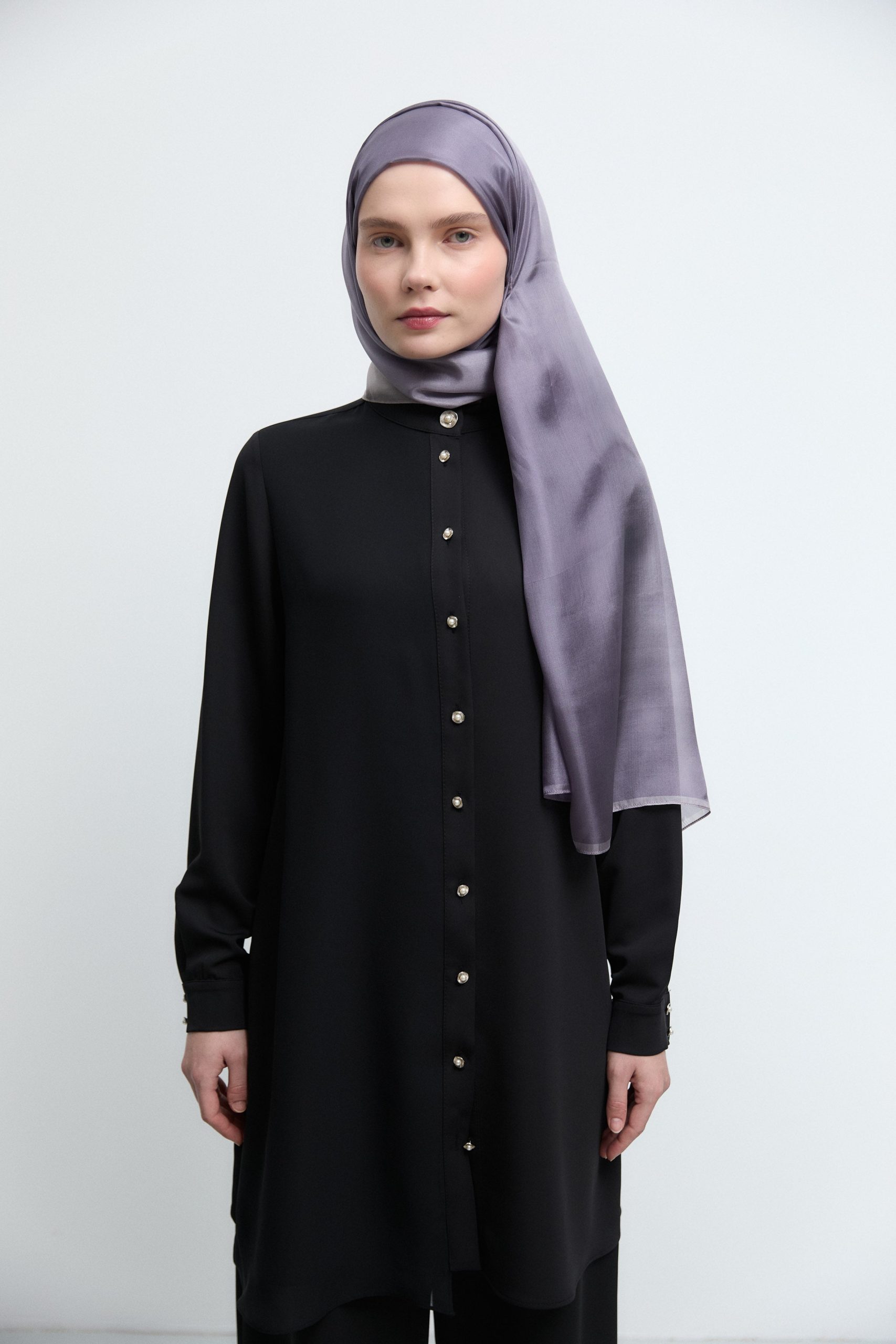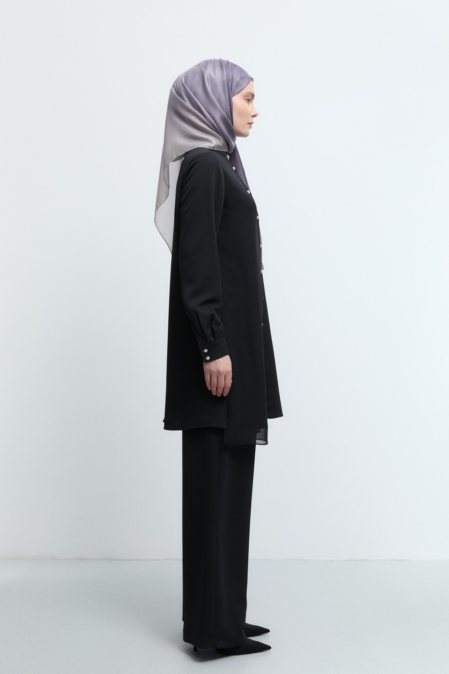 تونيك مودال أسود بأزرار من عرق اللؤلؤ هو قطعة أساسية لموسم الصيف، يتميز بتصميم عصيري وقصة مريحة. مصنوع من مزيج 65% فيسكوز، 28% نايلون، و7% ليوسيل، حيث يقدم قوامه الناعم خفة ونفاذية للهواء لراحة طوال اليوم. تصميم الياقة المستديرة والأكتاف المنسدلة يخلقان هيئة مريحة، بينما تضيف تفاصيل الشقوق والأزرار من عرق اللؤلؤ لمسة أنيقة لشكل التونيك.
